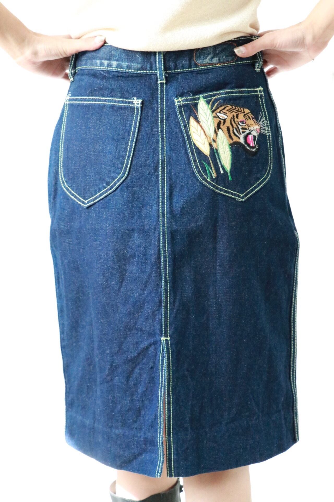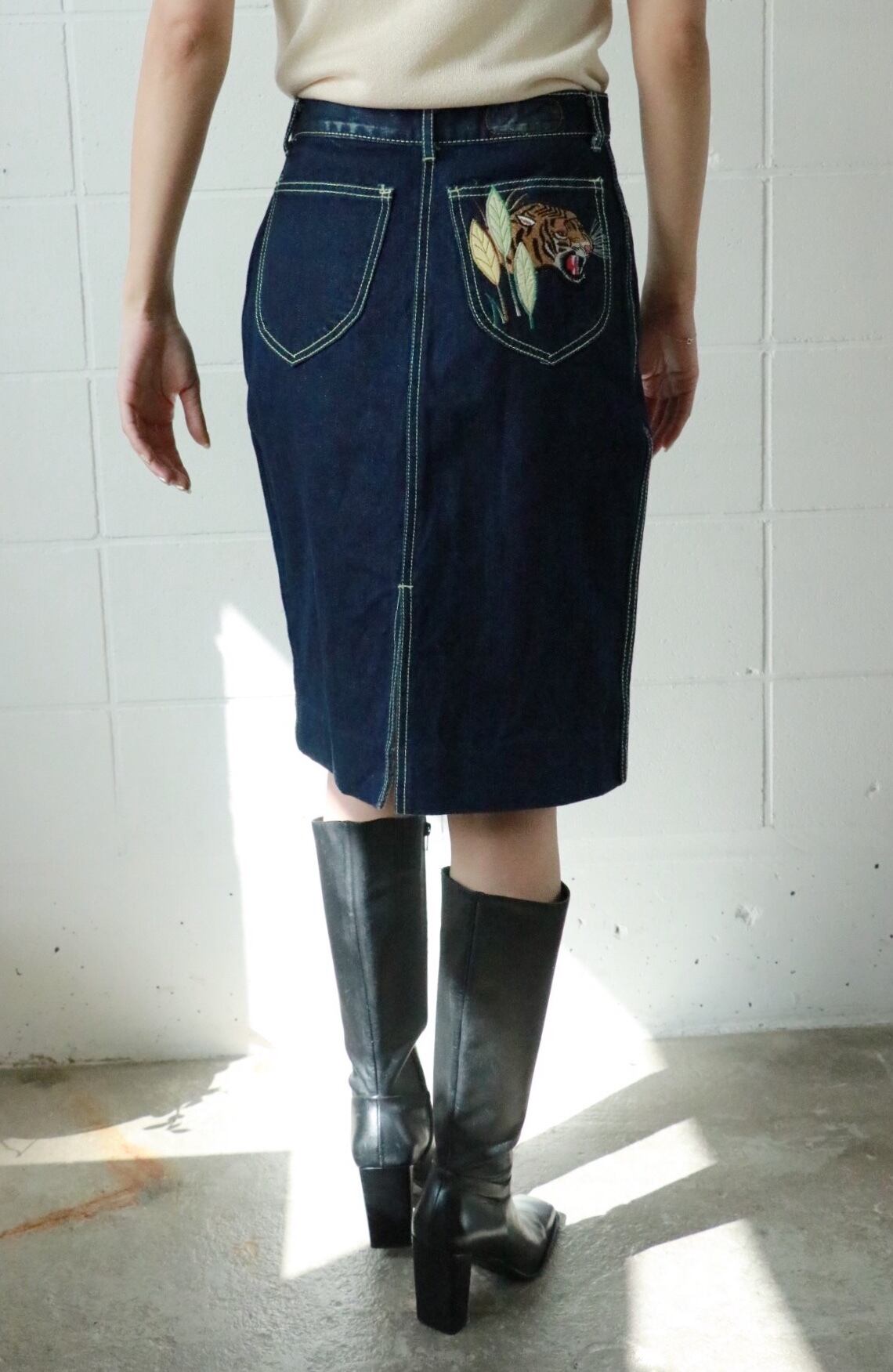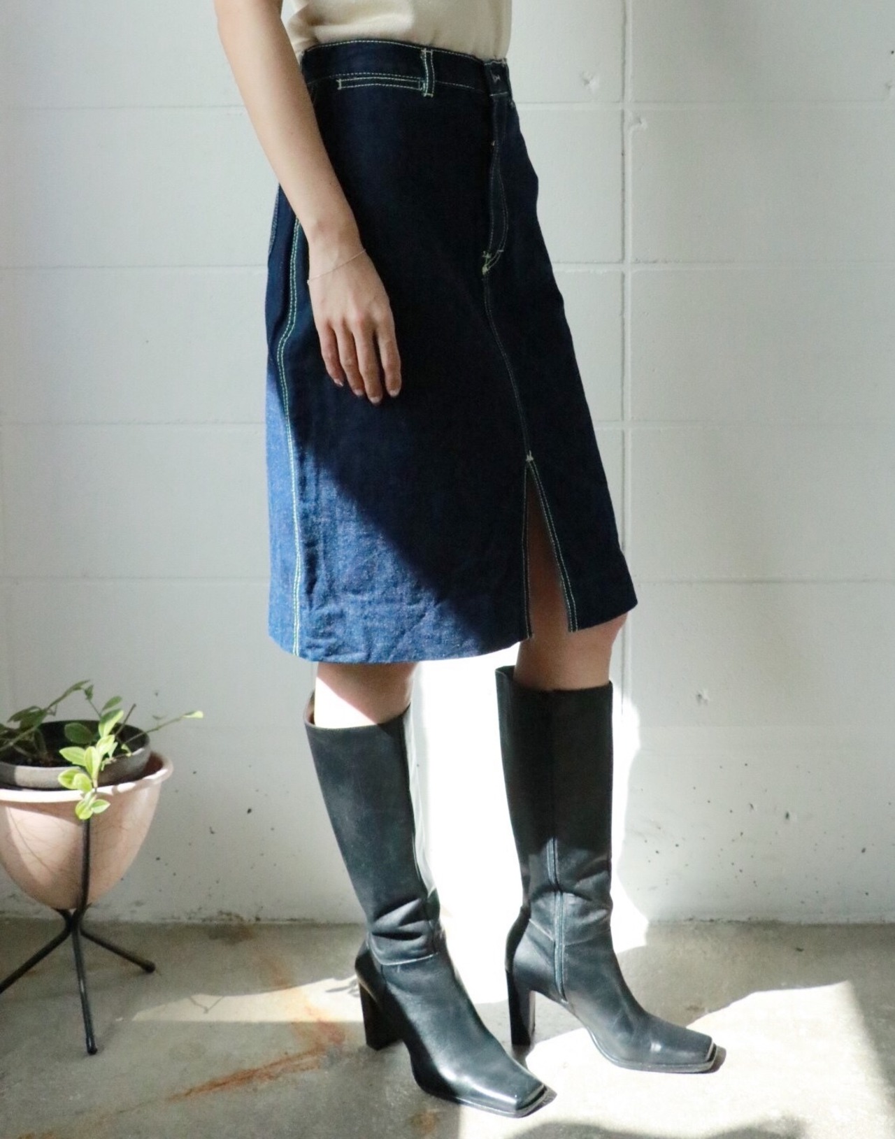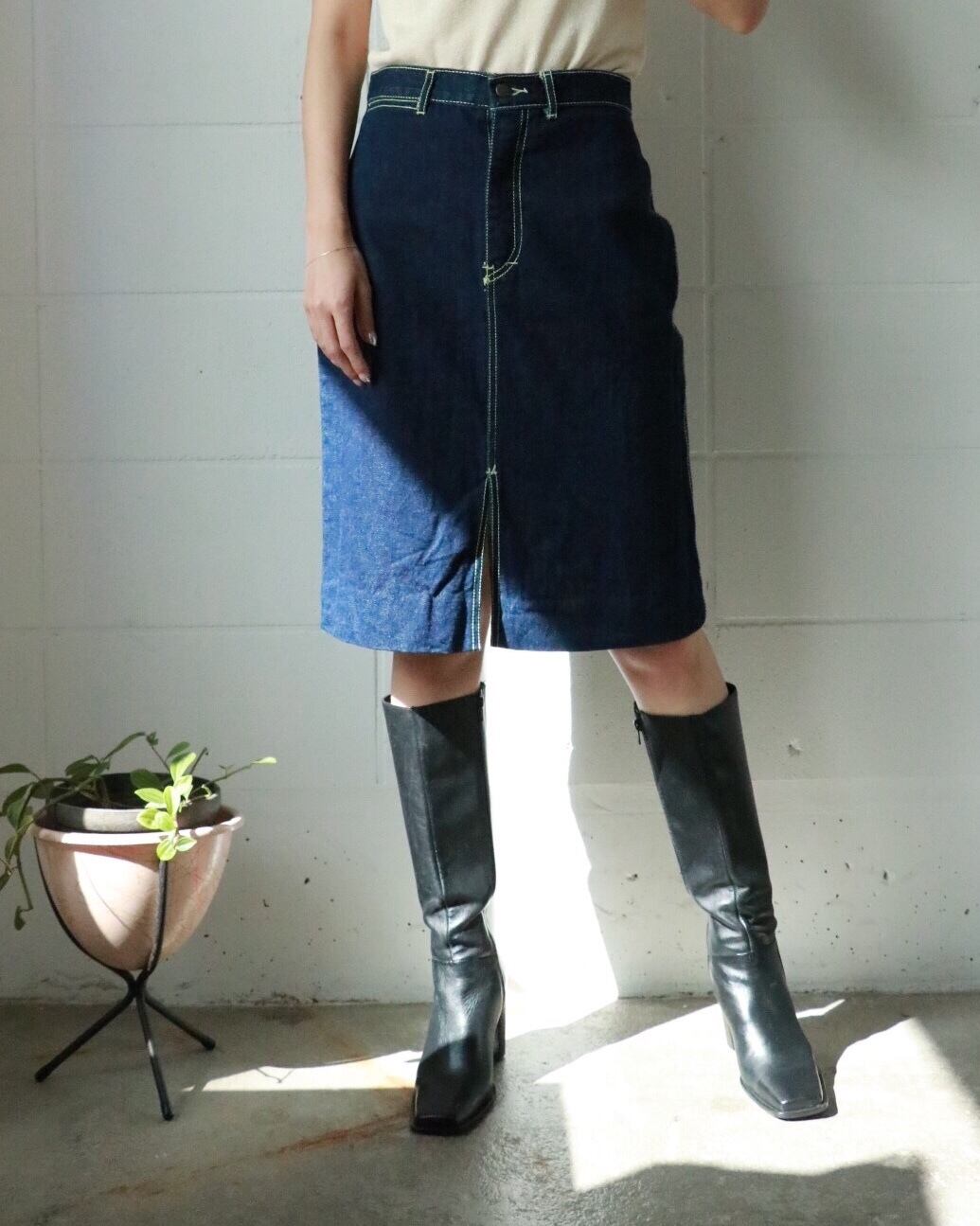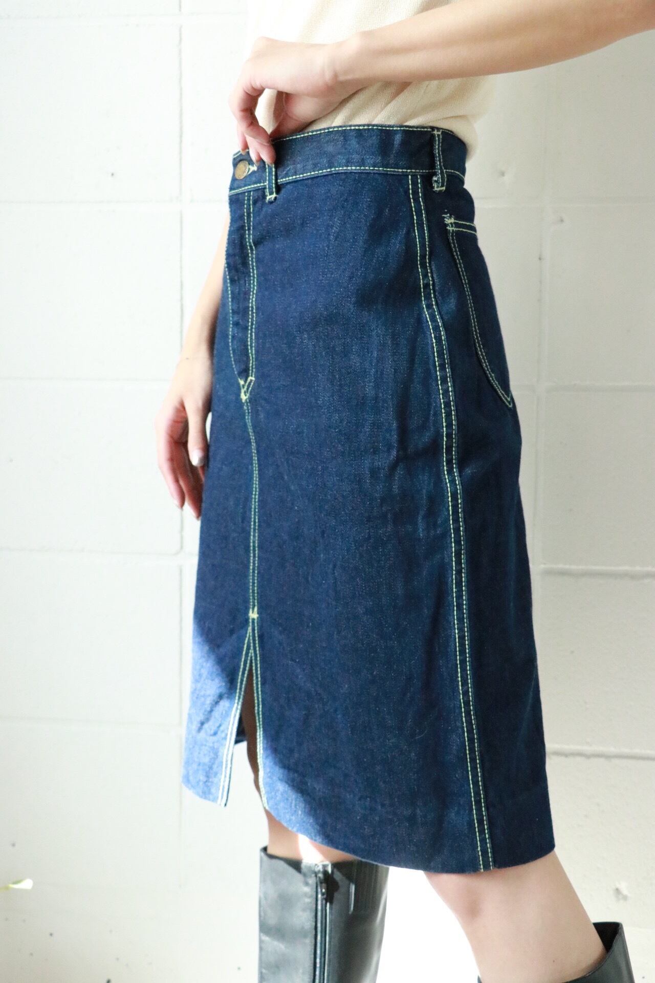 インディゴブルーにホワイトステッチの膝丈デニムスカート
