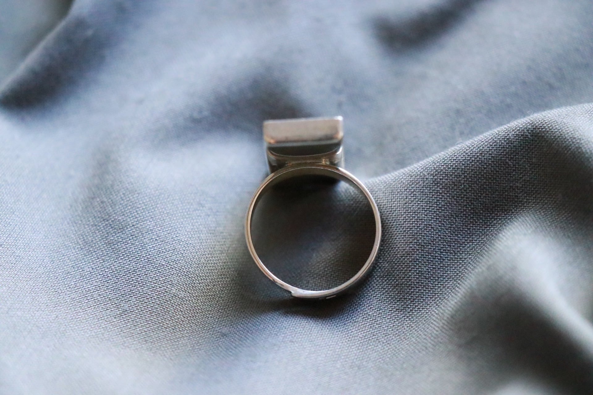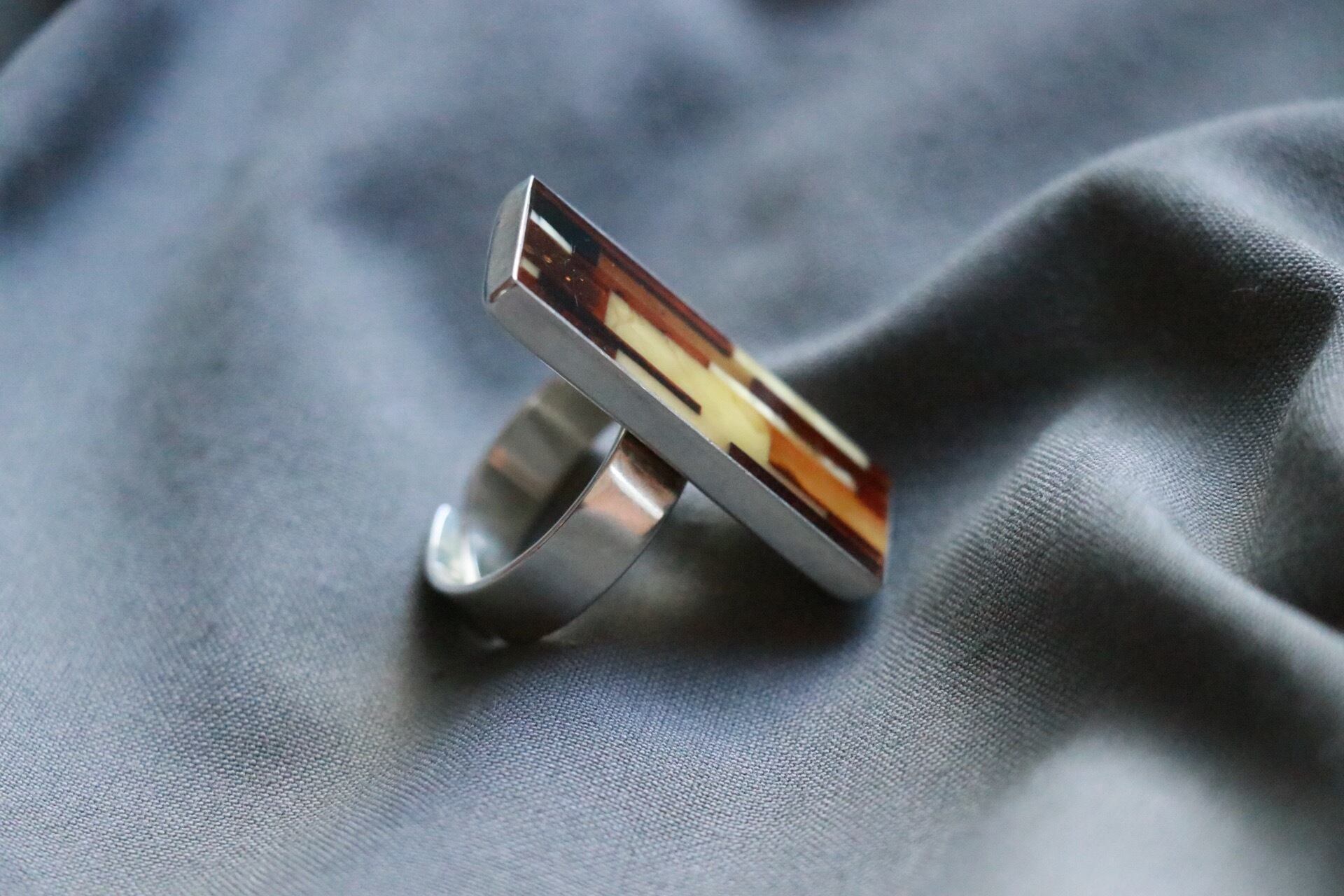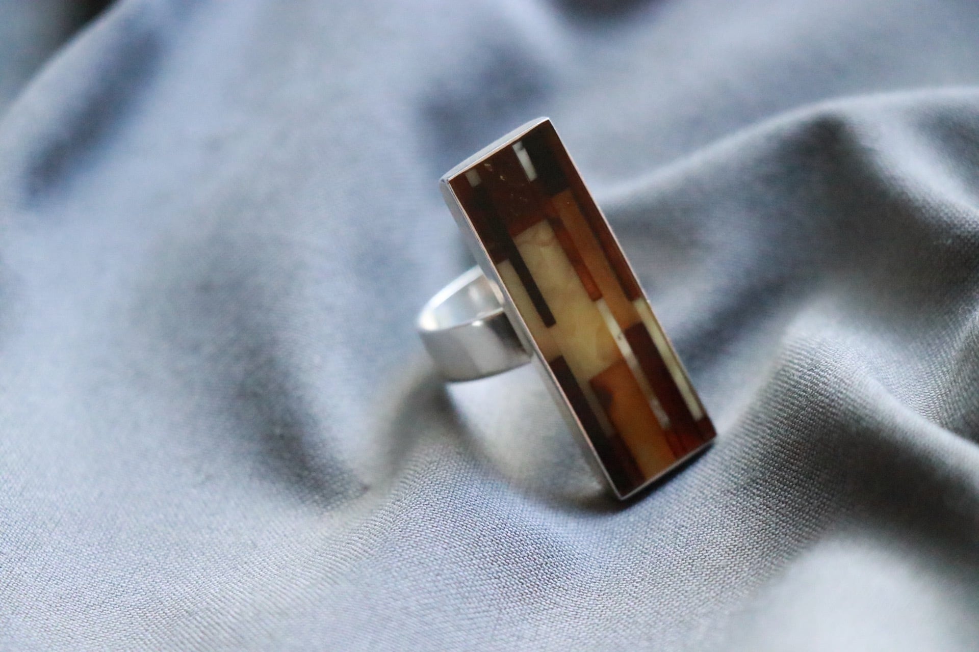 縦長の長方形フォルムとシックなブラウントーンのコンビがモダンな手元を演出するヴィンテージシルバーリングが入荷。