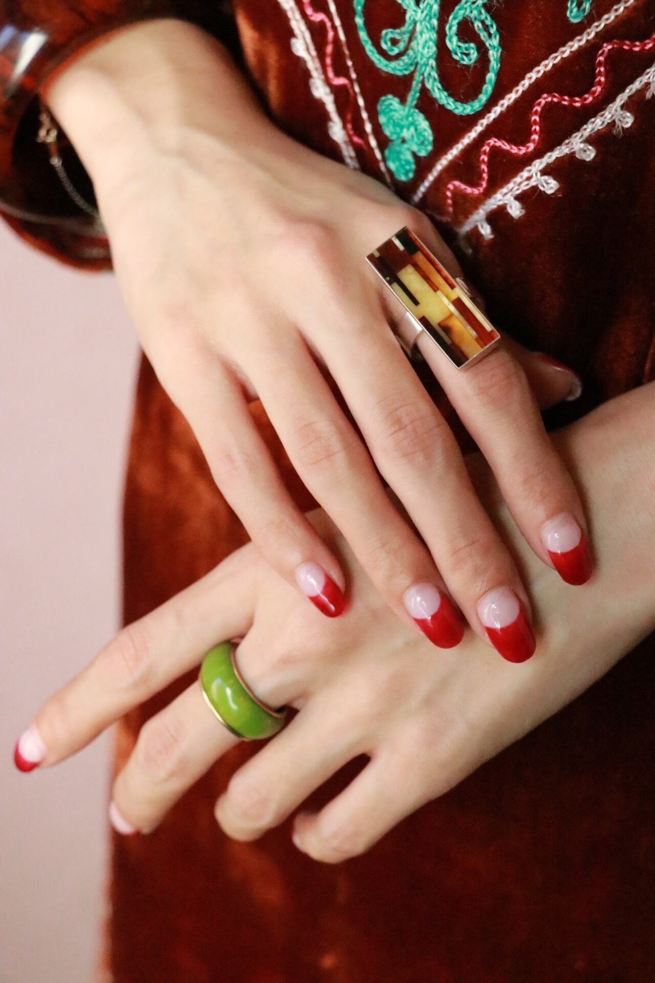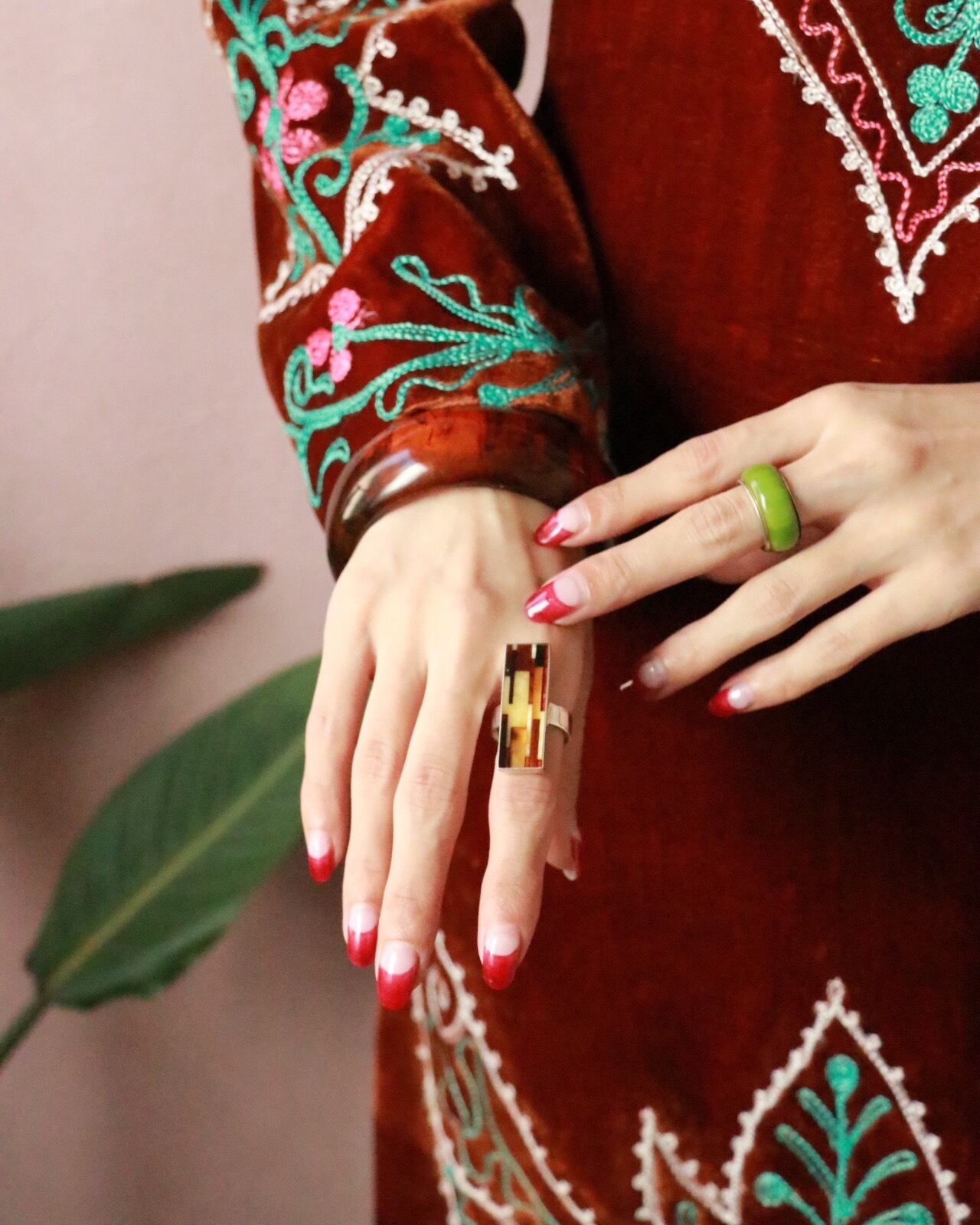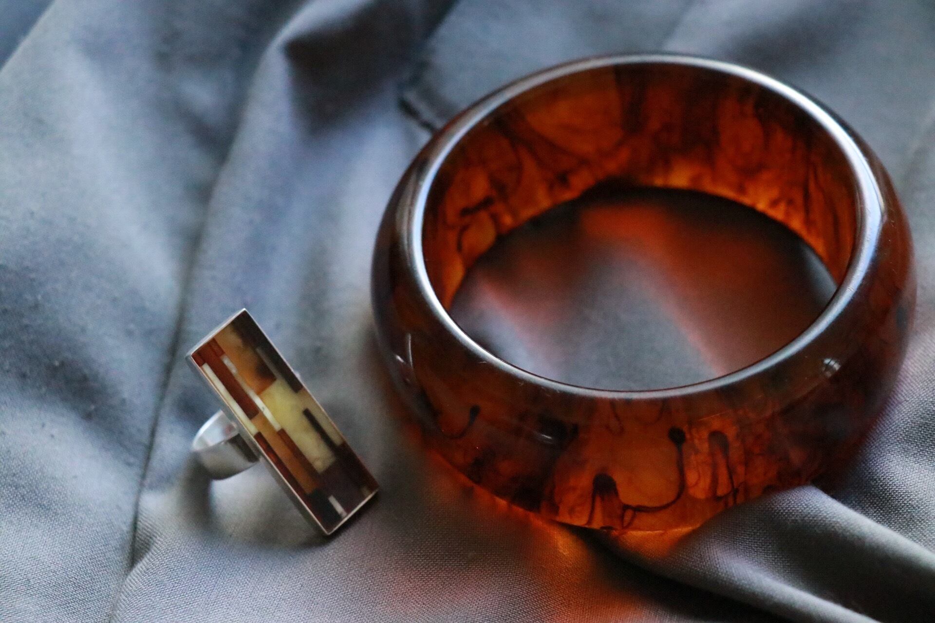縦長の長方形フォルムとシックなブラウントーンのコンビがモダンな手元を演出するヴィンテージシルバーリングが入荷。