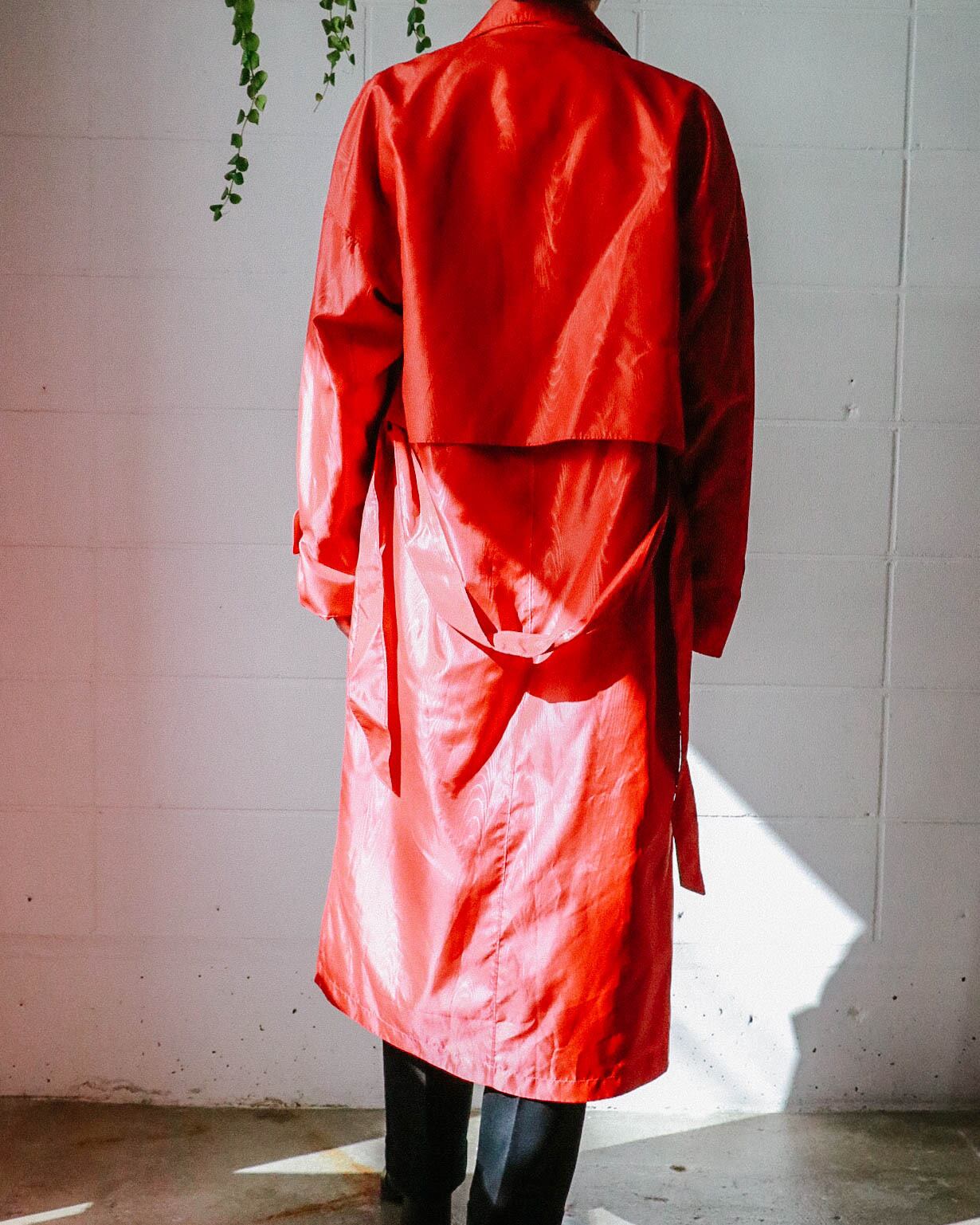 ゆったりオーバーサイズのしゃかっとしたトレンチコート。珍しいコーラルレッドは人目をひく魅惑的な色です。普段のコーディネートにさらっと羽織ってフレッシュな気持ちに。