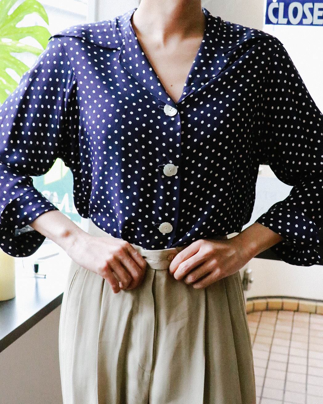 80年代のオープンカラーネイビードットブラウスが入荷。