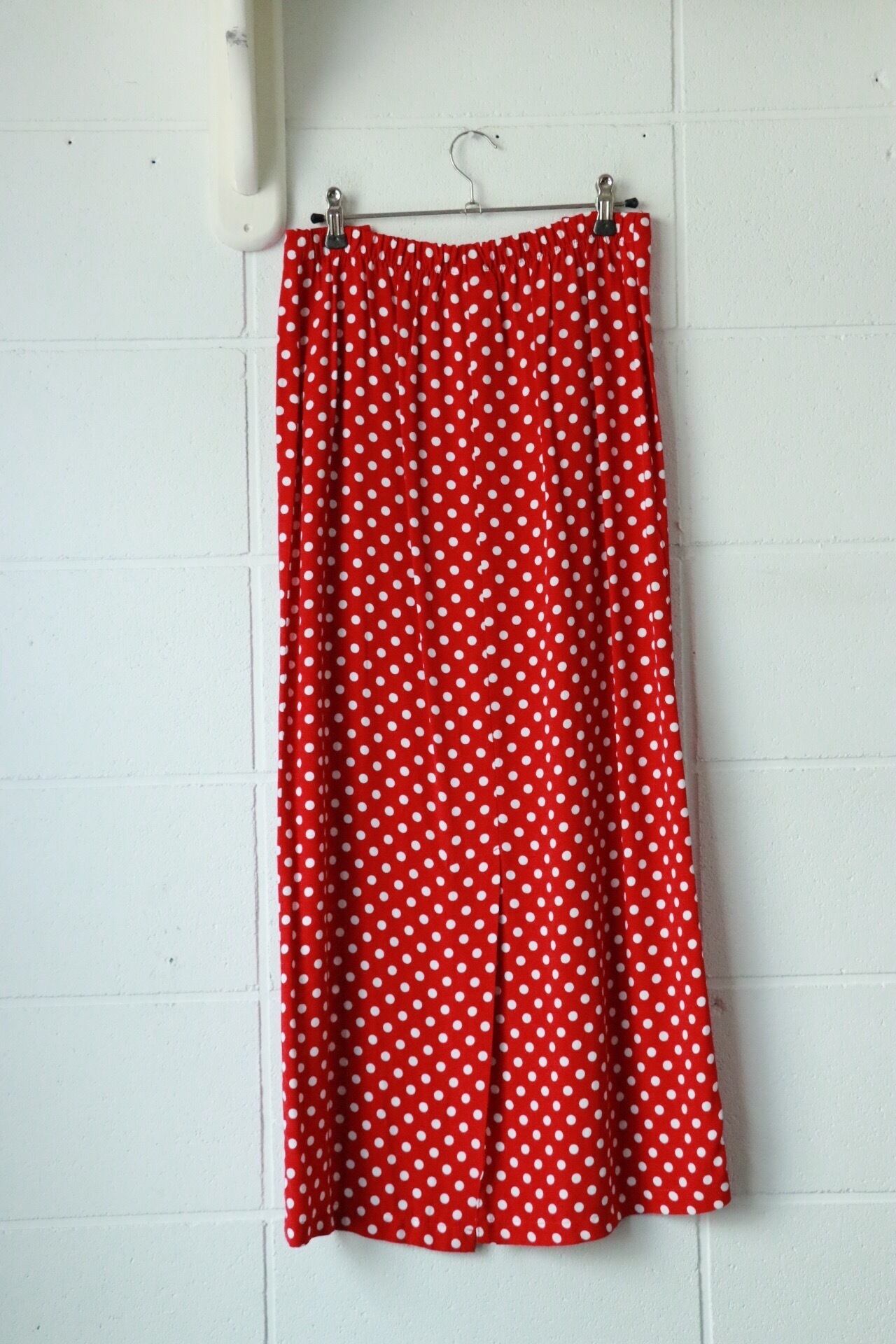 子どもっぽくなりがちなドット柄も、マキシ丈にバックスリットという要素が入り大人顔に。