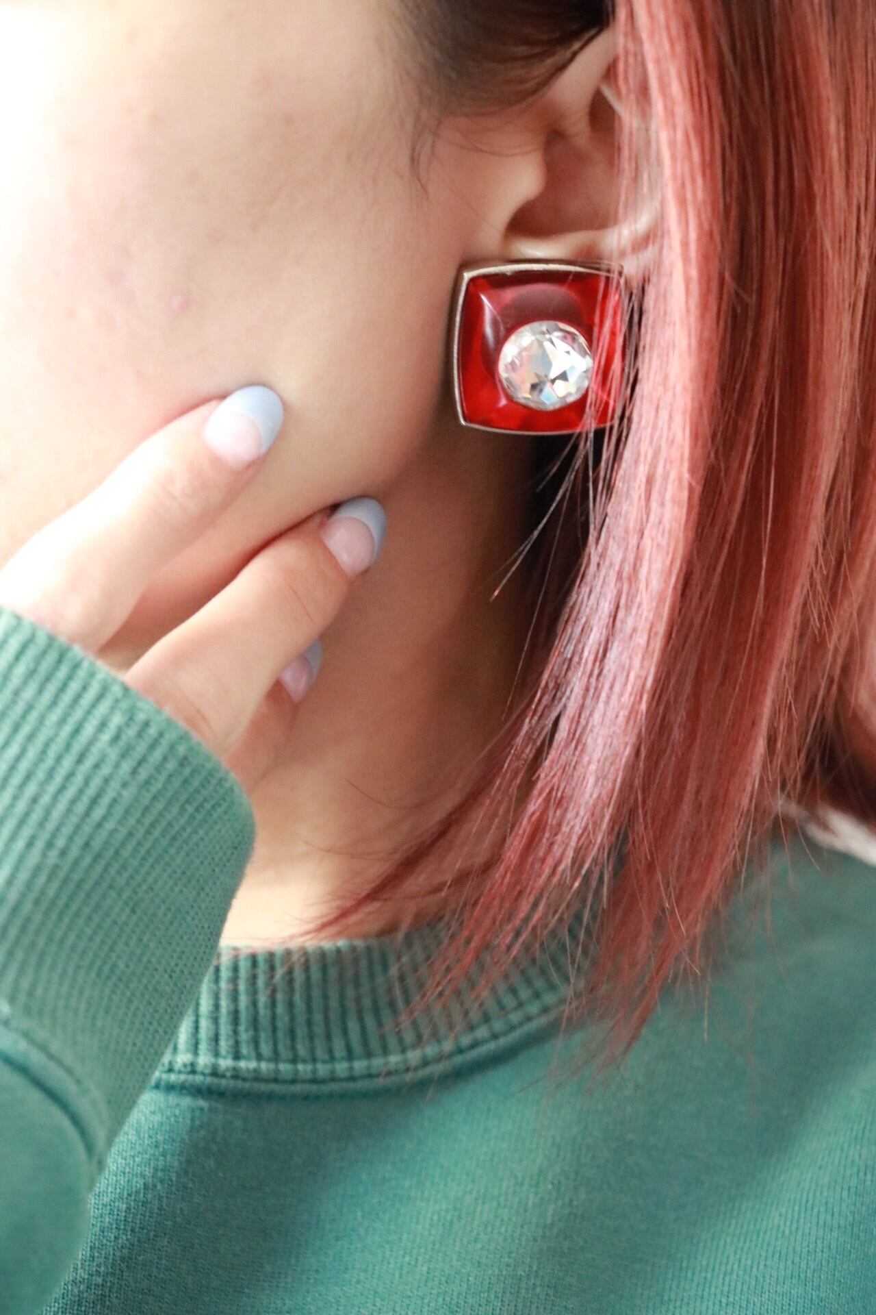 キャンディーのようなスクエア型の大きなレッドビジューの真ん中に付いた大きなラインストーンが立体的なフォルムでラグジュアリーな仕上がりの一点。大きさの割には実はとっても軽量!