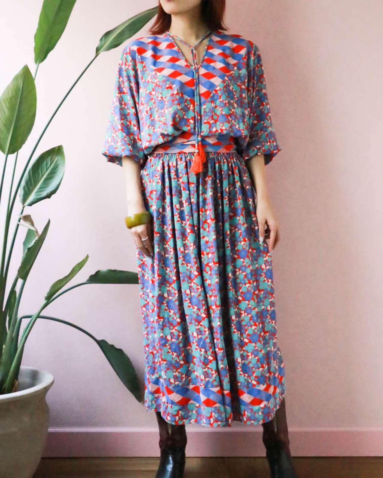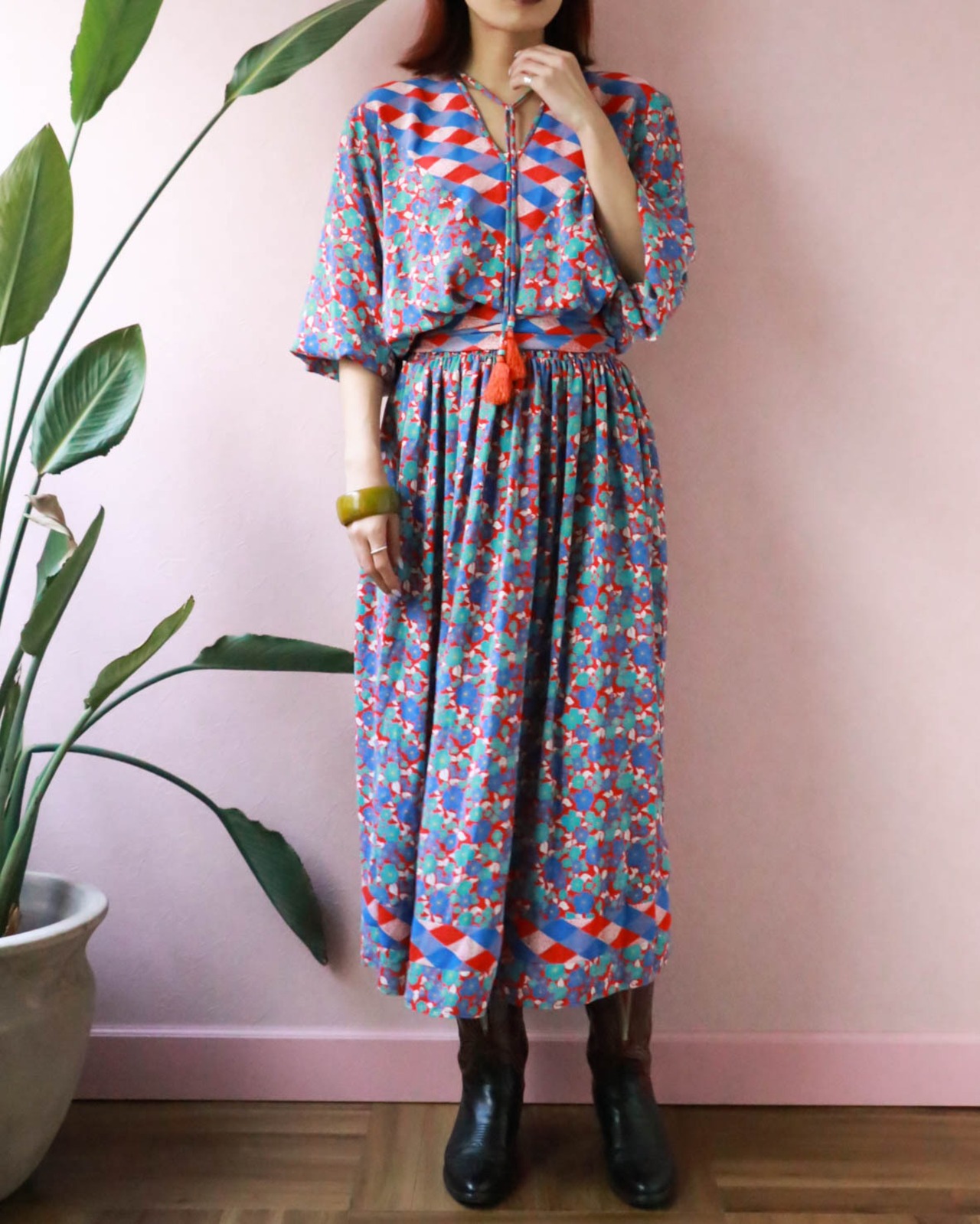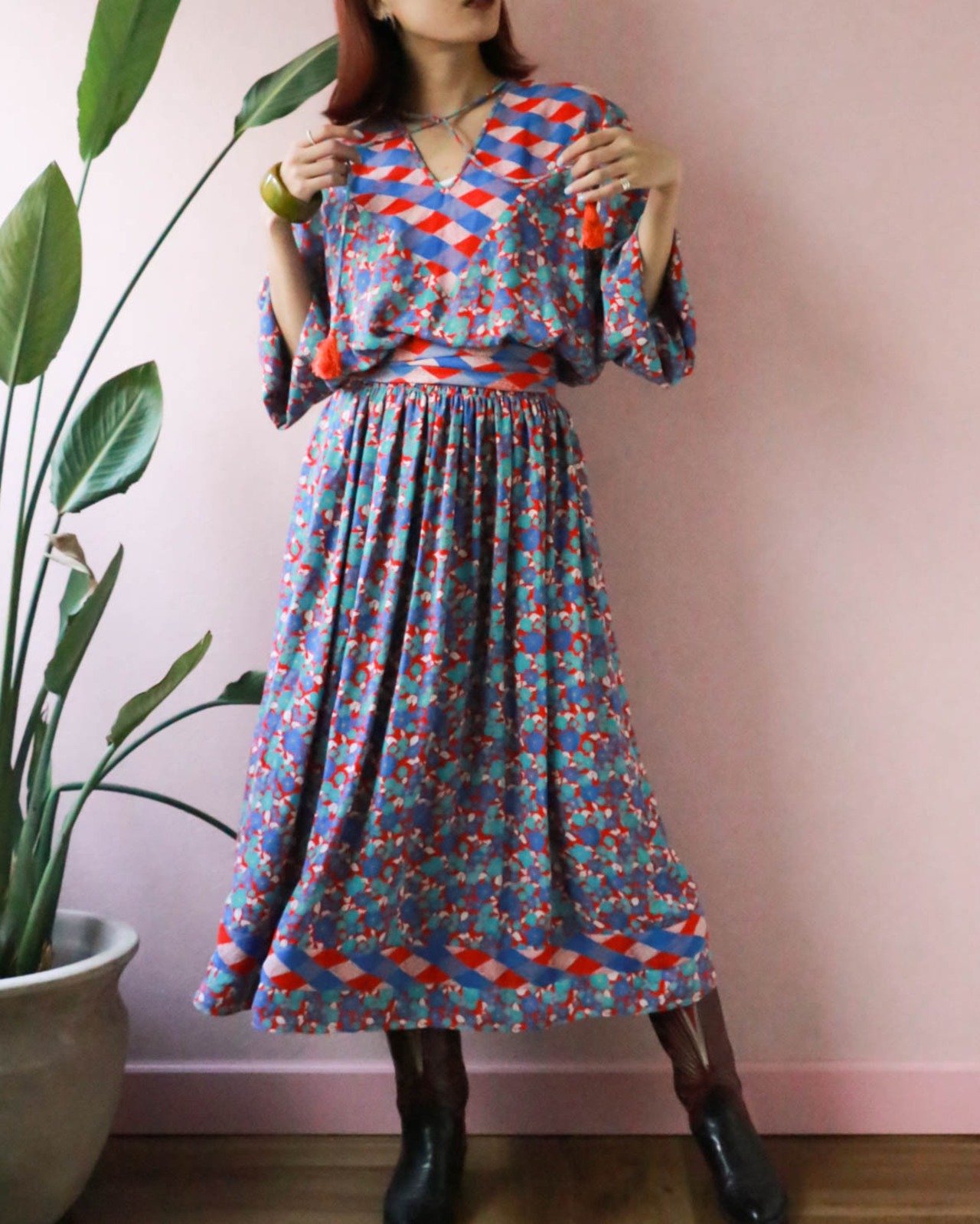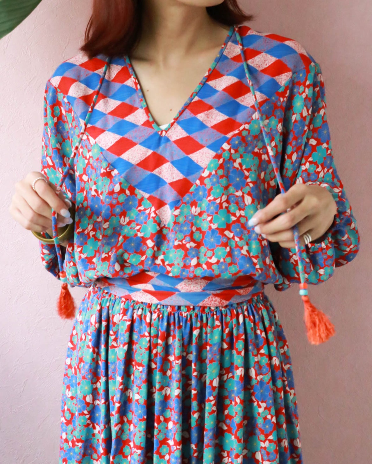 綺麗にカッティングされたVネックエリアにはひし形がちりばめられ、タッセルタイにふわっと膨らむボリュームあるスリーブ、歩くたびに優雅に踊るフレアスカートと細部まで計算されたデザインに思わずうっとり。