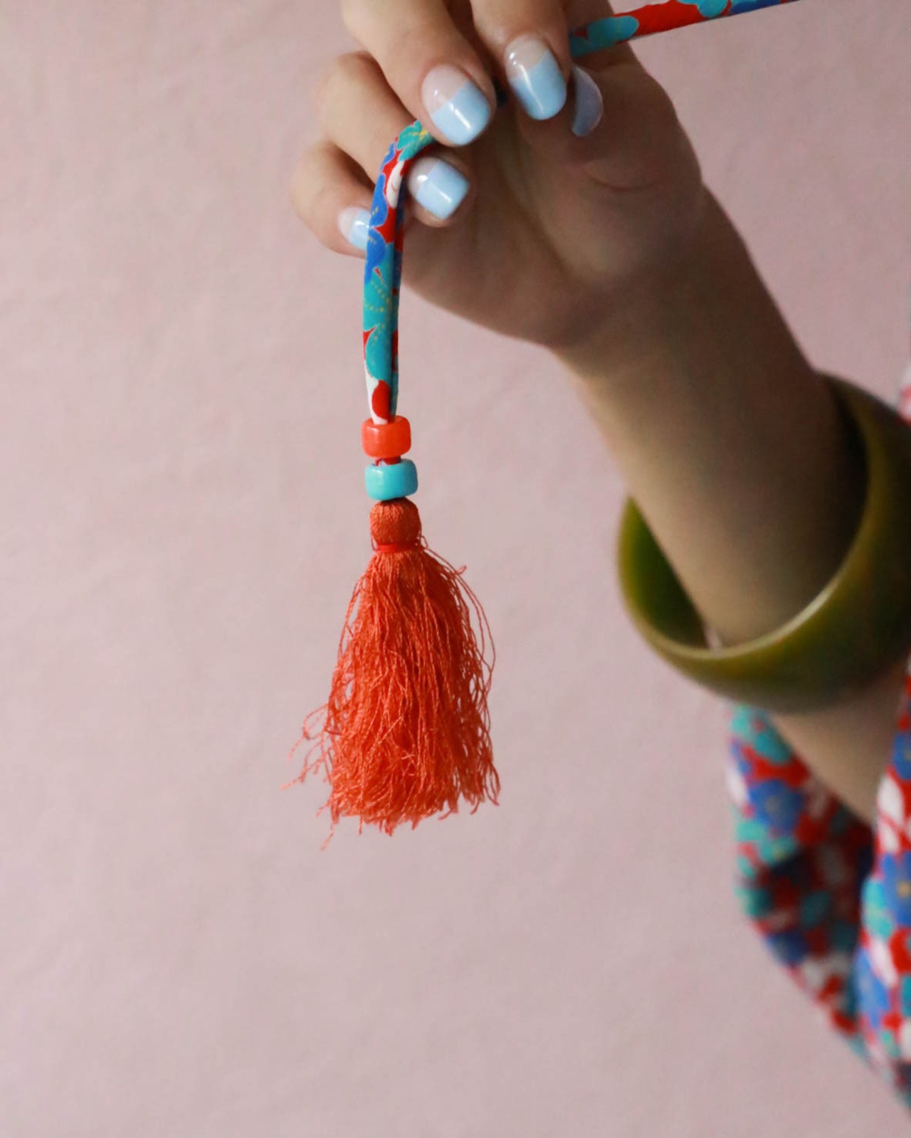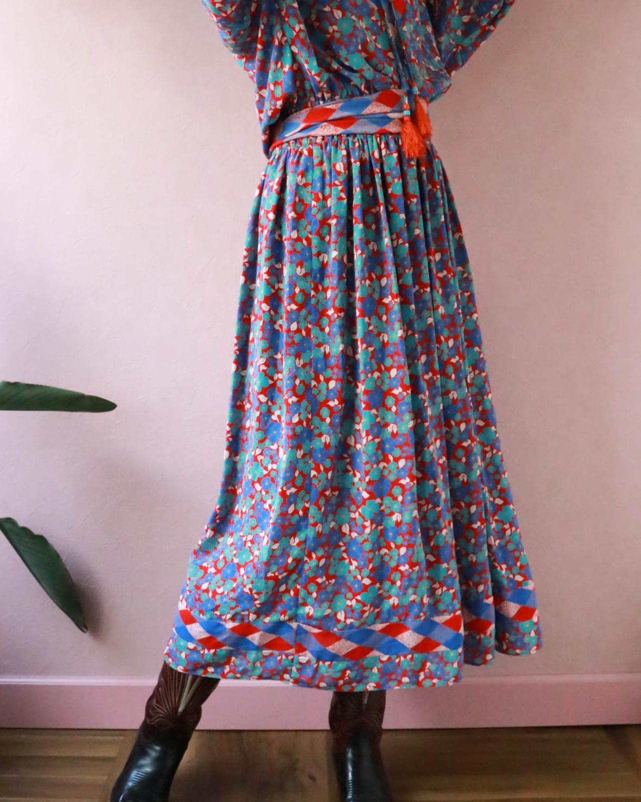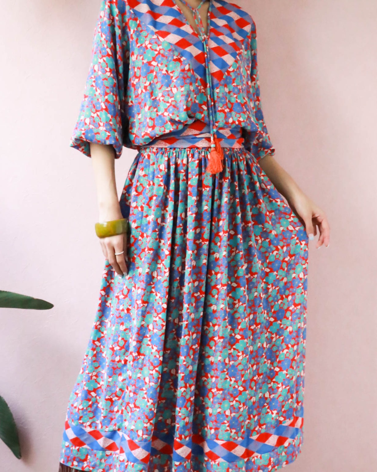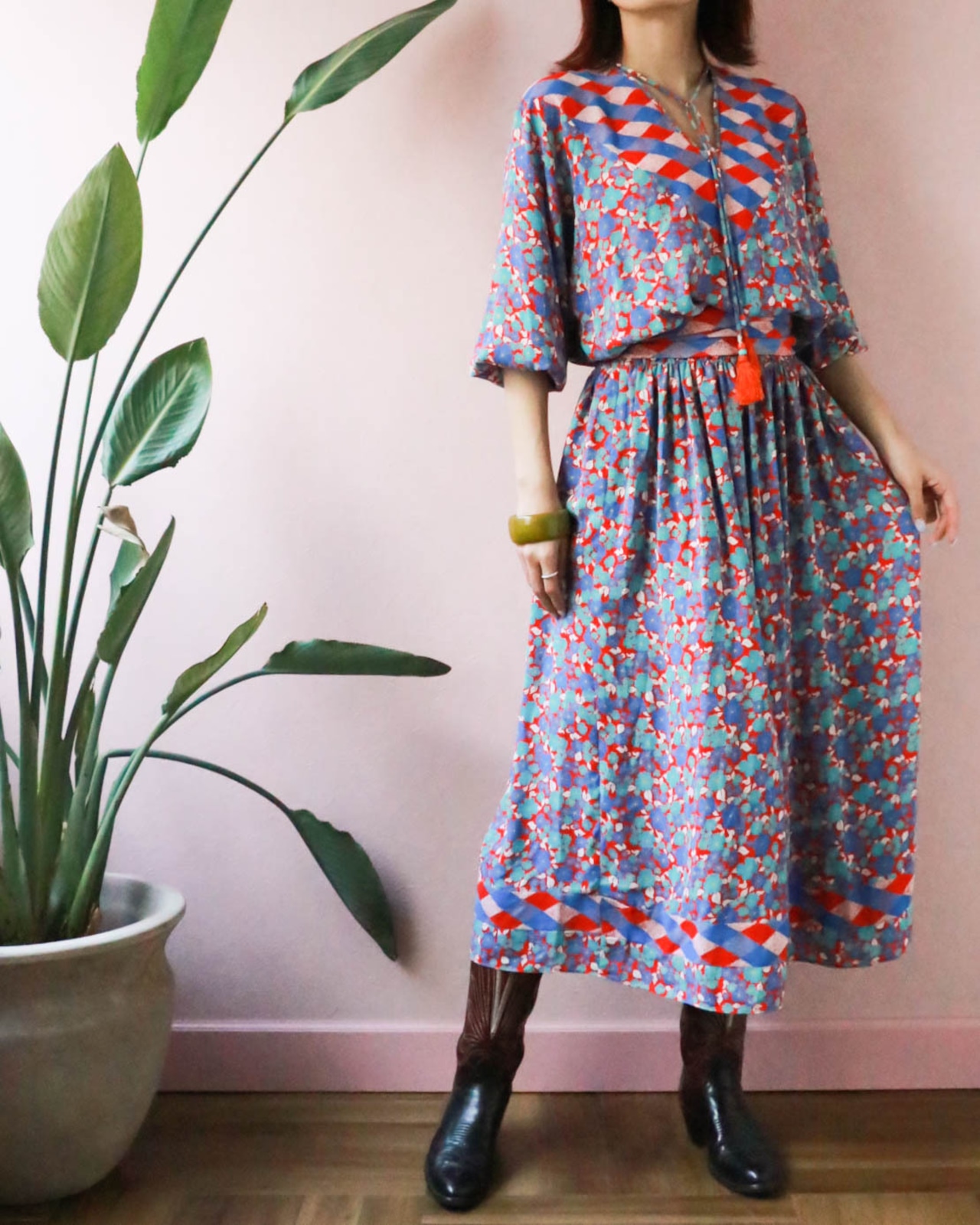 綺麗にカッティングされたVネックエリアにはひし形がちりばめられ、タッセルタイにふわっと膨らむボリュームあるスリーブ、歩くたびに優雅に踊るフレアスカートと細部まで計算されたデザインに思わずうっとり。