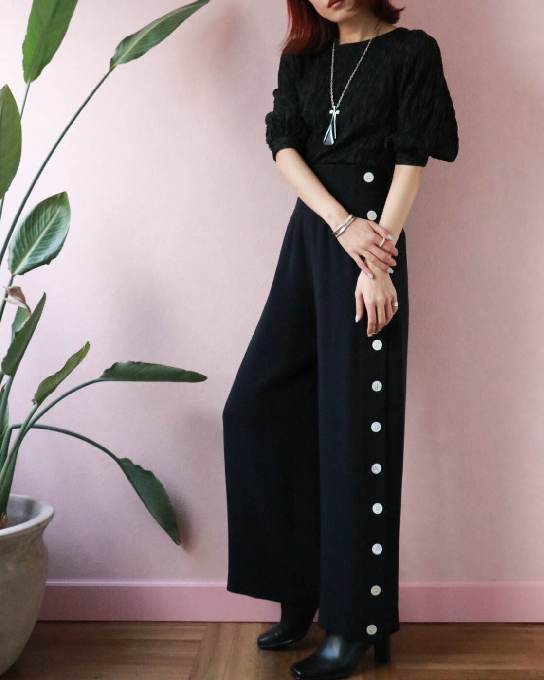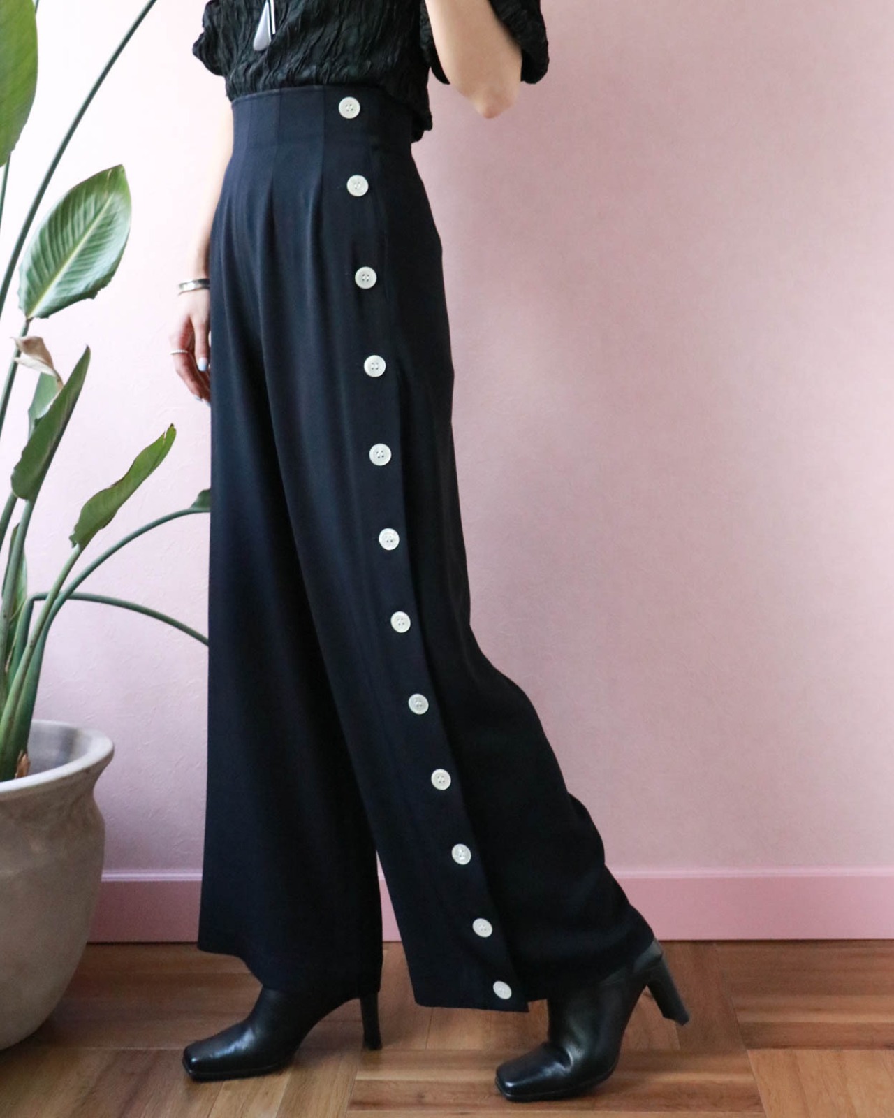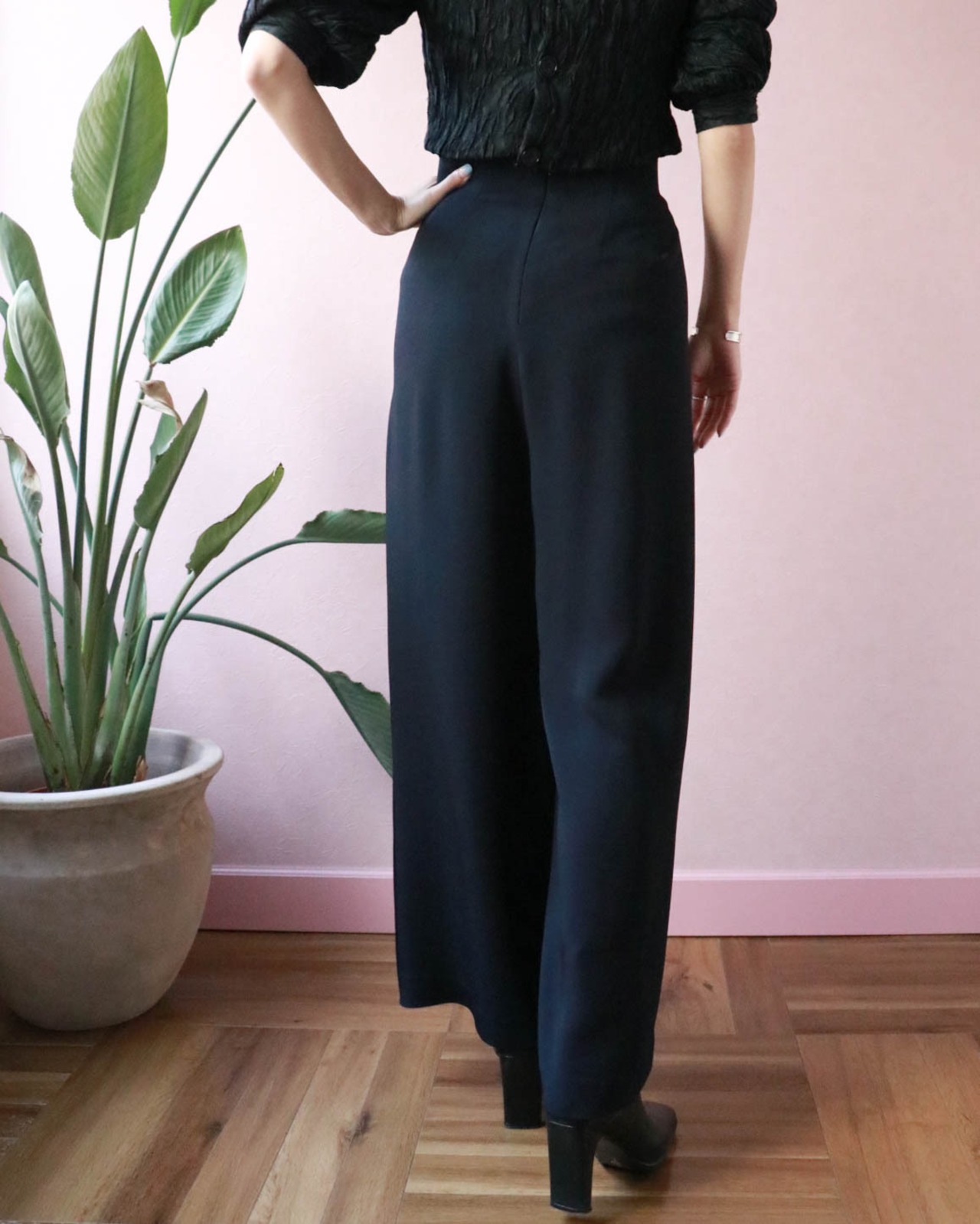 すとんと落ちるワイドパンツはアンクラインのもの。シルエットの美しさのみならず高いウエスト位置からデザインされたボタンがよりきれいなレッグライン効果に。着用者のスタイルをこれでもかという位に良く魅せてくれる秘密はこだわりある形をシンプルにまとめているからこそ。