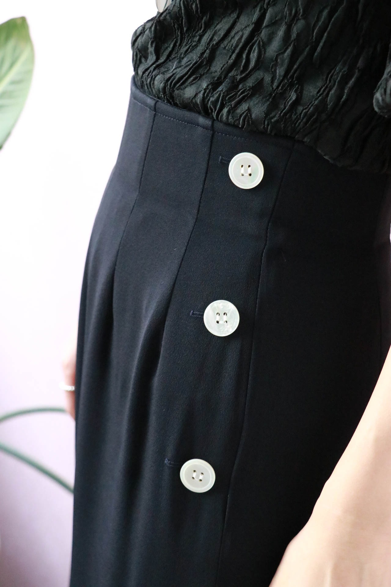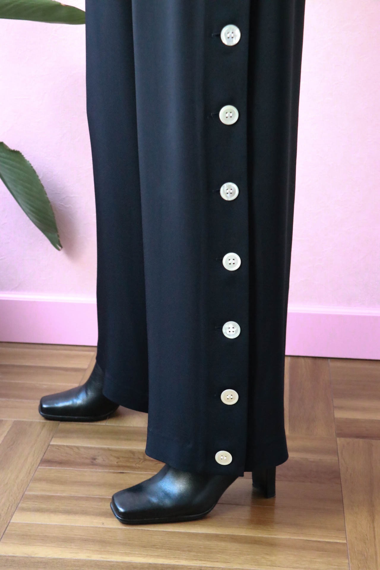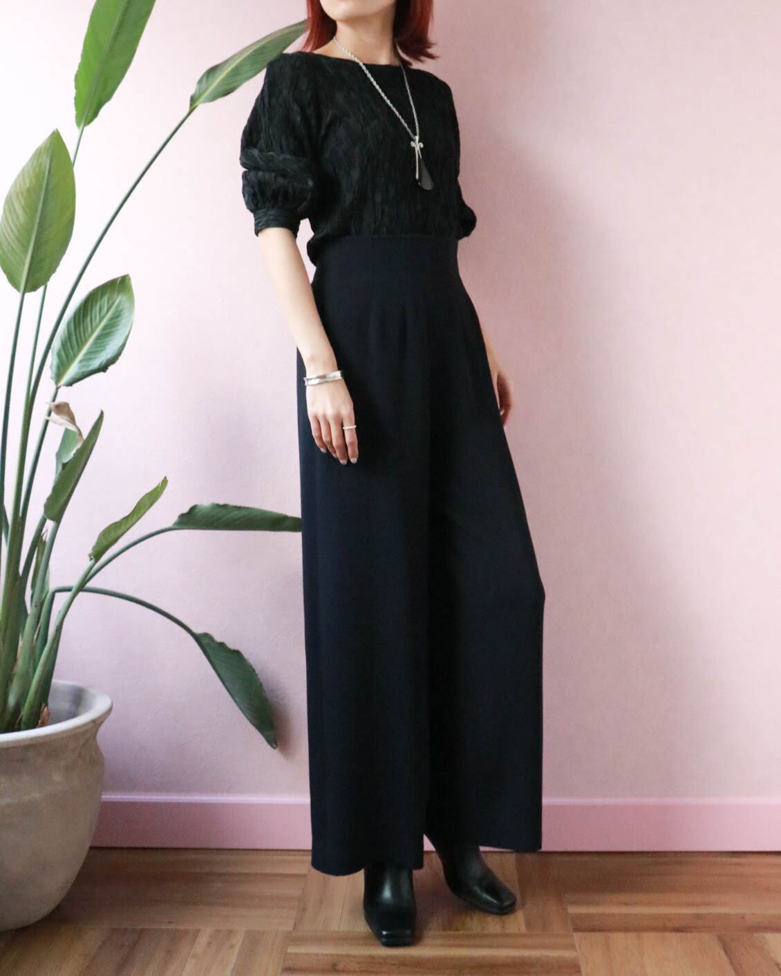 すとんと落ちるワイドパンツはアンクラインのもの。シルエットの美しさのみならず高いウエスト位置からデザインされたボタンがよりきれいなレッグライン効果に。着用者のスタイルをこれでもかという位に良く魅せてくれる秘密はこだわりある形をシンプルにまとめているからこそ。