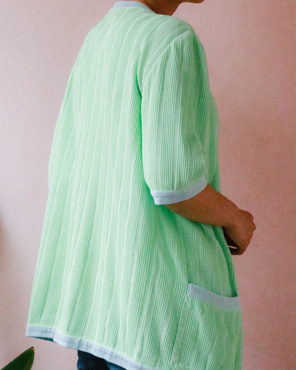 アイスキャンディーのようなミントグリーンと水色のバイカラーが可愛いヴァレンティノのカーディガン。