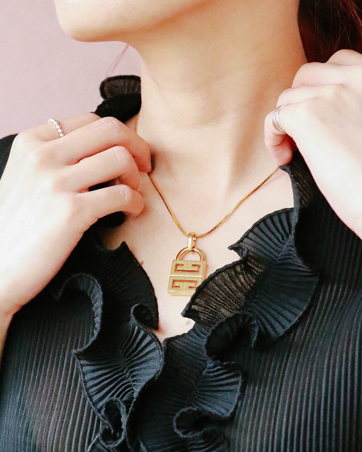 首元をさりげなく彩る程よい大きさのロゴモチーフで、品の良さを感じます。
