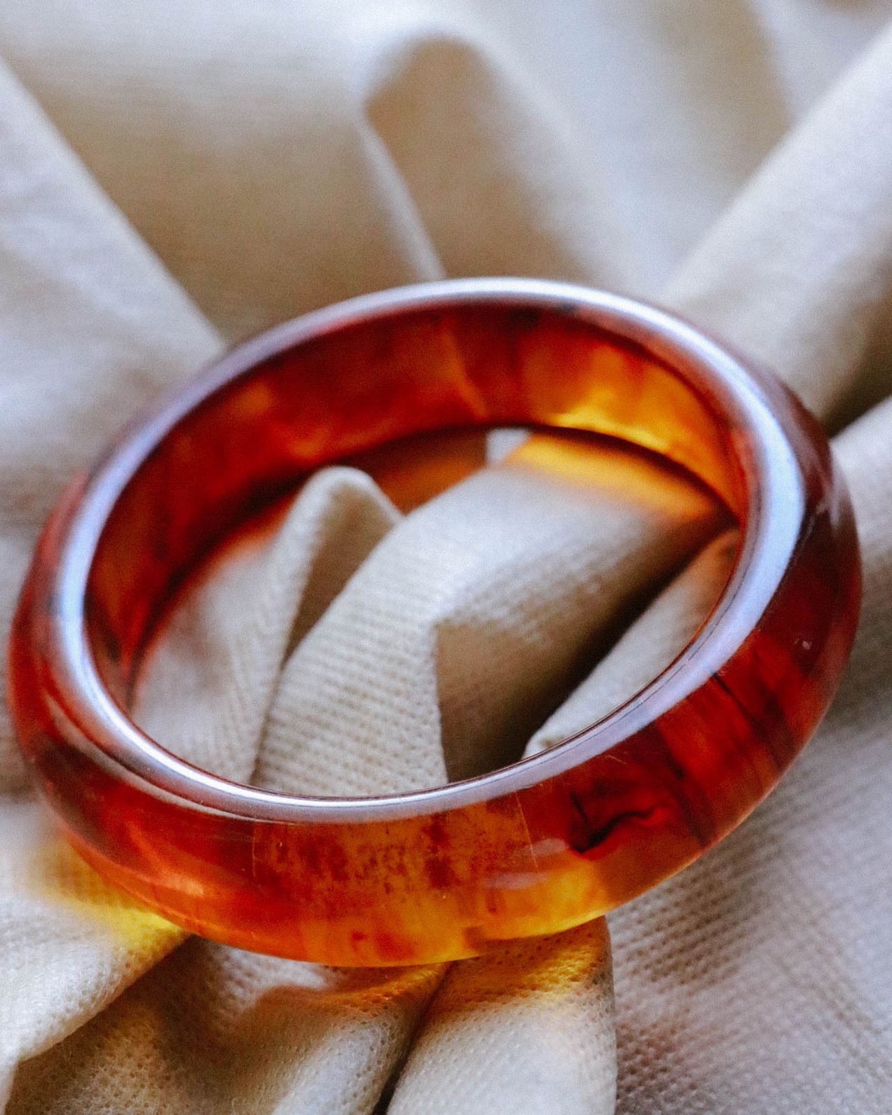 鼈甲飴や琥珀を思わせる透け感が軽やかさをプラスしてくれるプラスチックバングル。