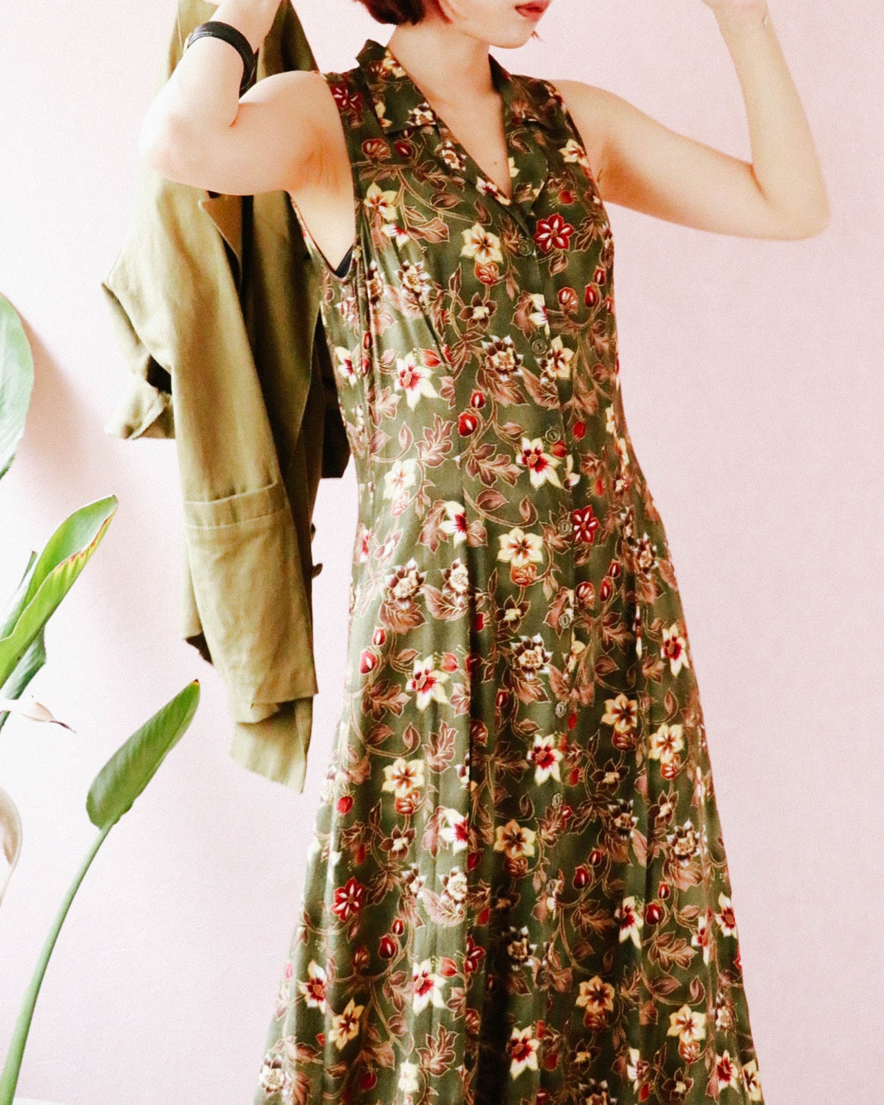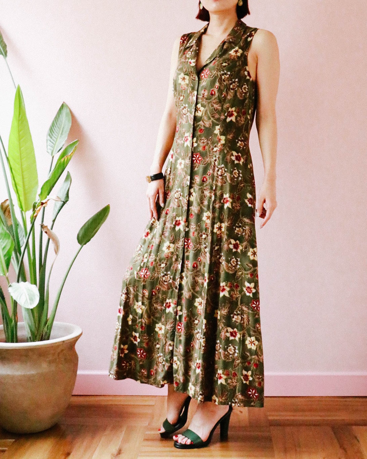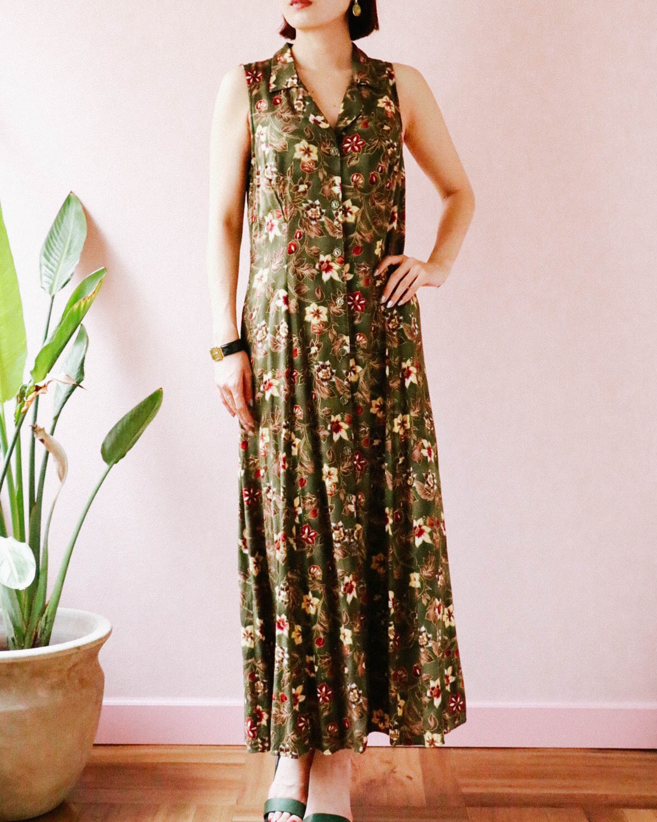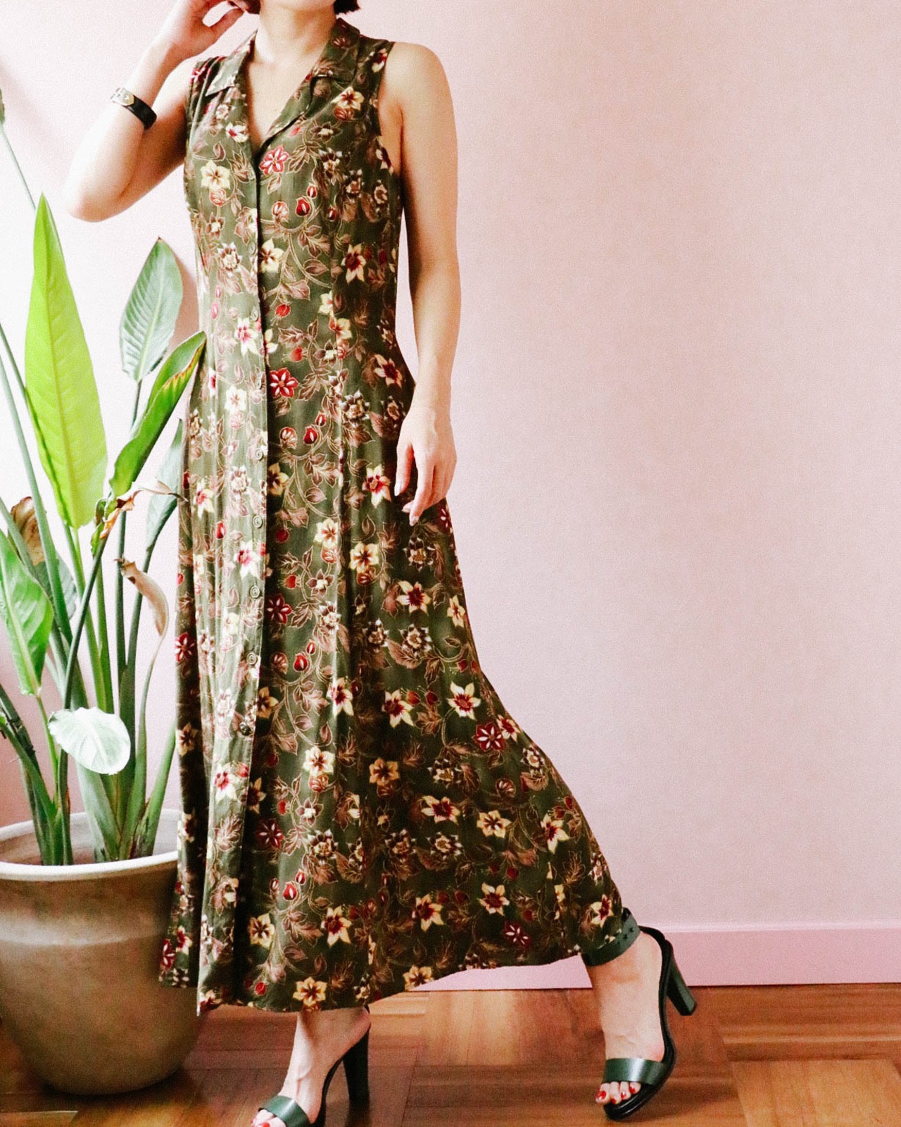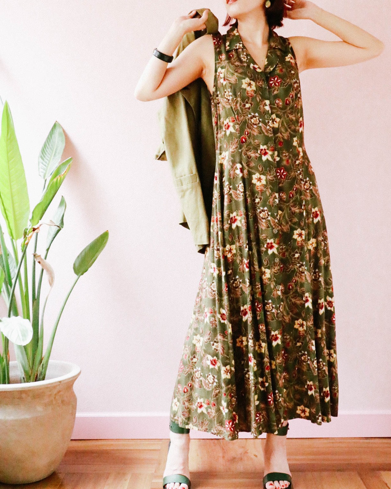 色香漂うオリエンタルなボタニカル柄のロングワンピースは1990年代のもの。