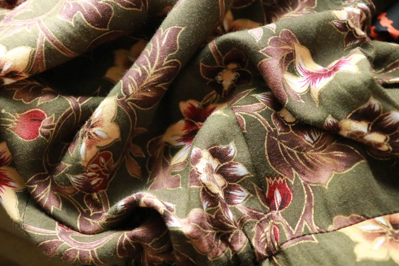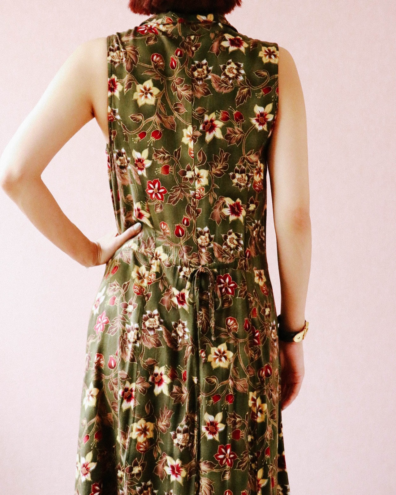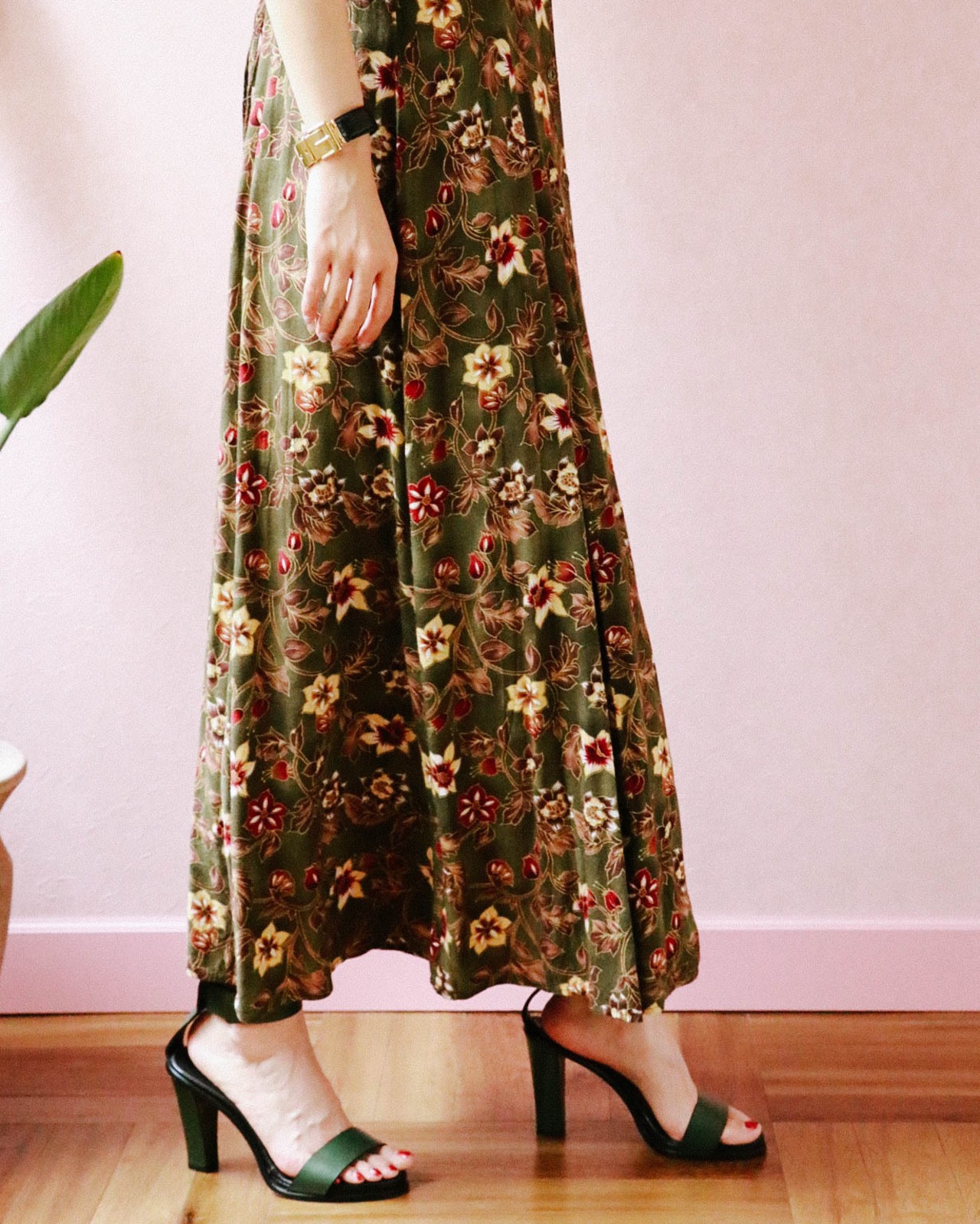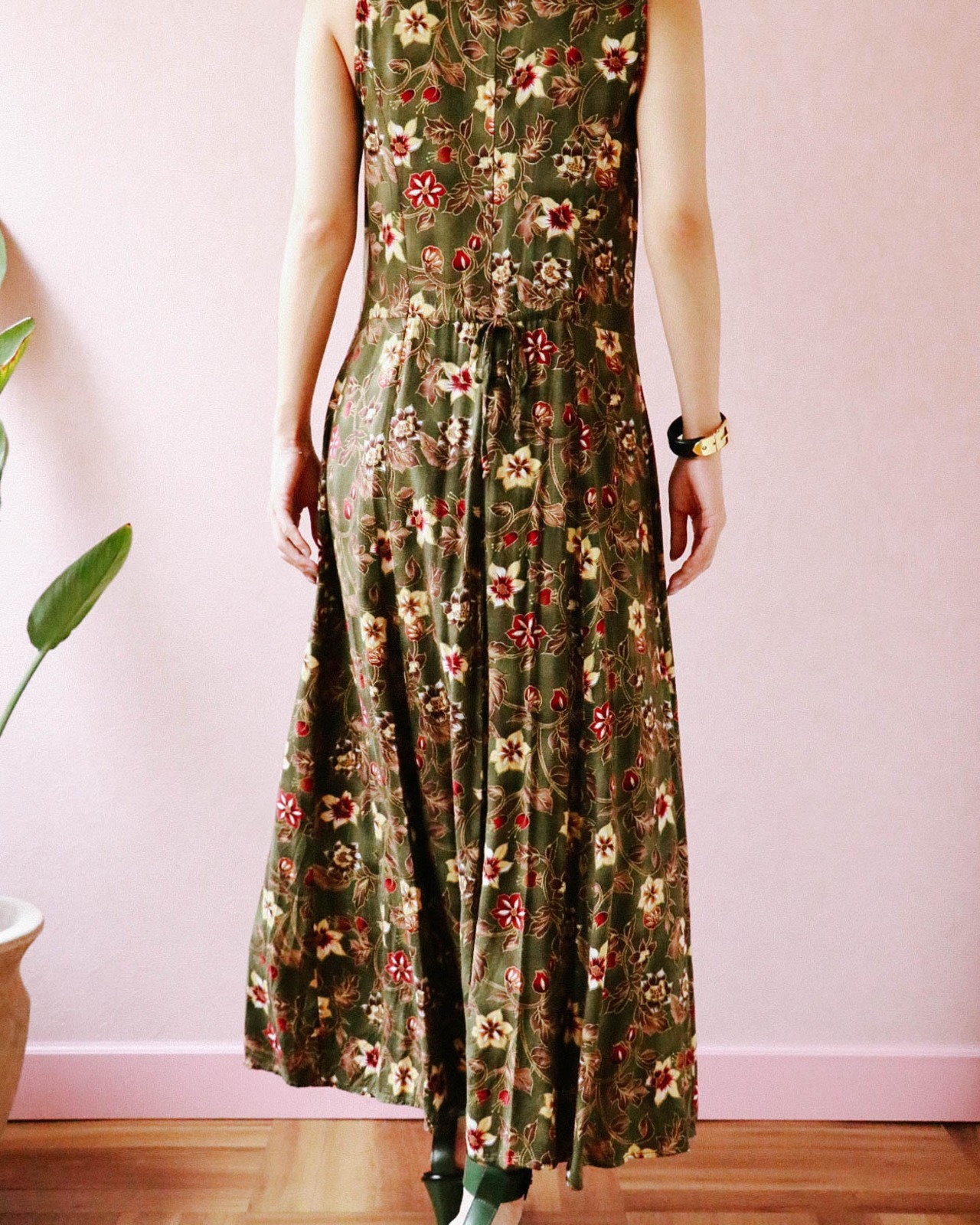 色香漂うオリエンタルなボタニカル柄のロングワンピースは1990年代のもの。