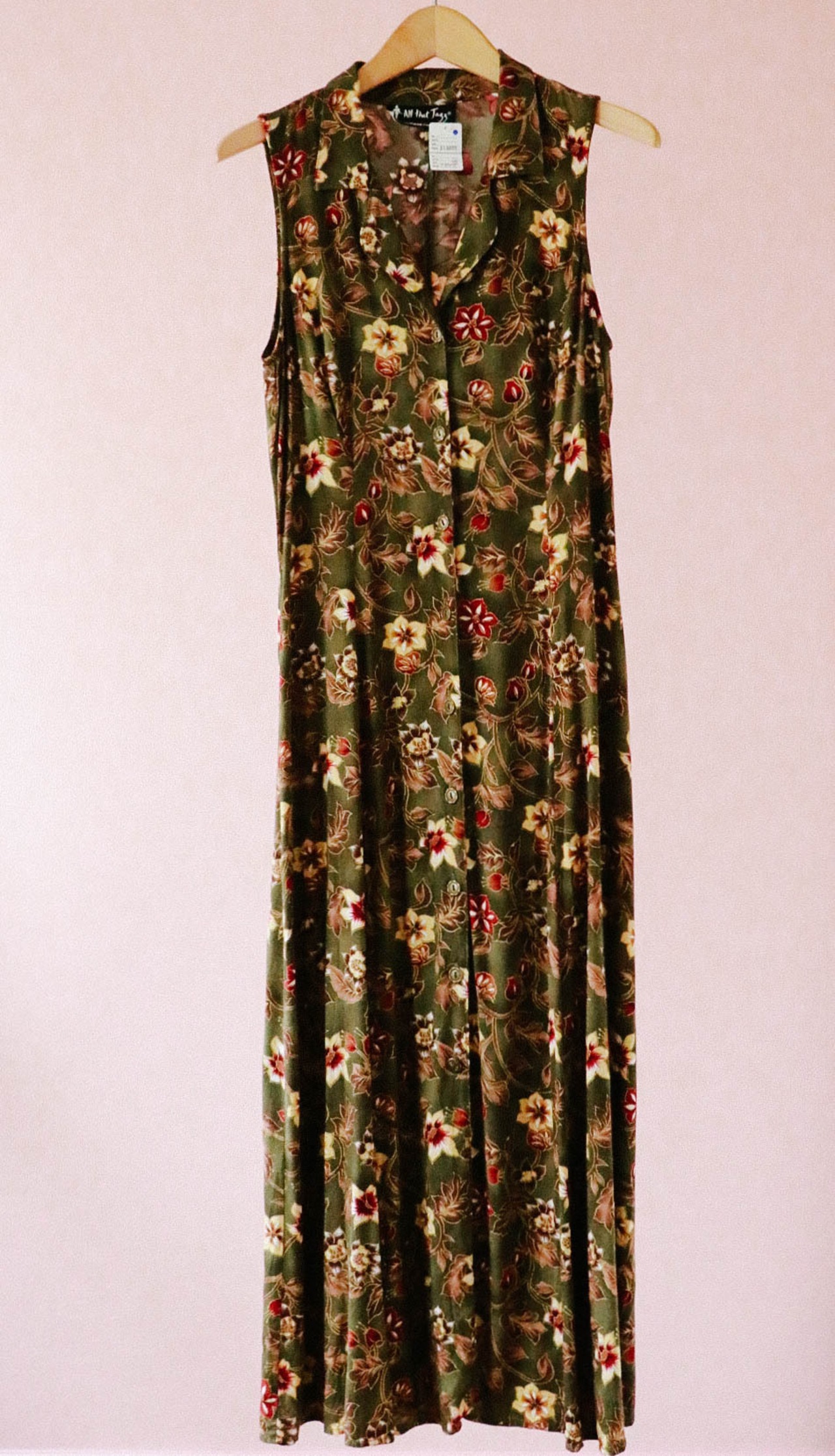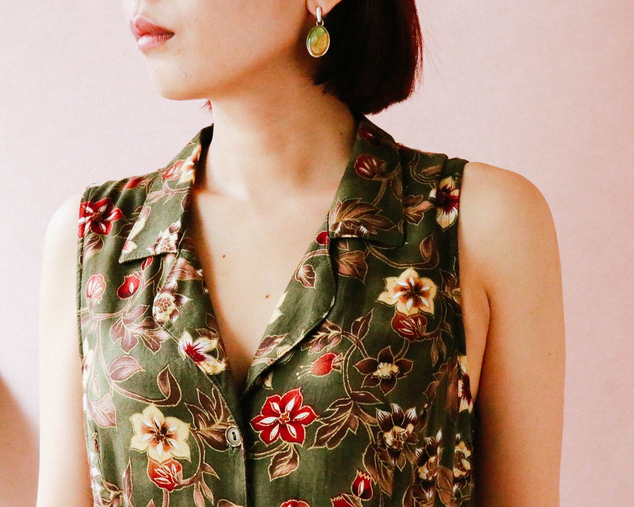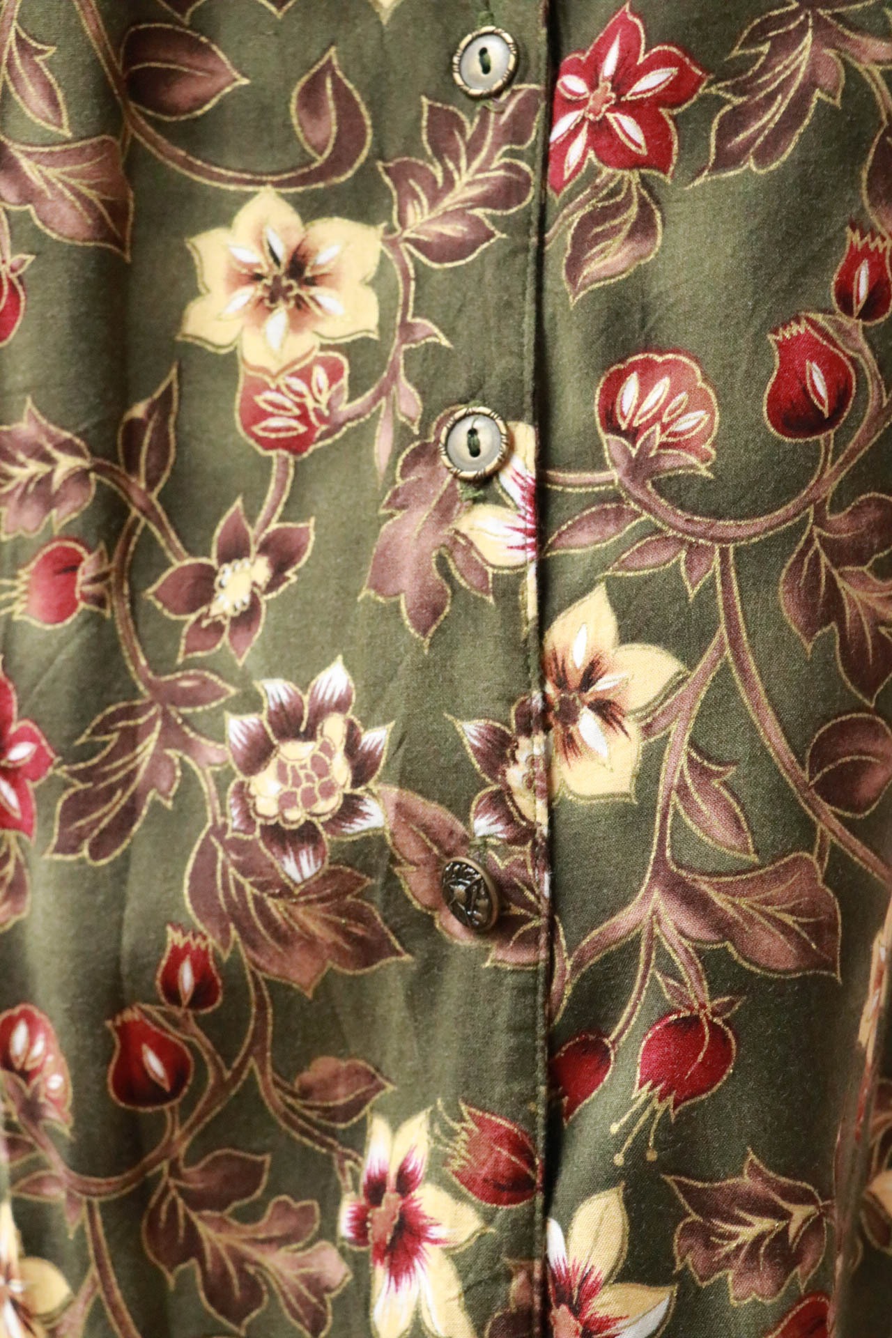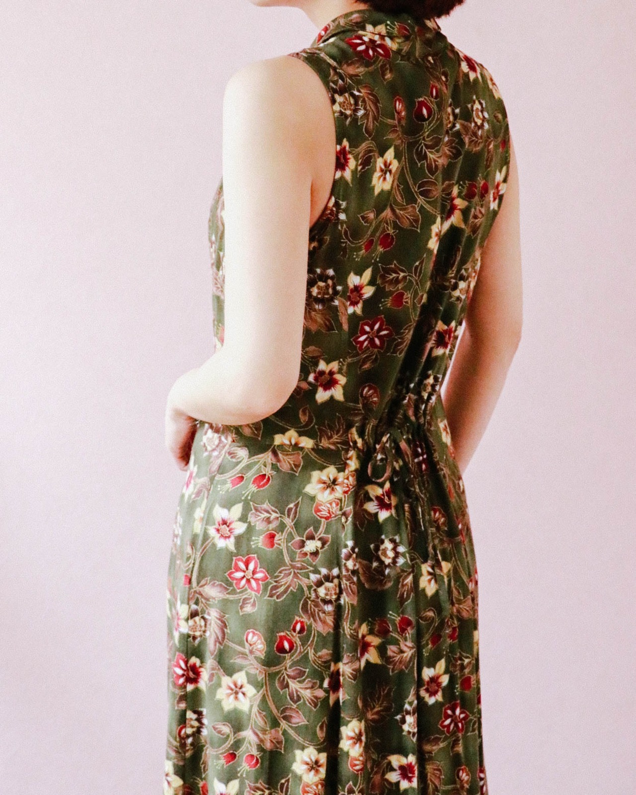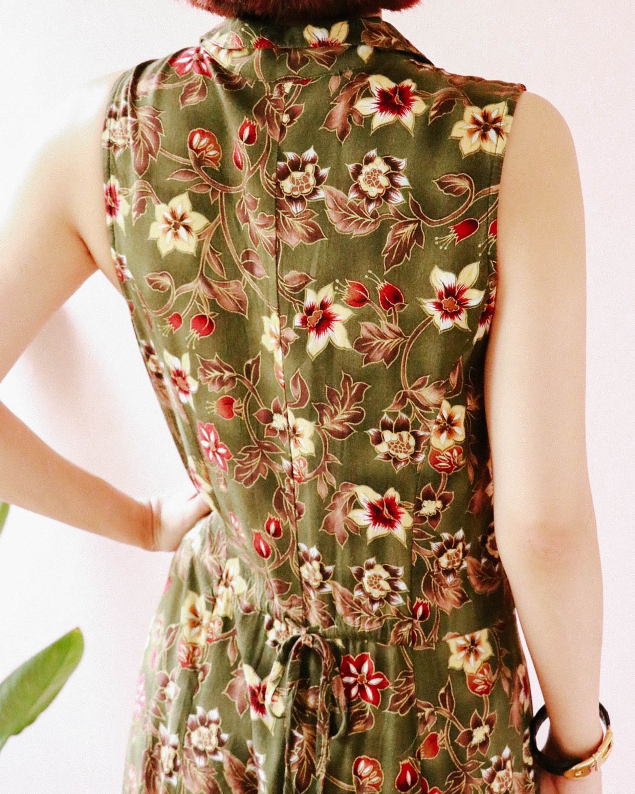 色香漂うオリエンタルなボタニカル柄のロングワンピースは1990年代のもの。