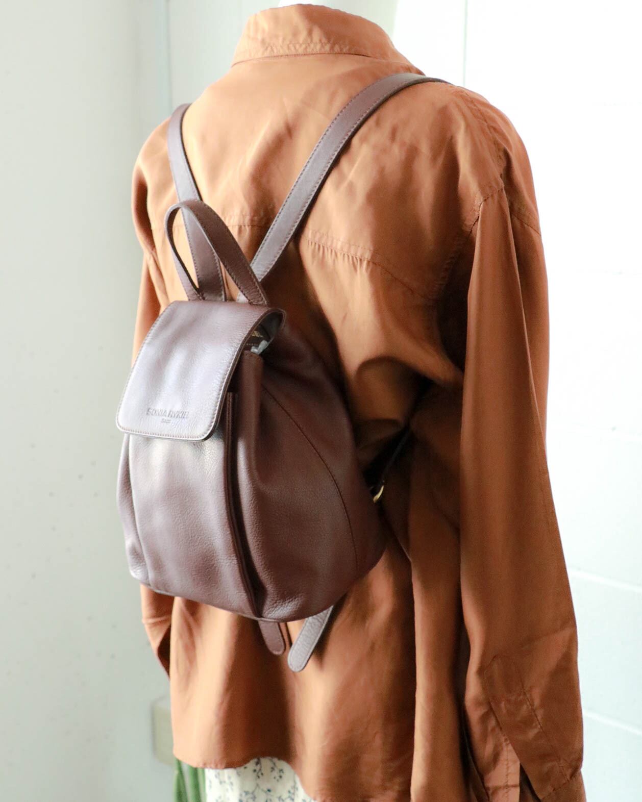 マットな質感のソフトレザーで、コーディネートに取り入れやすいブラウンカラー、毎日のように使えるソニアリキエル のレザーバックパックが入荷!!ゴールドの専用チャームやフラップに着いた型押しのブランドネームがさり気なく上品なアクセントを与えます!貴重品が十分入るサイズで、調節がきくフィット感のあるレザーショルダーベルト、手持ちのハンドルも着いて使い勝手抜群!!小ぶりのリュックをお探しの方におすすめです!