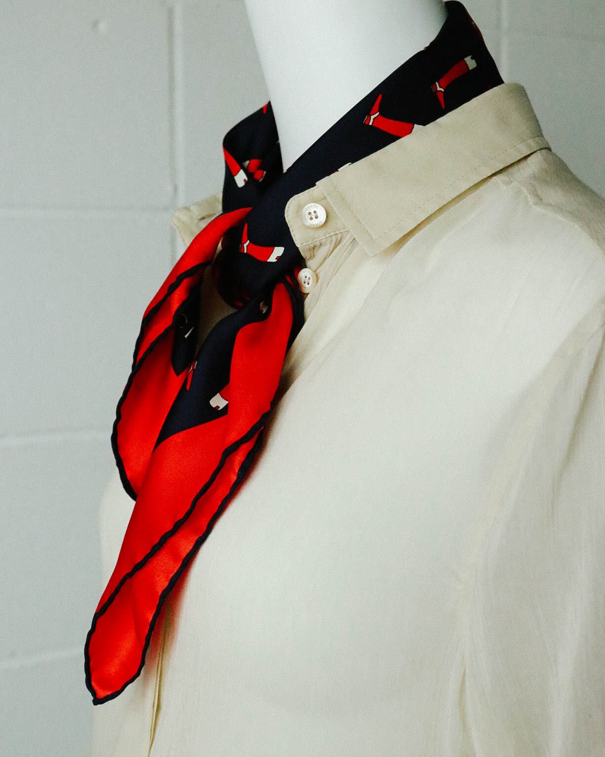 ジョッパードブーツがプリントされたシルクスカーフはグッチのもの。