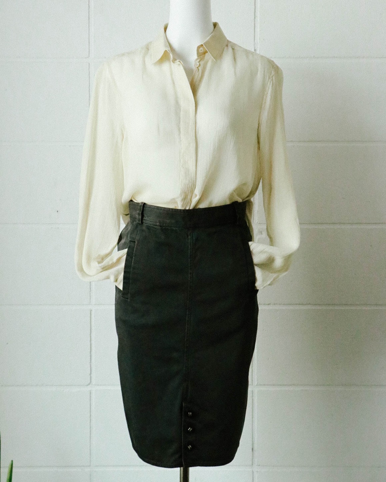 前も後ろもポケット付きの高機能なシャネルの綿スカートが入荷。カジュアルにガシガシと履けるのも古着ならでは。タイトスカートはウエスト&ヒップバランスが決めて。きれいめコーデもいいですが、くたっとしたハイカットスニーカーと合わせたコーデもおすすめです!