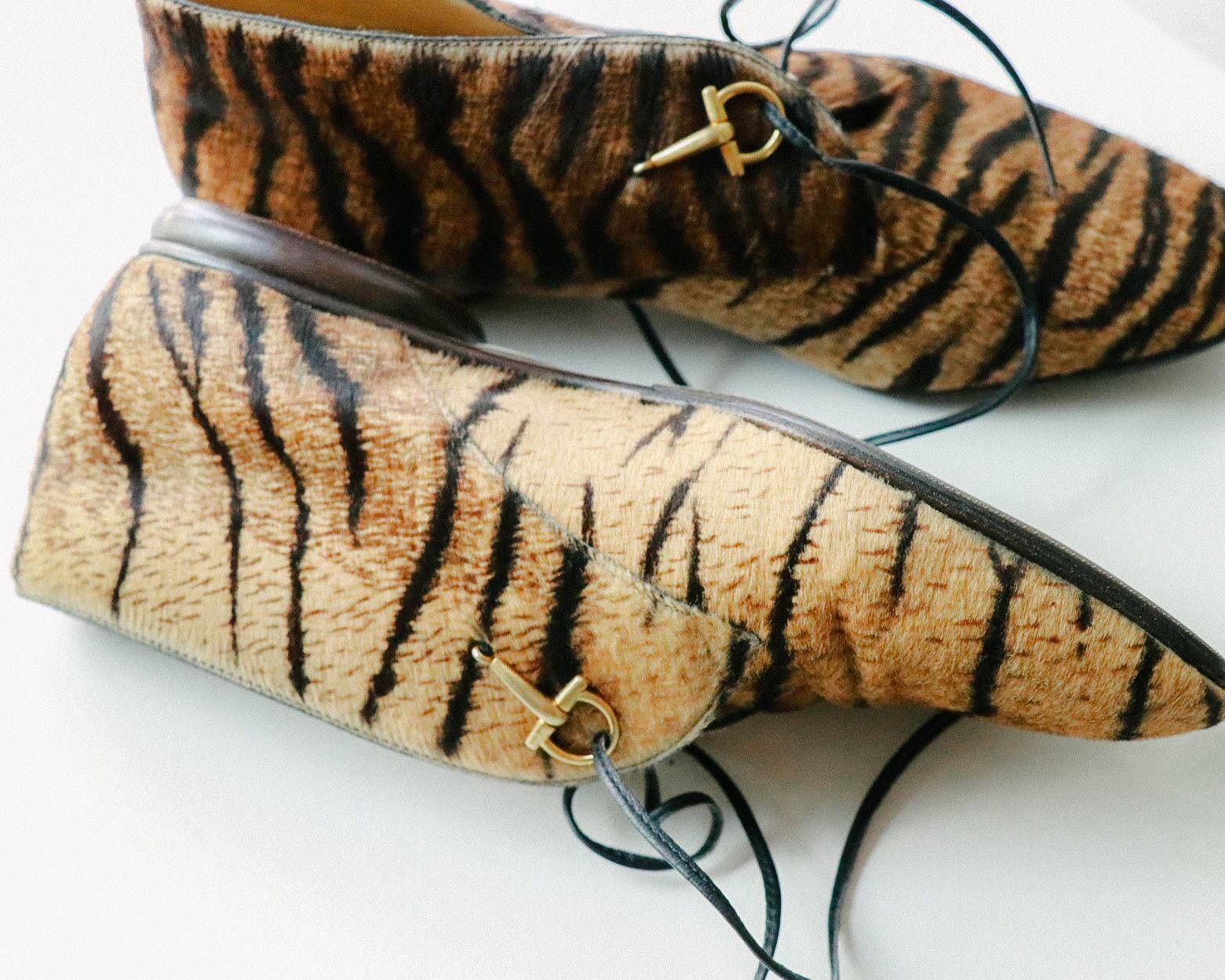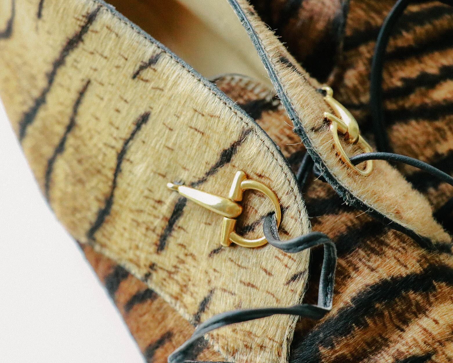トレンド問わず気分に合わせて使いたくなるアニマル模様。そんな希望を足元で楽しめるこちらのシューズはGUCCIのもの。ハラコボディーと上品な相性のグッチー定番のホースビット