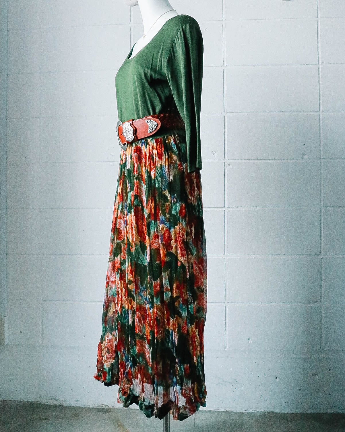 ダイナミックな花柄とトップスの鶯色のギャップがたまりません。