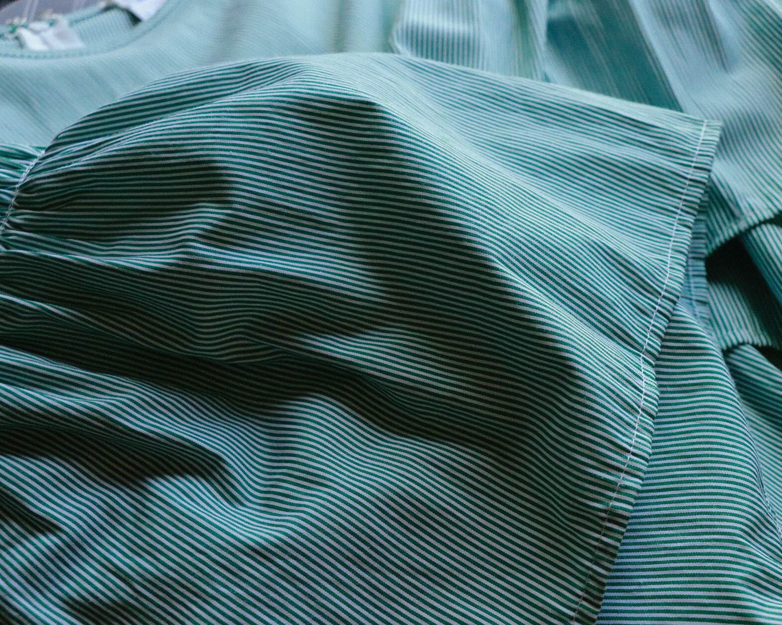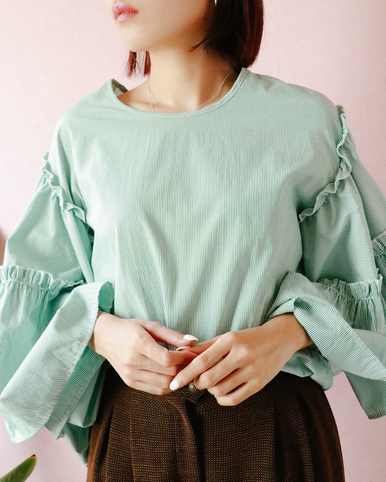 ボリュームたっぷりのフレアスリーブがスタイリッシュな印象のストライプ柄を大人フェミニンにアップデート。