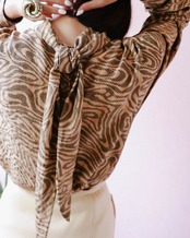 こちらのブラウスはなんと言ってもバックボウタイ。フロントをすっきり見せつつバックスタイルは華やかに...このバランスがなんともいえません。