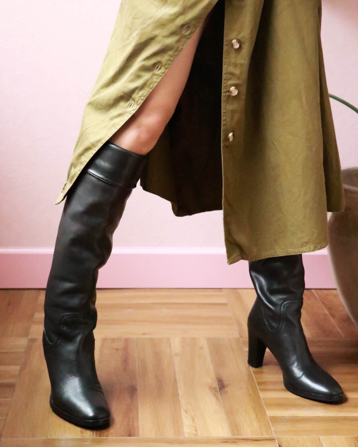 特にブランドではないのですが、この上ない上質な皮革と筒周りのキュッとした細さがセンシュアル。ブラックレザーを纏うレッグはそれだけでフェティッシュで一気にオトナレディな足元へ。