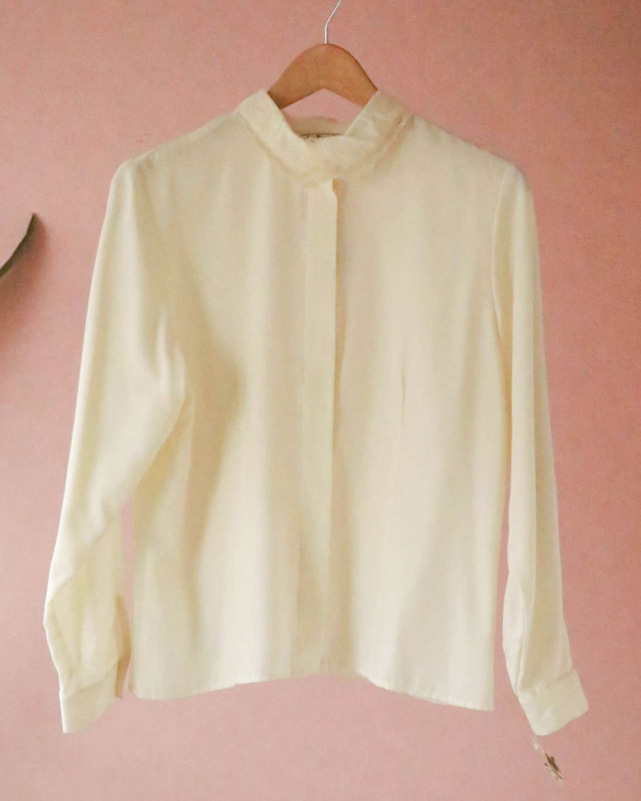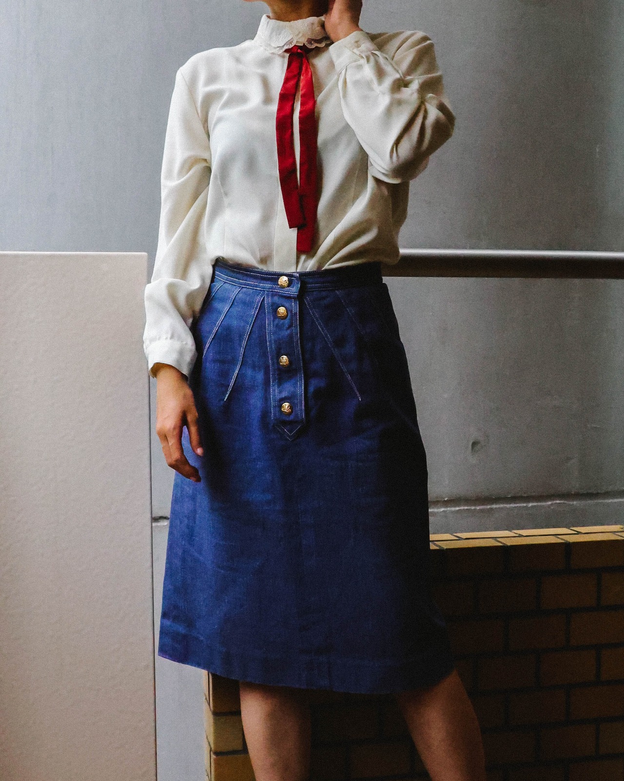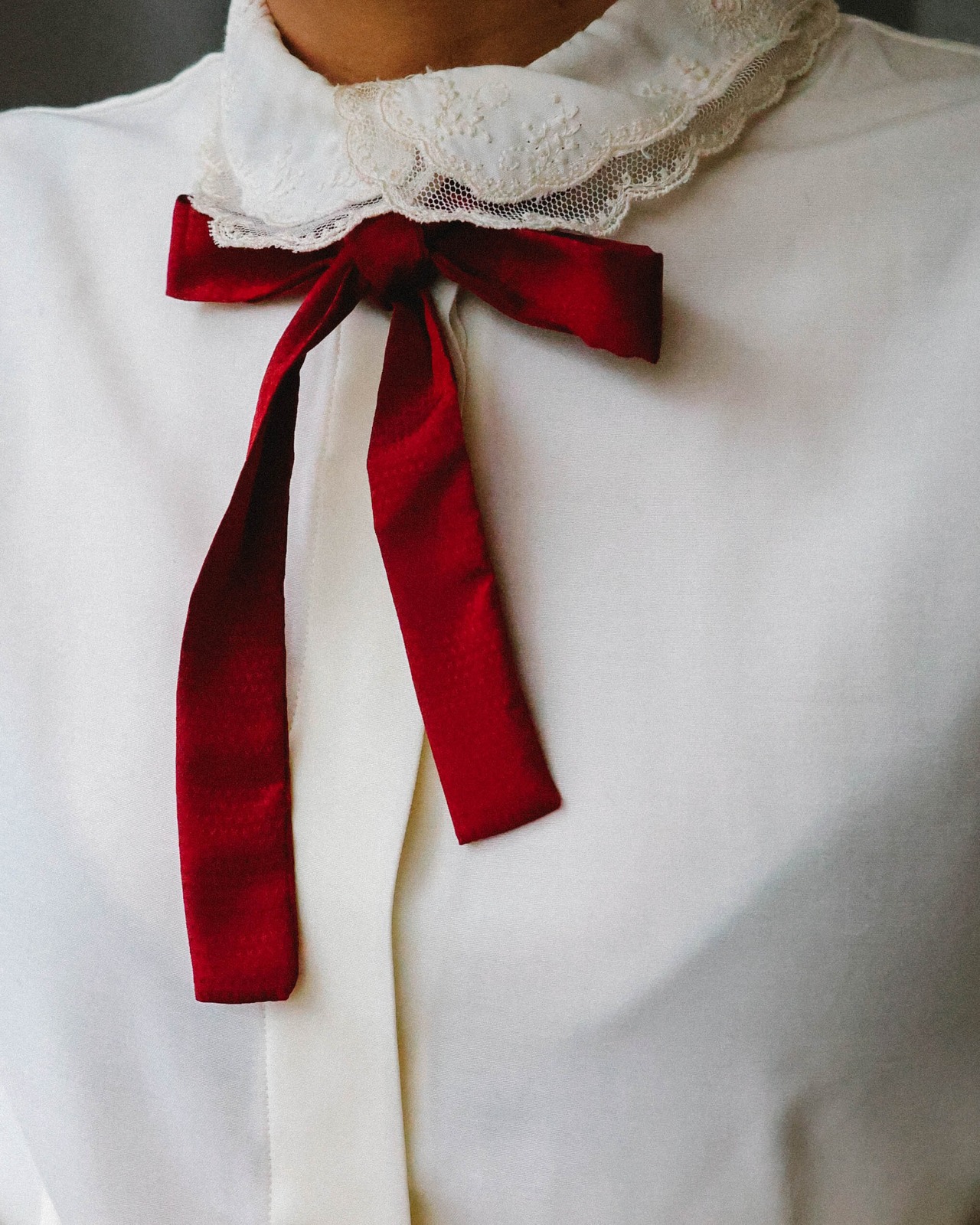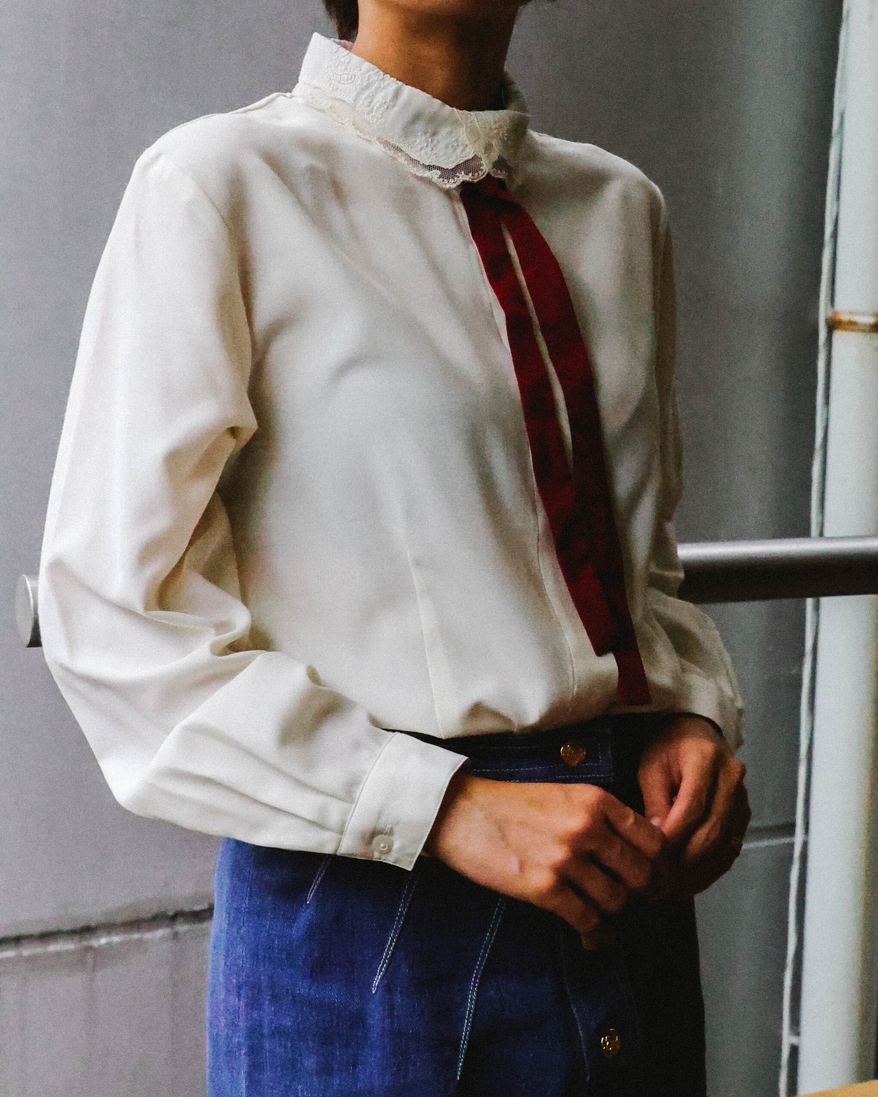 レースが施されたスタンドカラーのブラウスが入荷。オフホワイトにレッドリボンがロマンチックな秋ムードを高めてくれます。