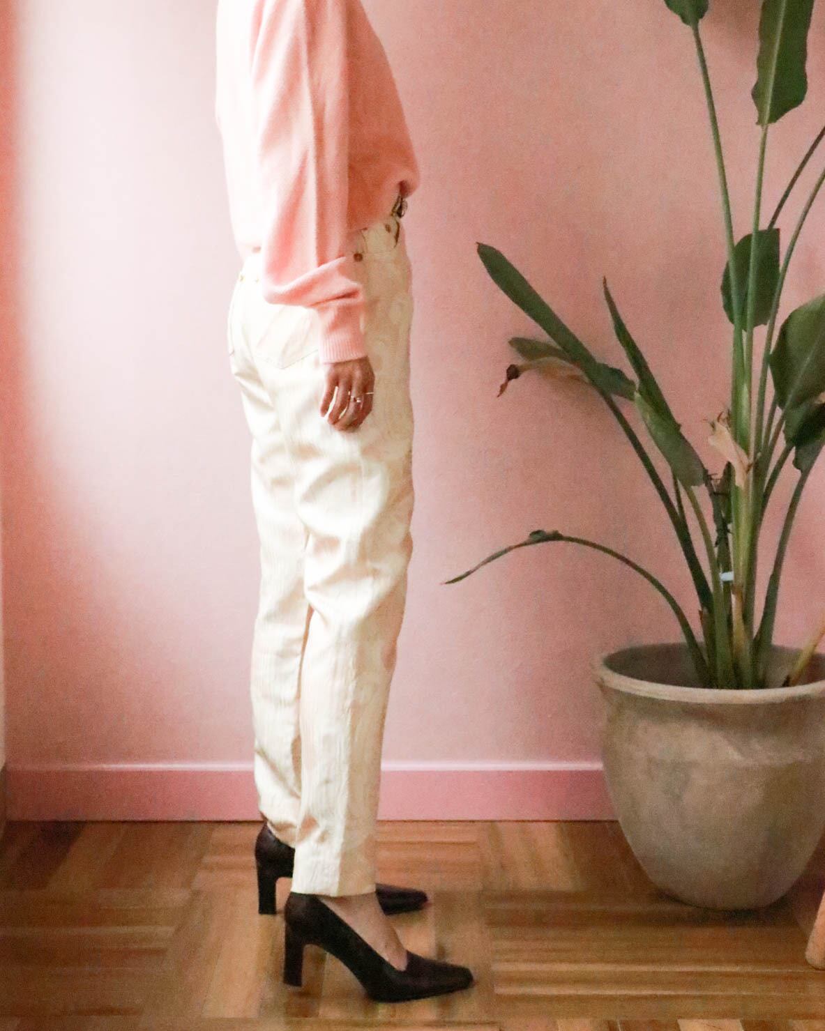 ロープやボタニカルモチーフがデザインされたシルク混スリムパンツはディオールのもの。