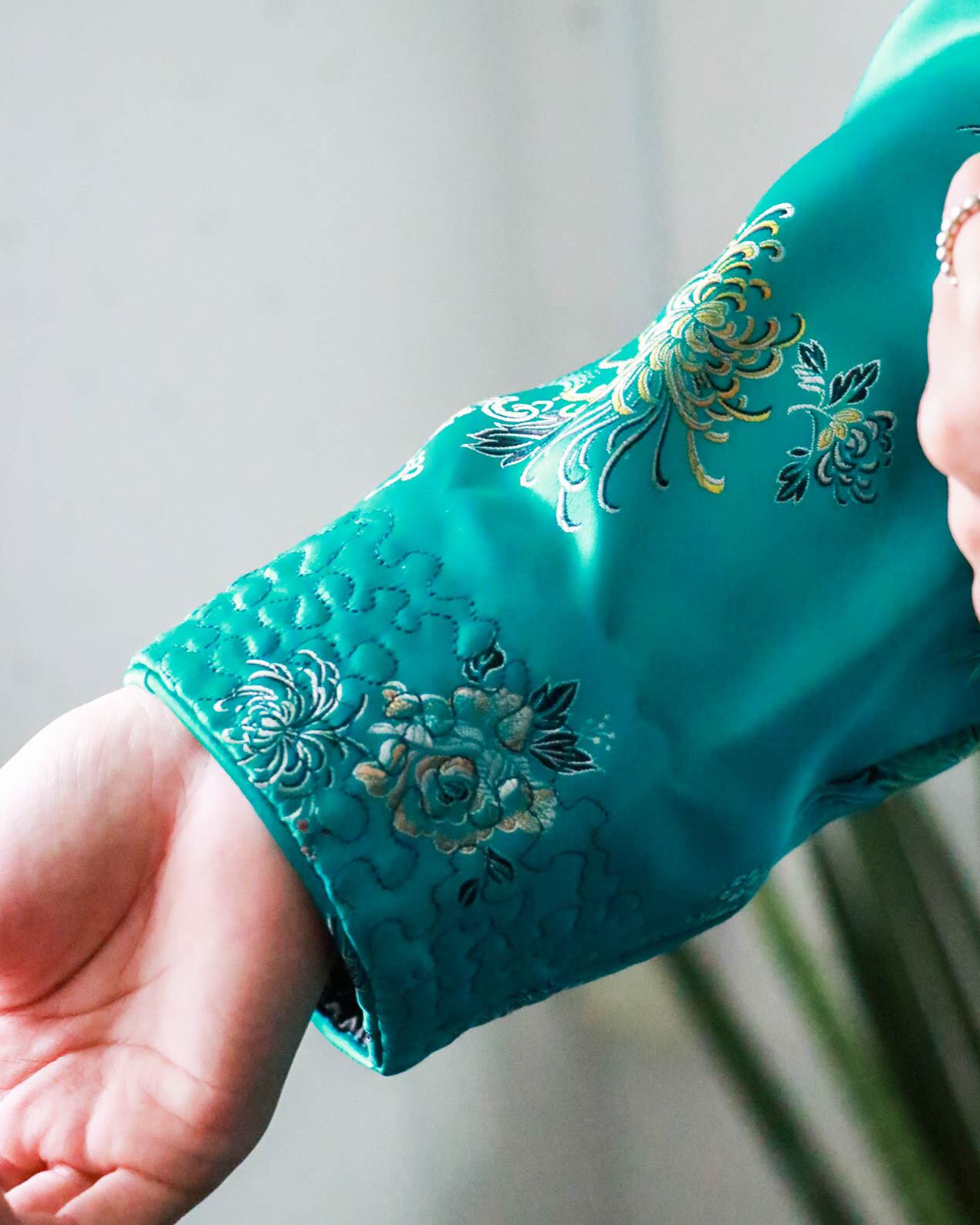チャイナ感溢れるターコイズ側はオールブラックコーデの差し色として使ったり、黒の内側からチラッと見えても上品なアクセントを与えます。両側にポケットがあるのも実用的で嬉しいポイント!!真冬は上からファーを被せてみてはいかがでしょうか。