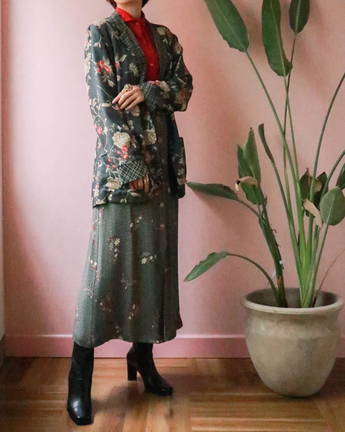 大ぶりな花柄にルーズなサイズ感が良い感じのジャケットは、レーヨン素材でオールシーズン着用可能。