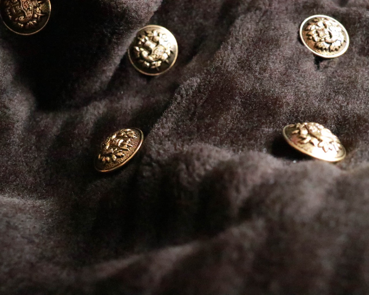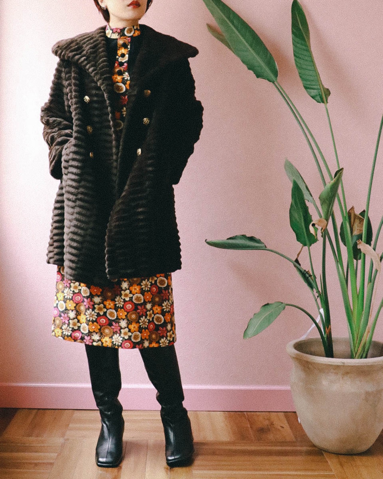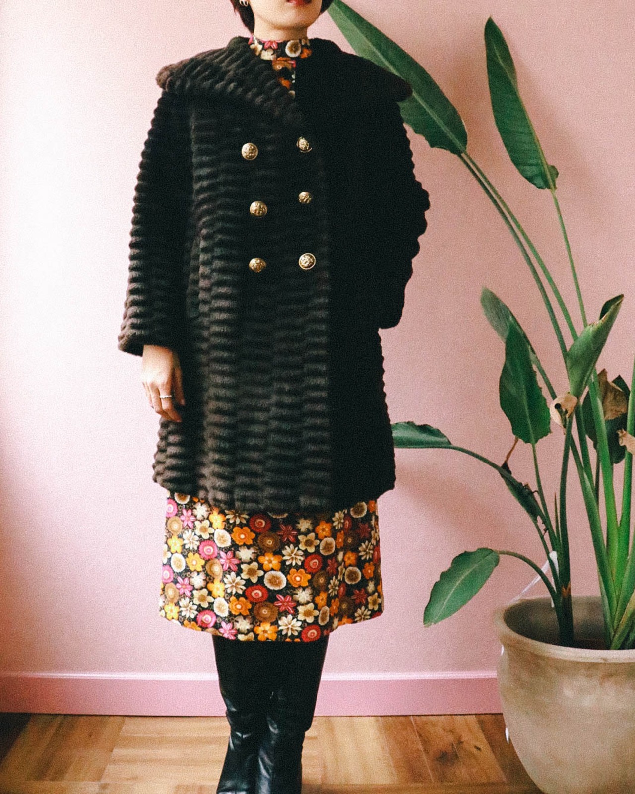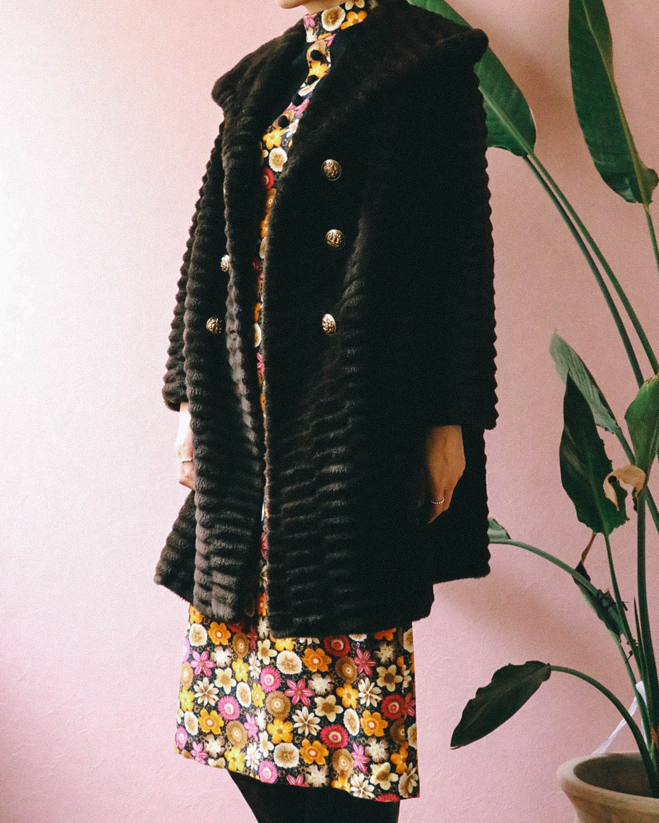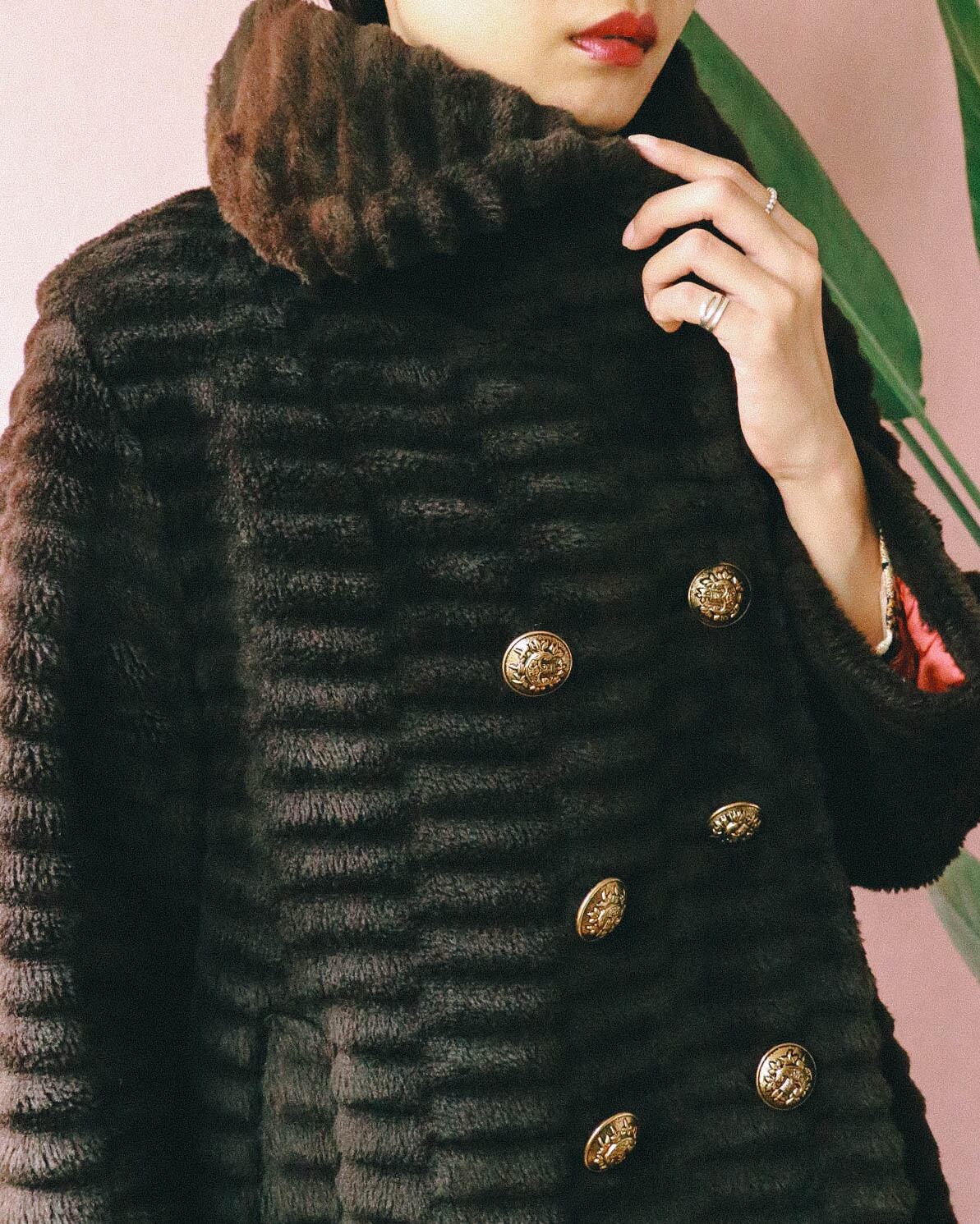 ボーダー調にファーを縫い合わせた表地デザインに、60'sらしい大きな襟とボタン。シックなブラウンカラーで陰影が生まれ、高級感が漂います。