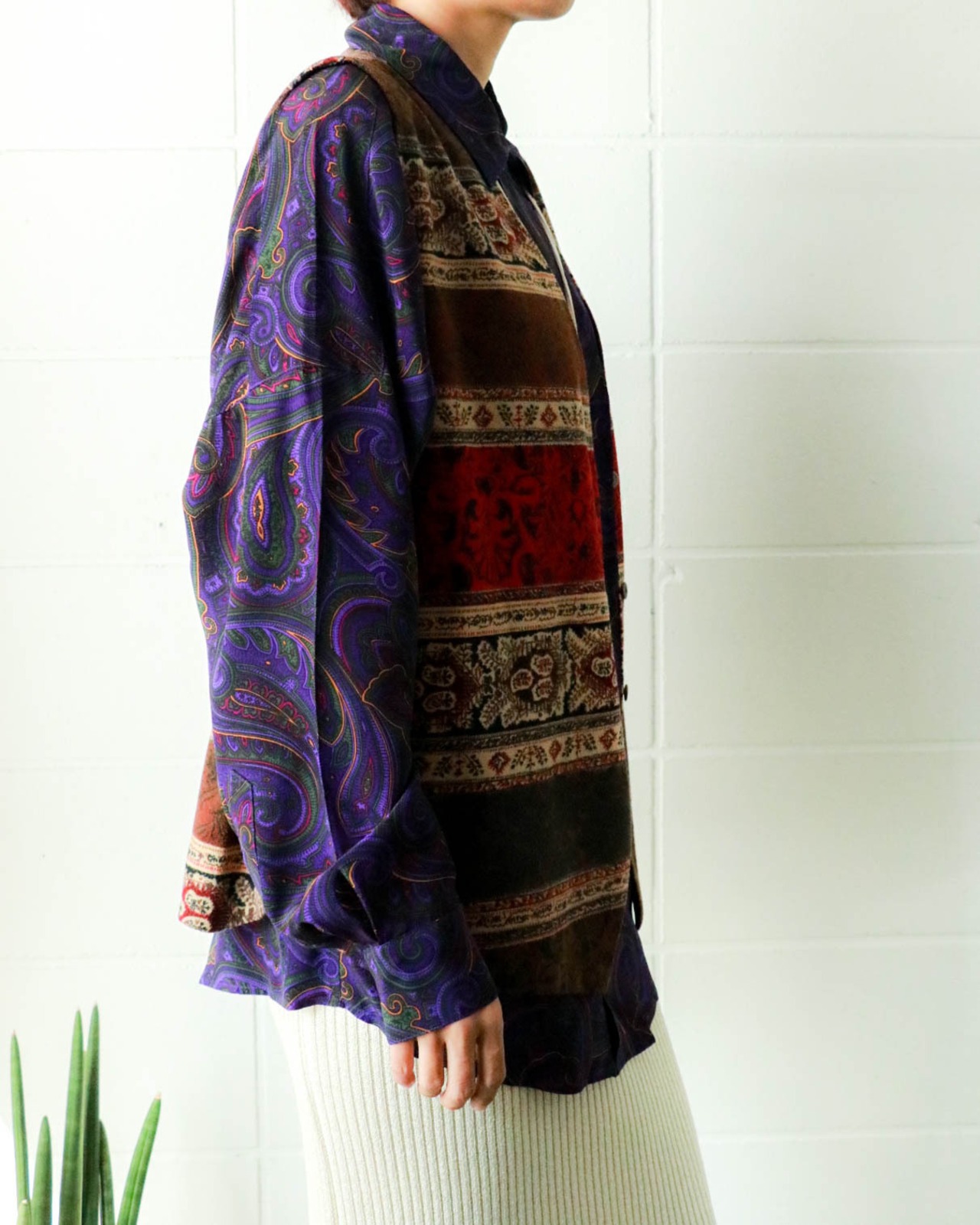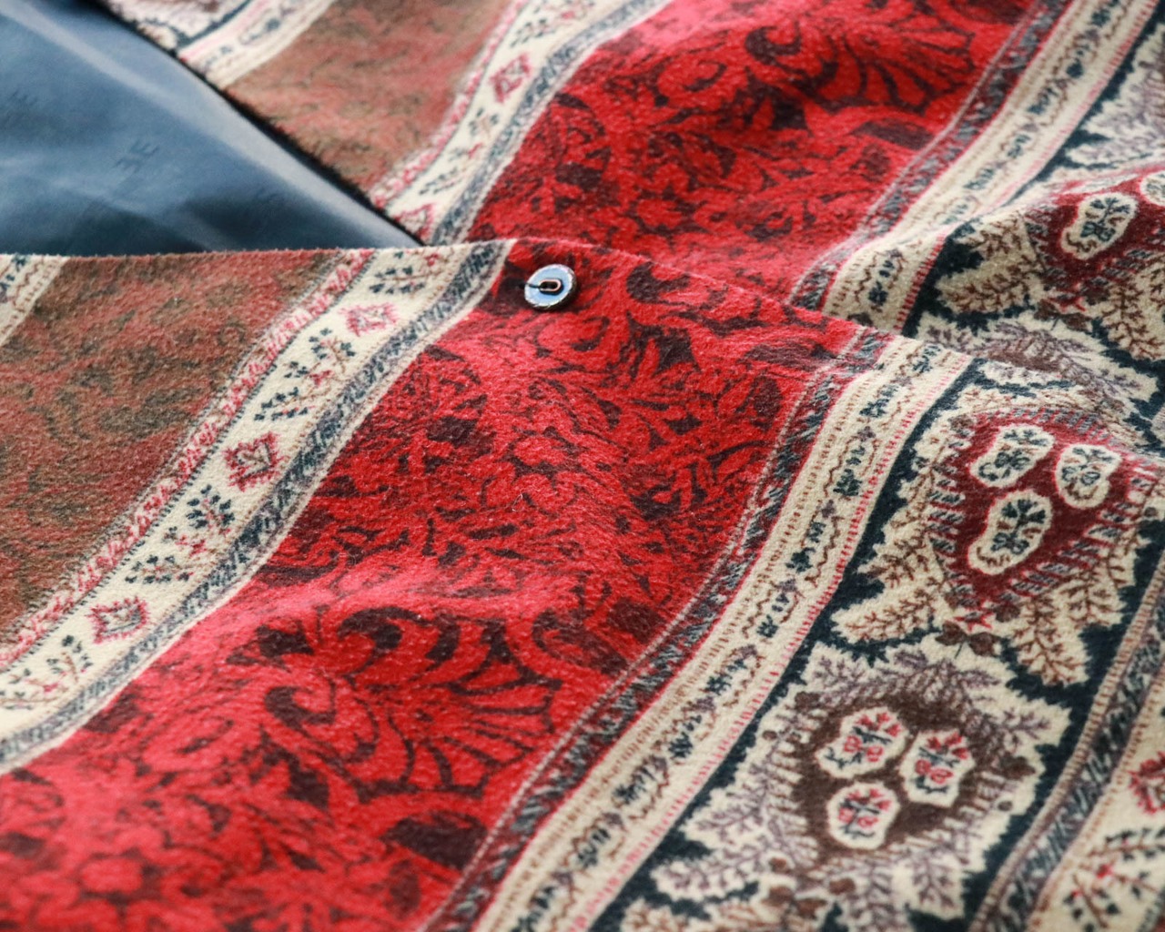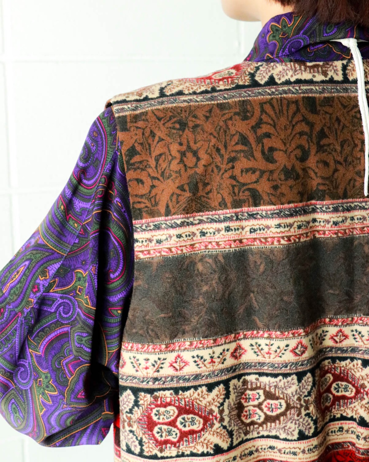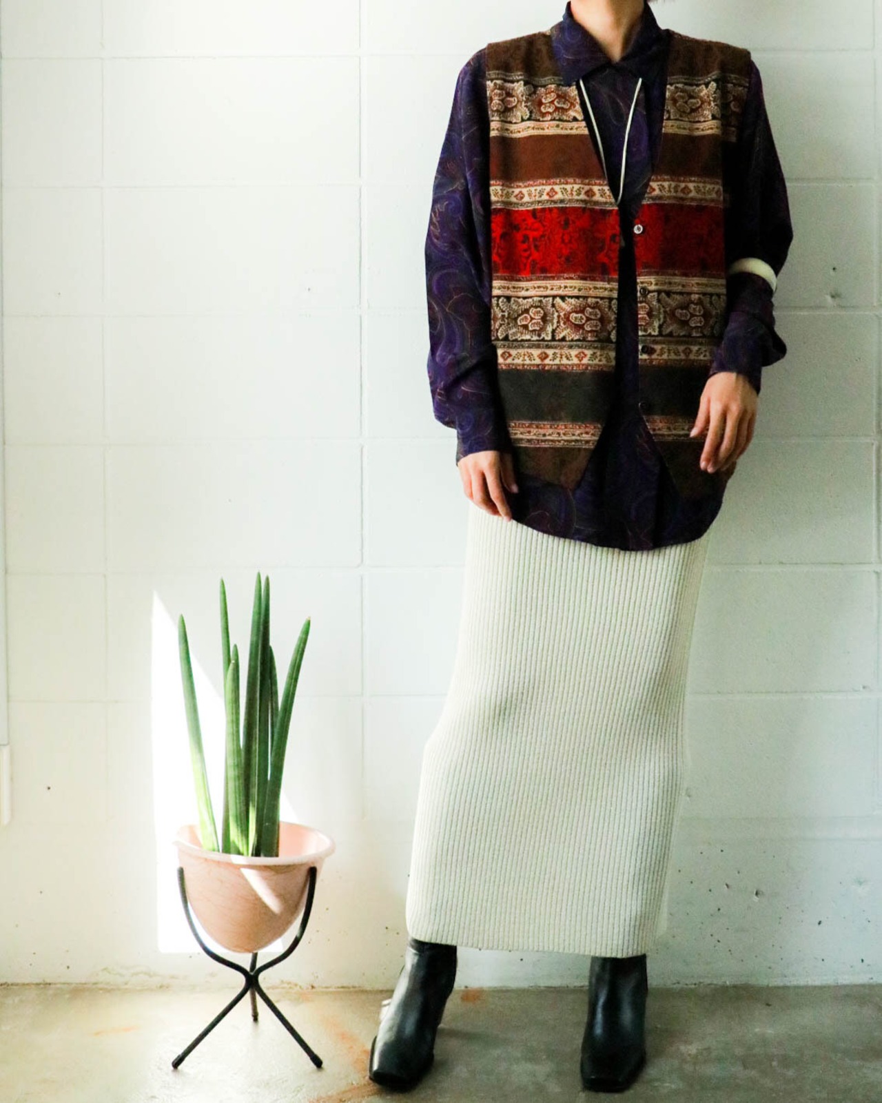 ハンドメイドと思われる仕立てのいいベストが入荷。細やかな柄は意外と柄物との相性もよく、ワイドシルエットが今の気分にはまる。