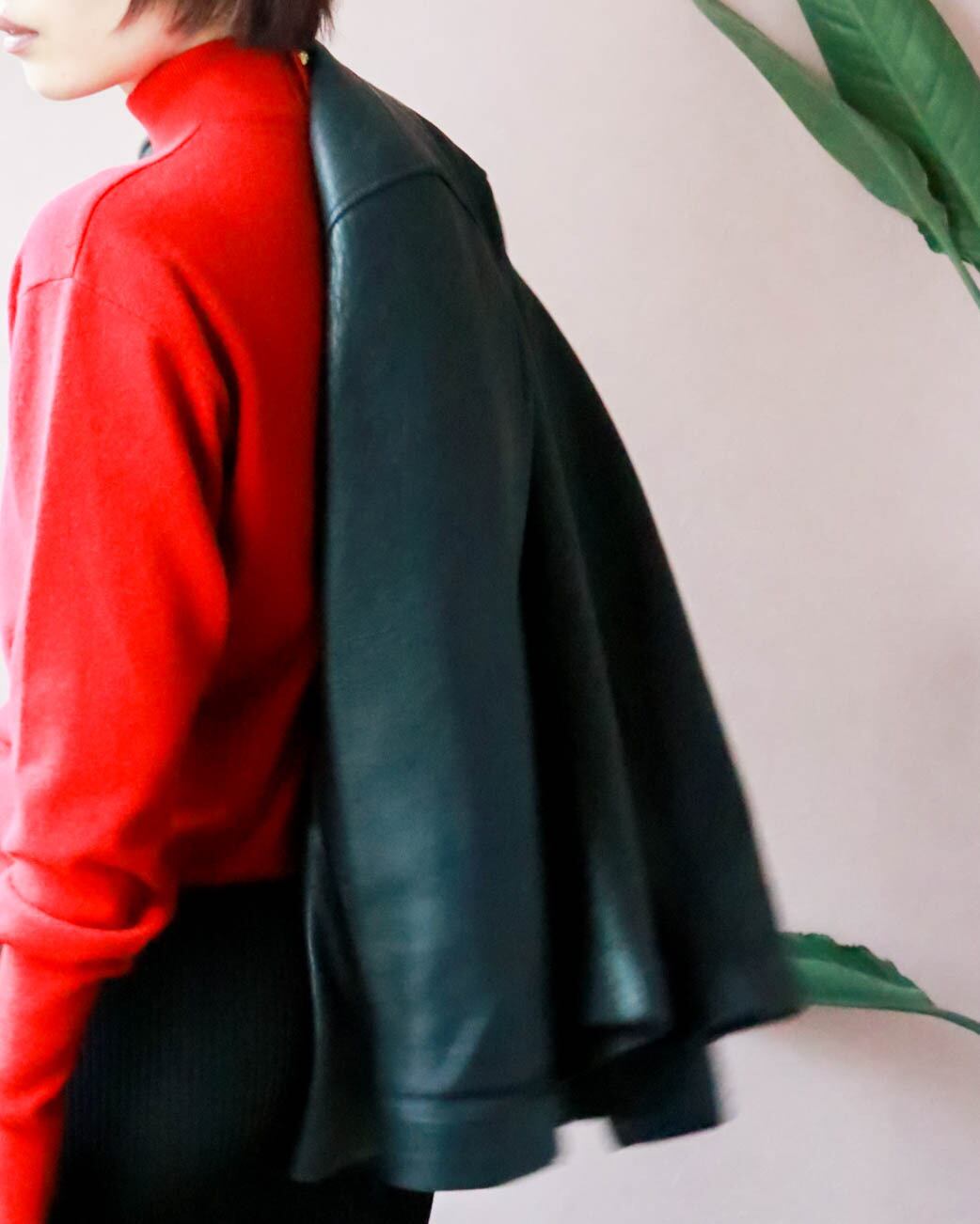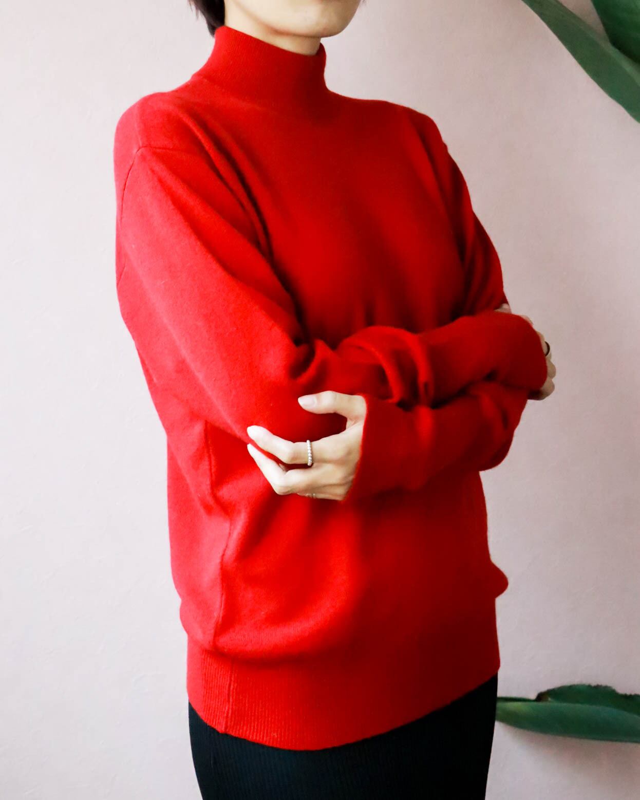 首元はモックネック にバックボタンスタイル、引き締まった袖口とゆったりめなボーディーがどんなボトムズとも合わせやすい。素材表記がないですが、おそらくカシミア だと思われる上品なレッドカラーがこれからの季節にぴったりのセーター