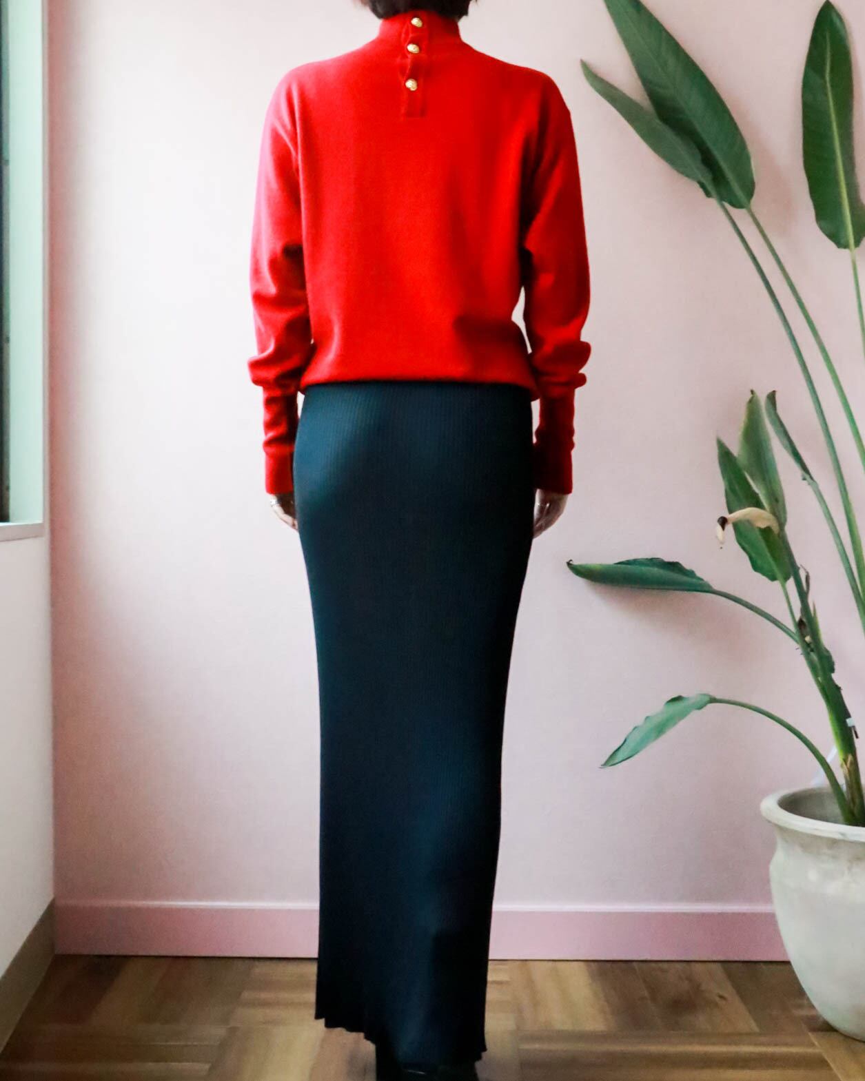 ウエスト横のゴールドボタンが上品なアクセントを与えます