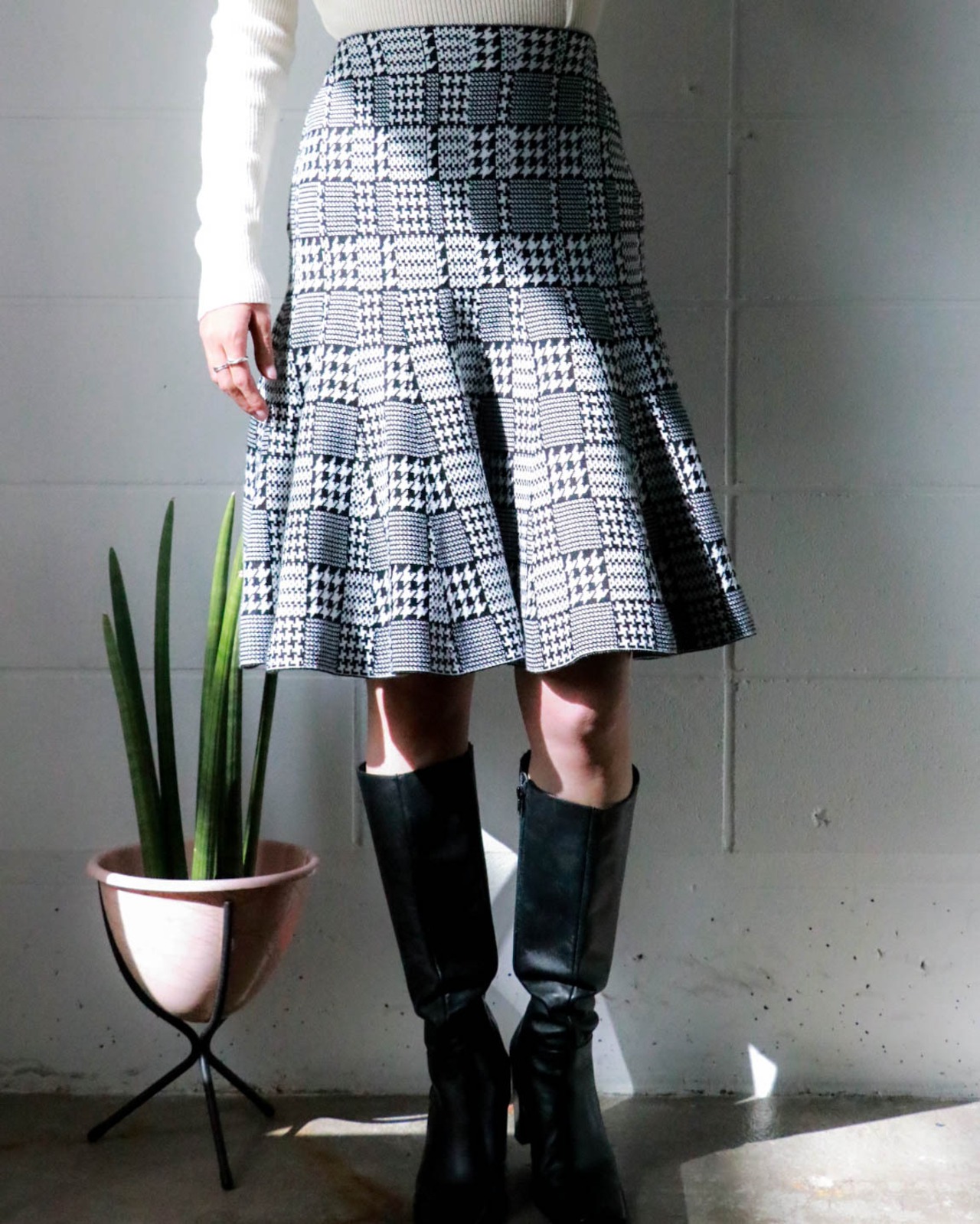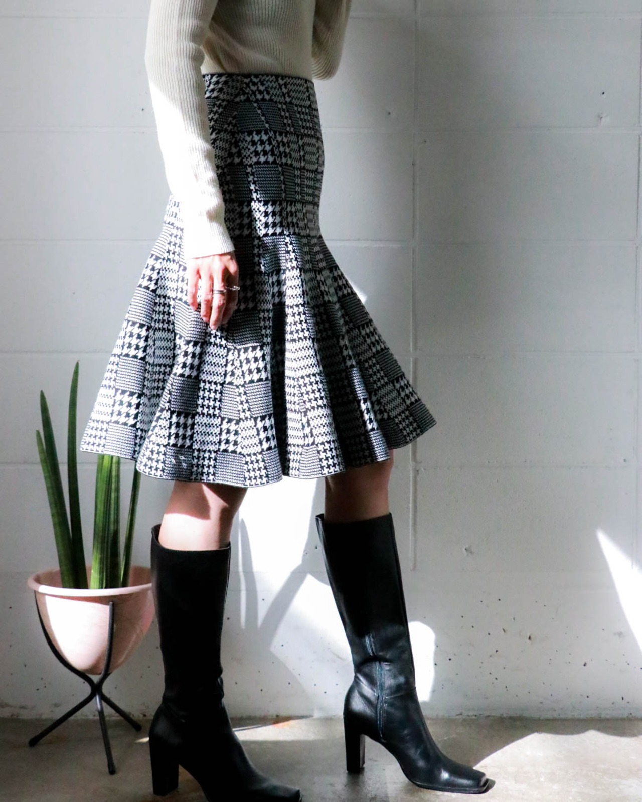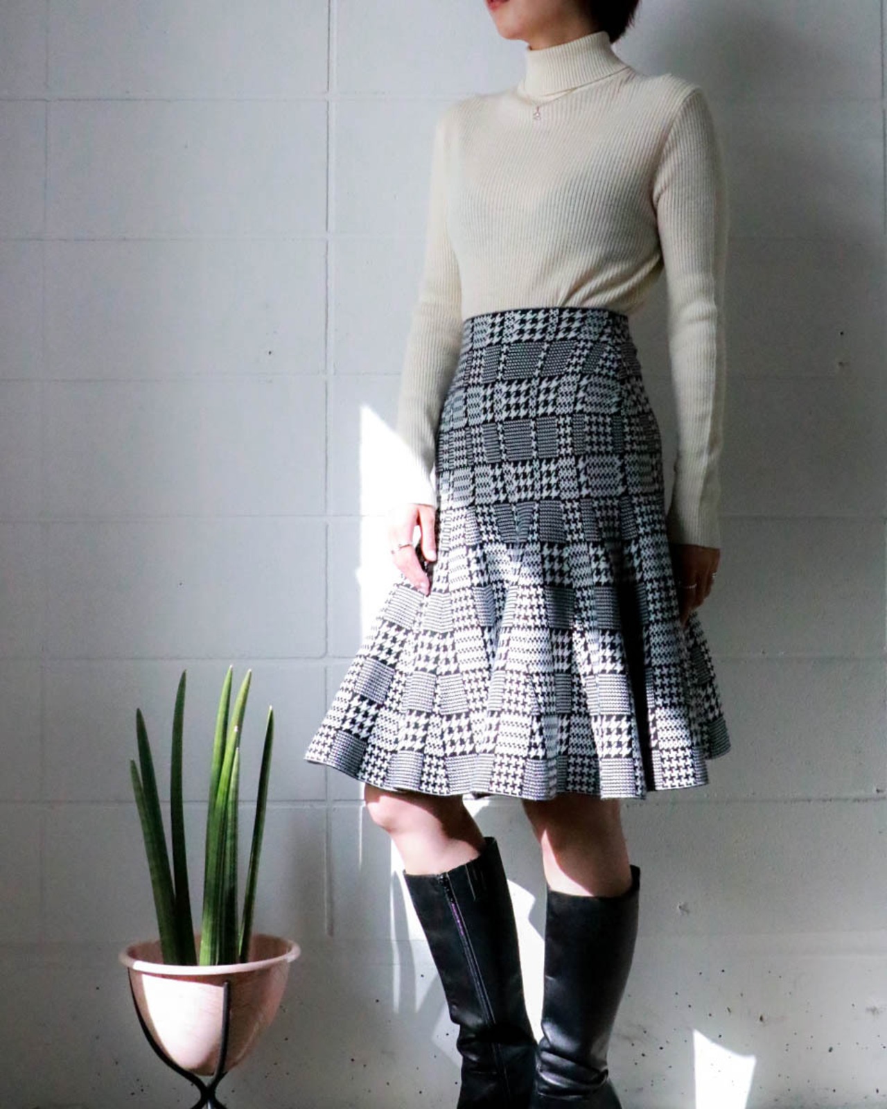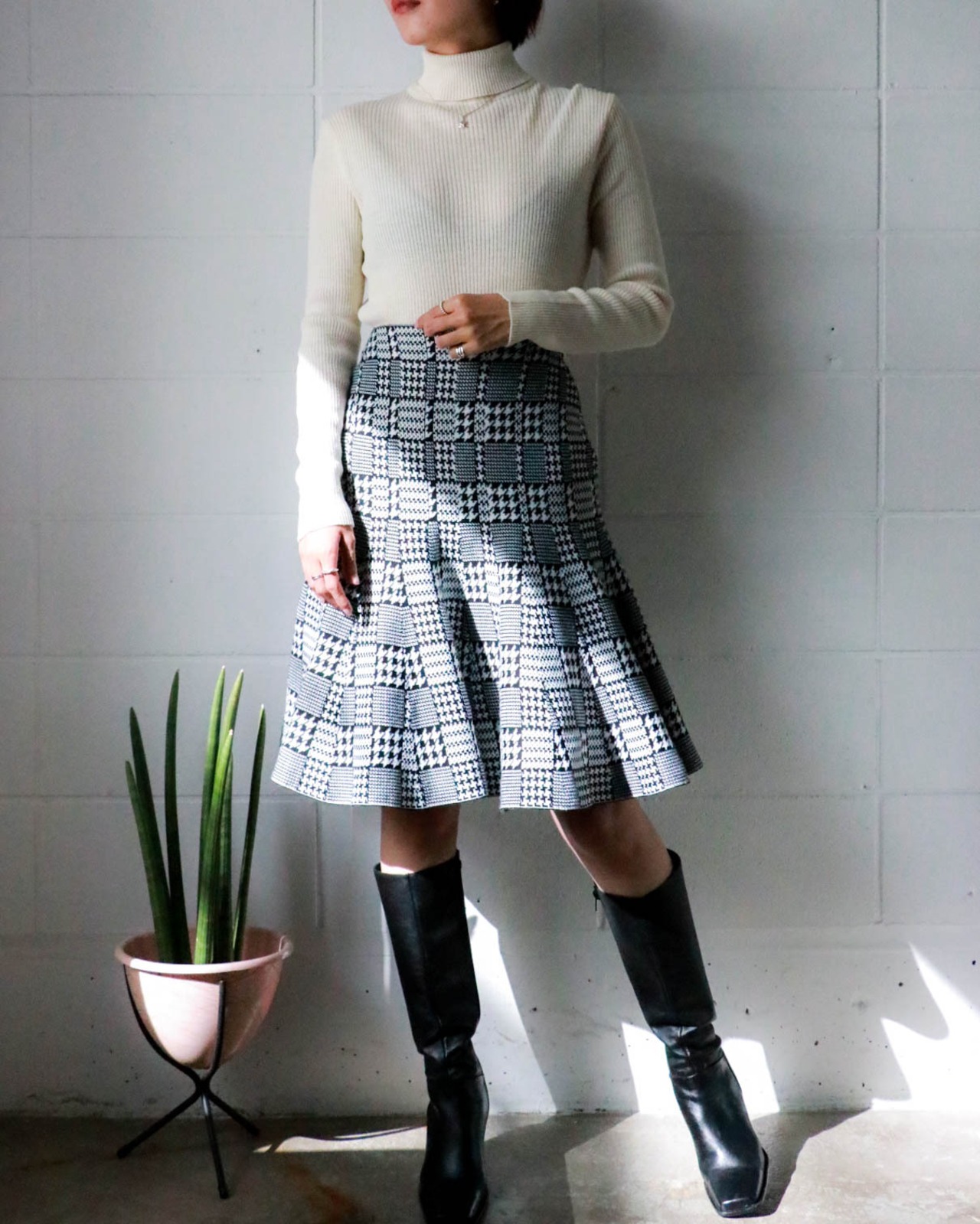 写真のように、ロングブーツやジャケットと合わせて知性溢れる着こなしを楽しんで。