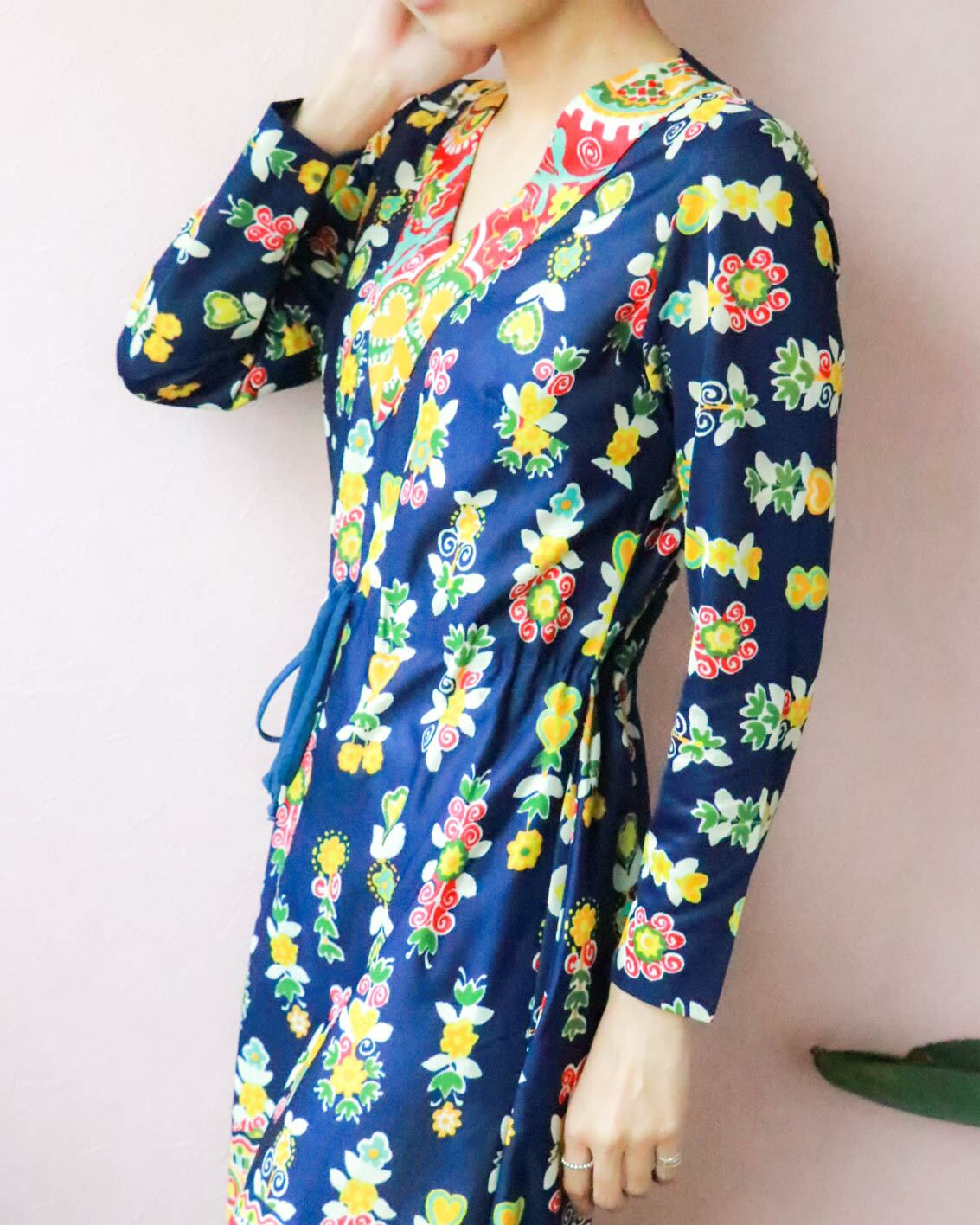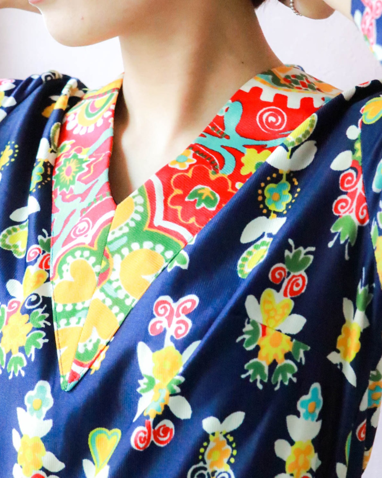 ネイビーベースにカラフルな絵柄のようなアーティーな模様が、自由と平和を求めた70'sカルチャーを思い起こさせます。光沢感とハリのあるしっかりとした素材感。