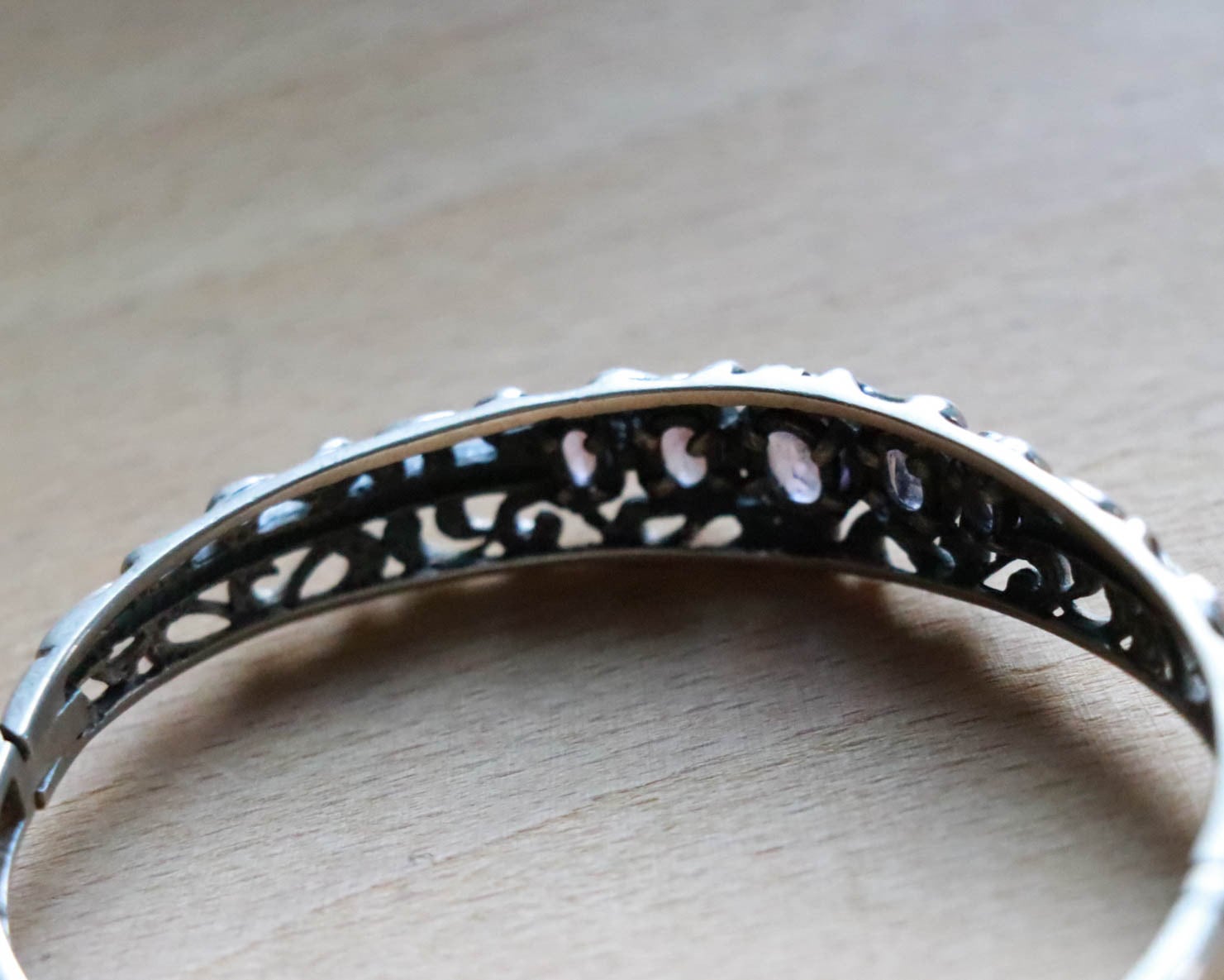 趣のあるヴィンテージシルバーと淡い光を放つアメシストの組み合わせが美しいバングル。