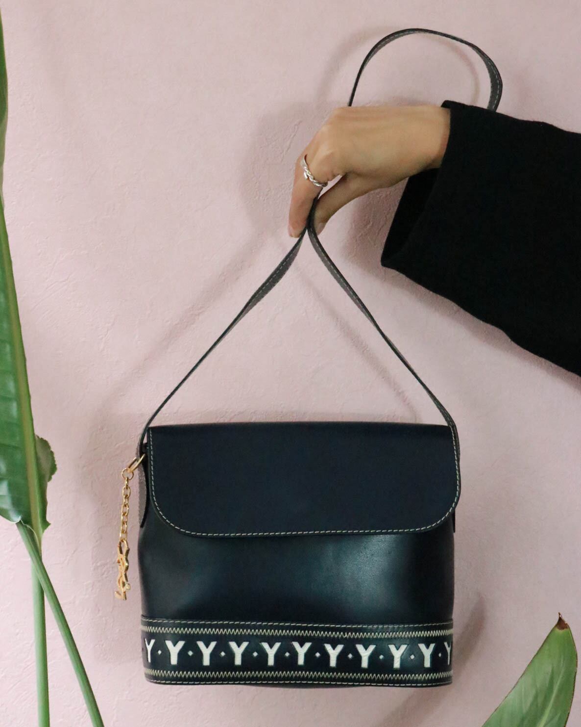 ブランド頭文字"Y"のカットワークとステッチがエッジを効かせたデザイン。