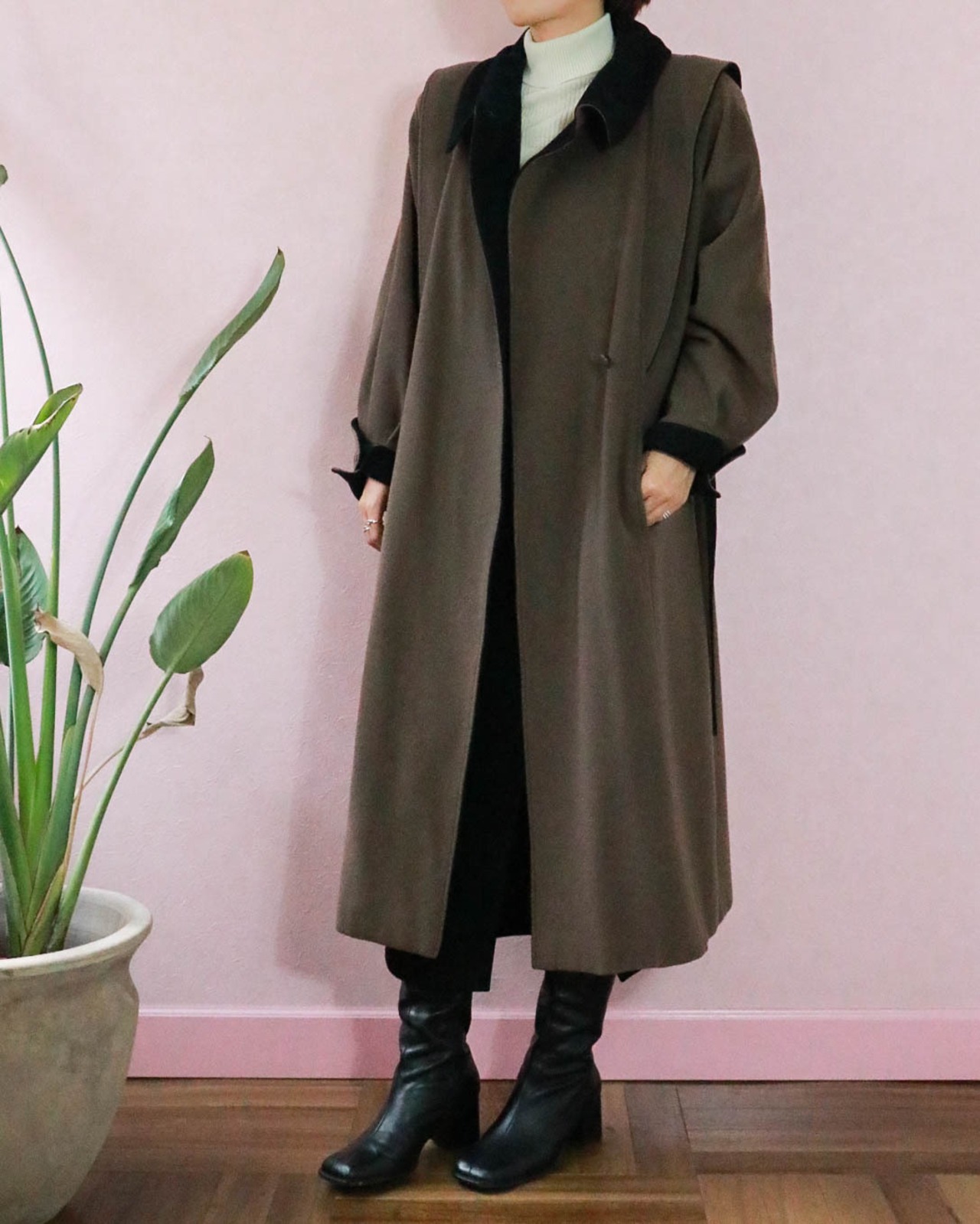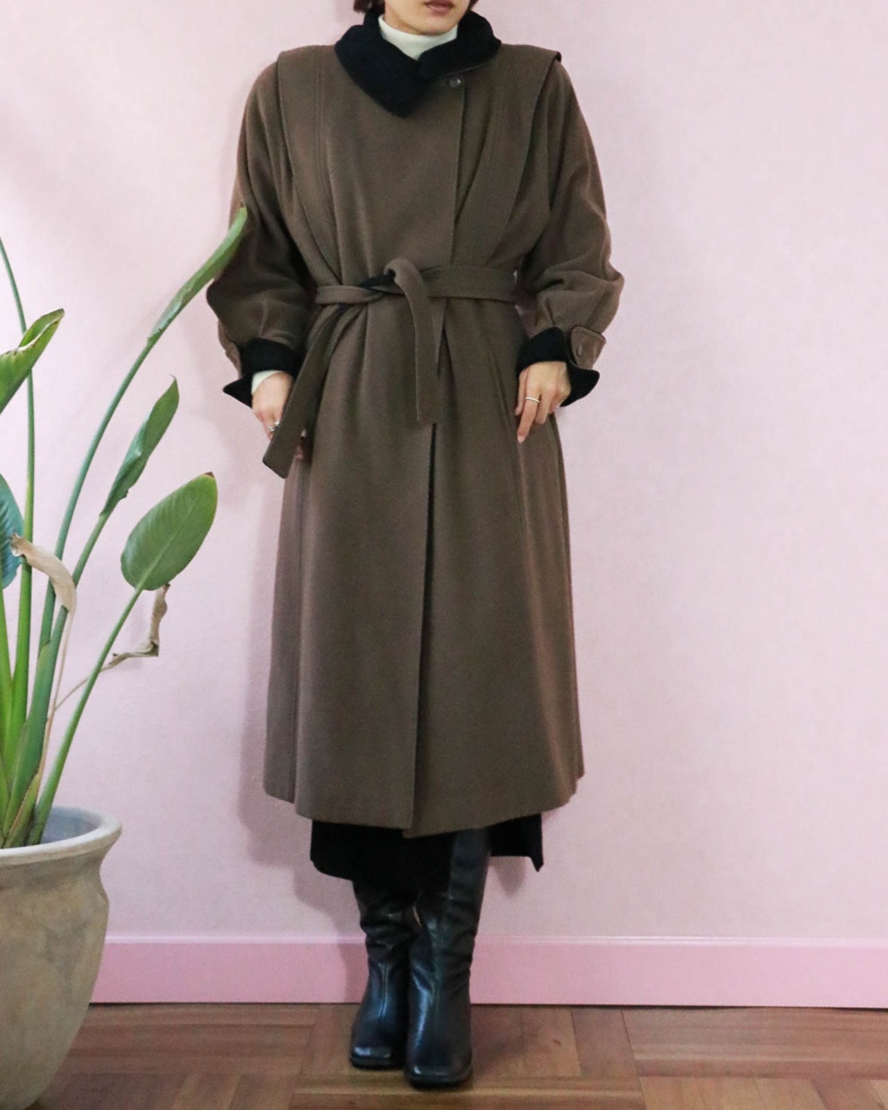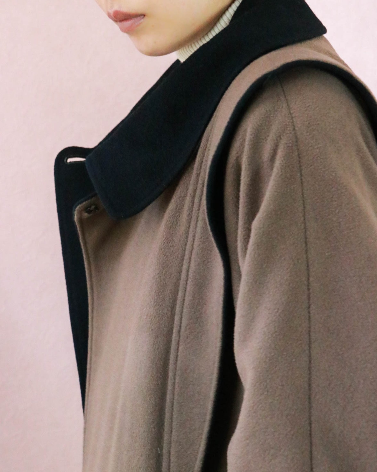 絶妙な配色のこちらのコートもそのひとつ。ショルダーやカフの切り替えから覗くブラックが品あるアクセントになっていて、もったりしがちなコートをエッジーにみせます。