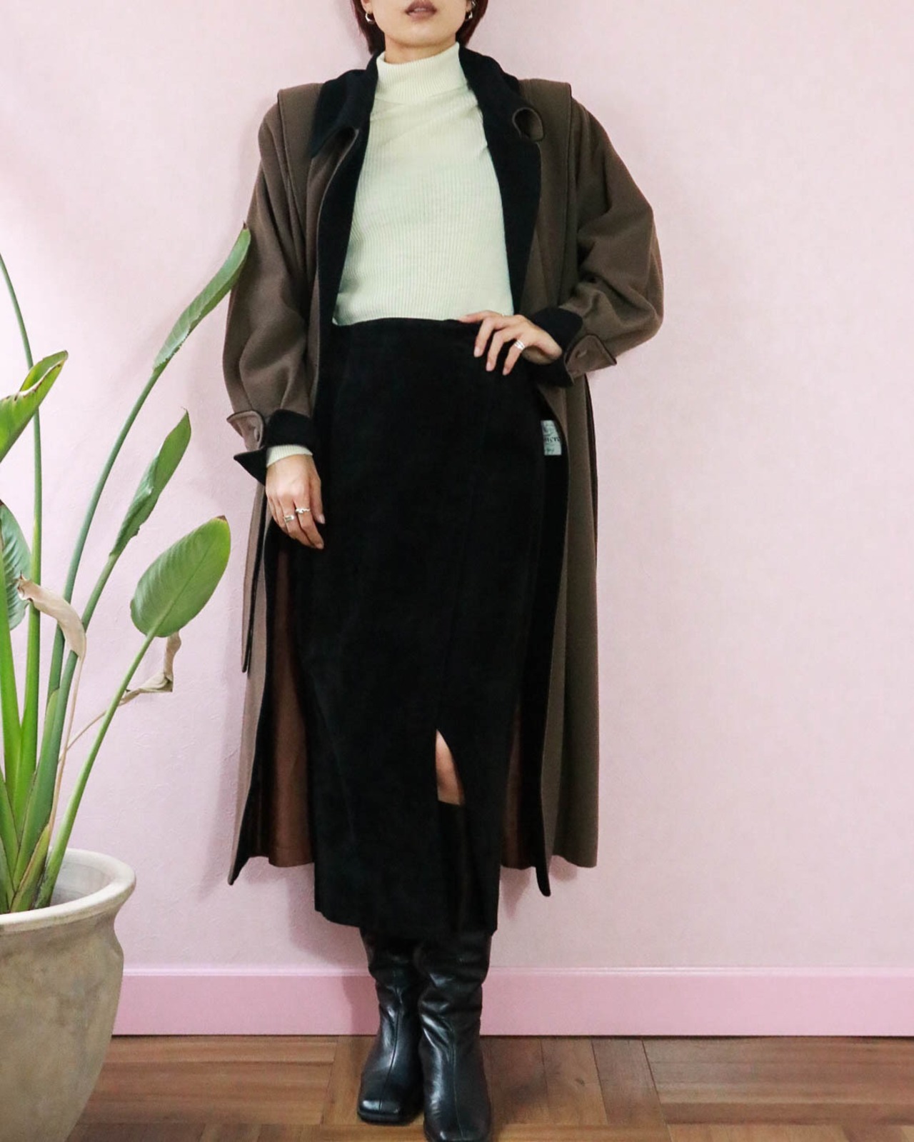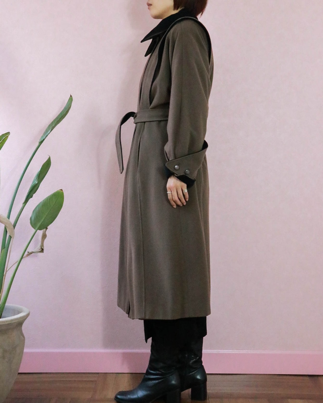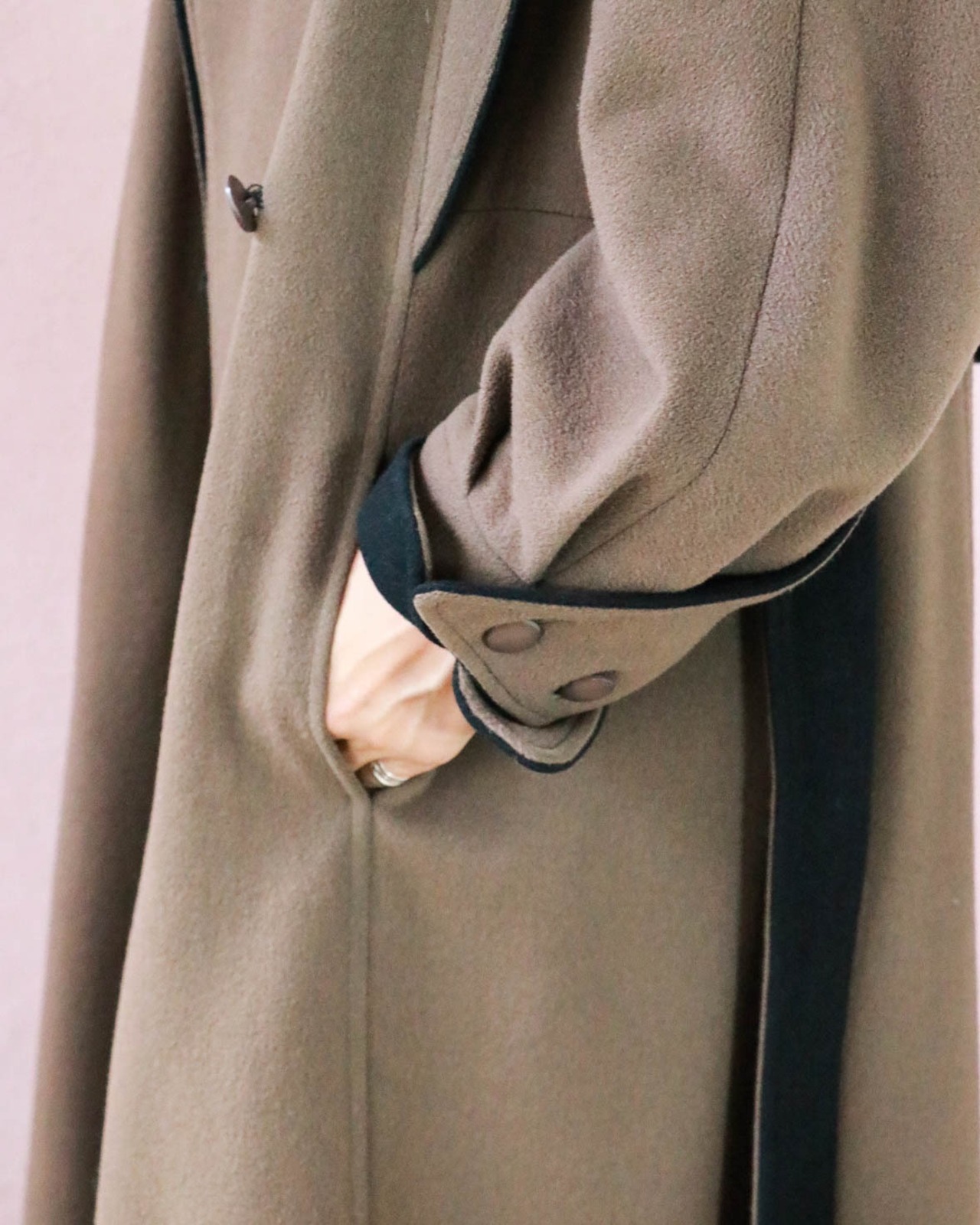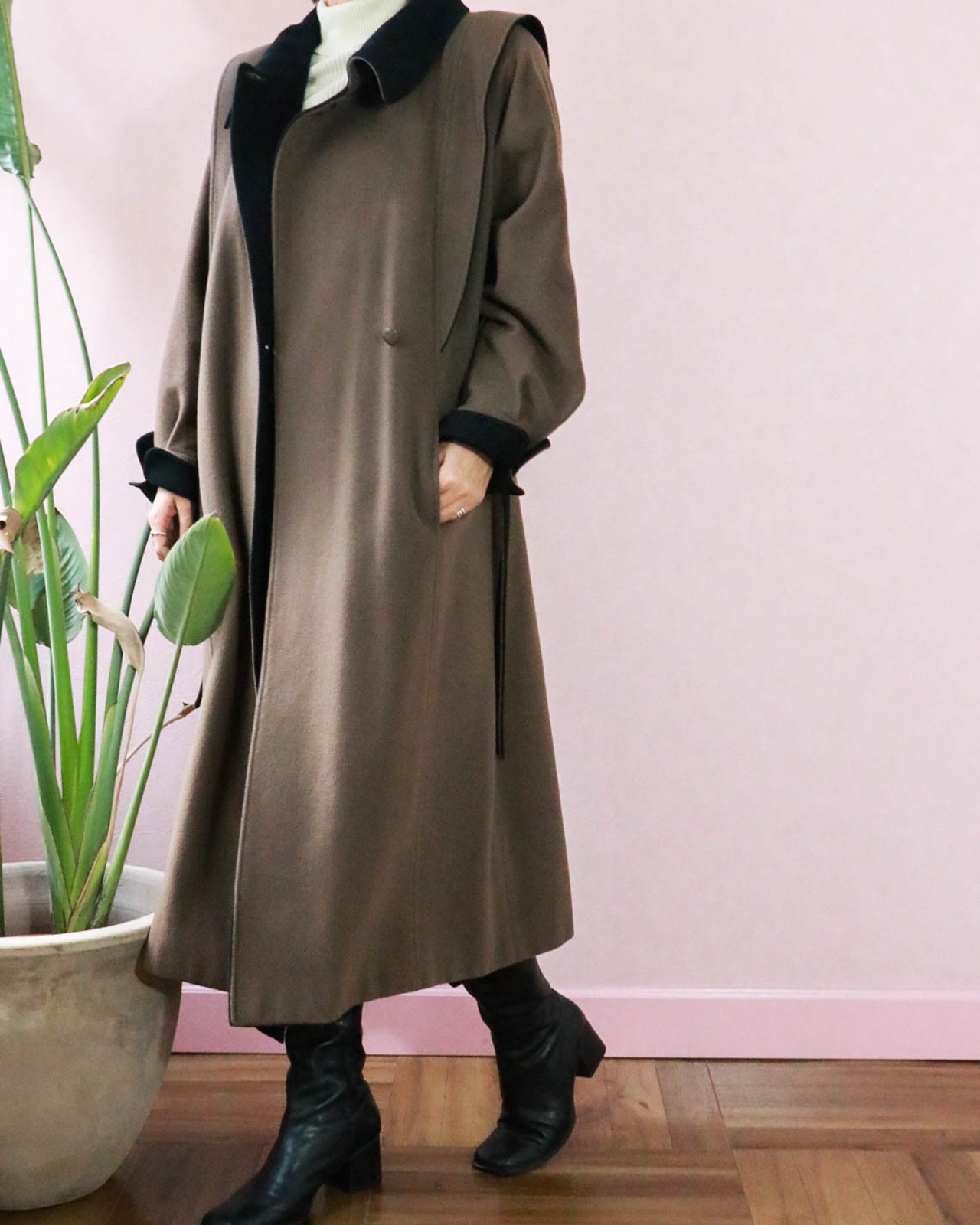 絶妙な配色のこちらのコートもそのひとつ。ショルダーやカフの切り替えから覗くブラックが品あるアクセントになっていて、もったりしがちなコートをエッジーにみせます。