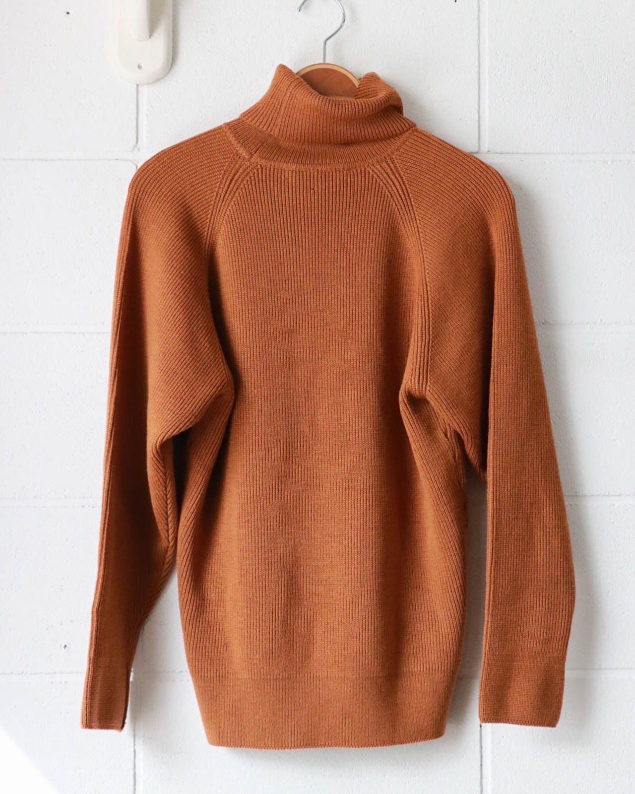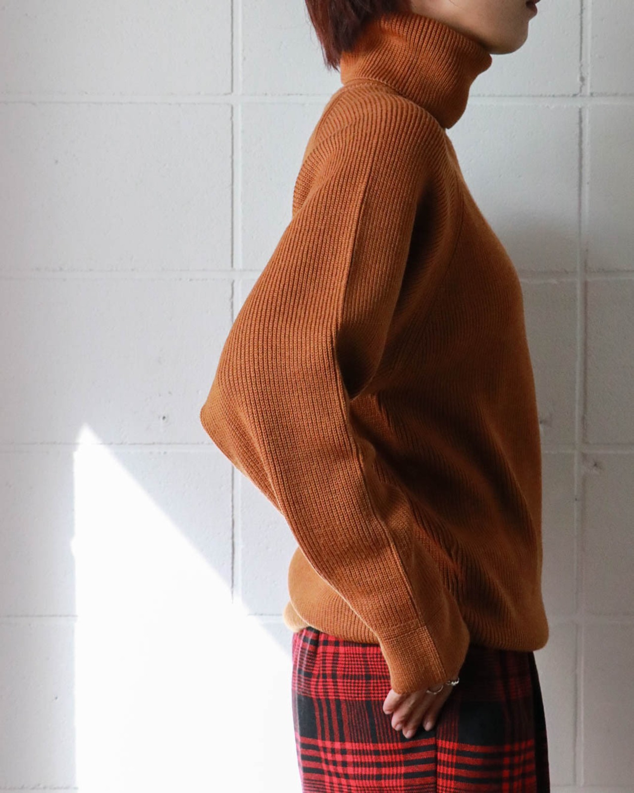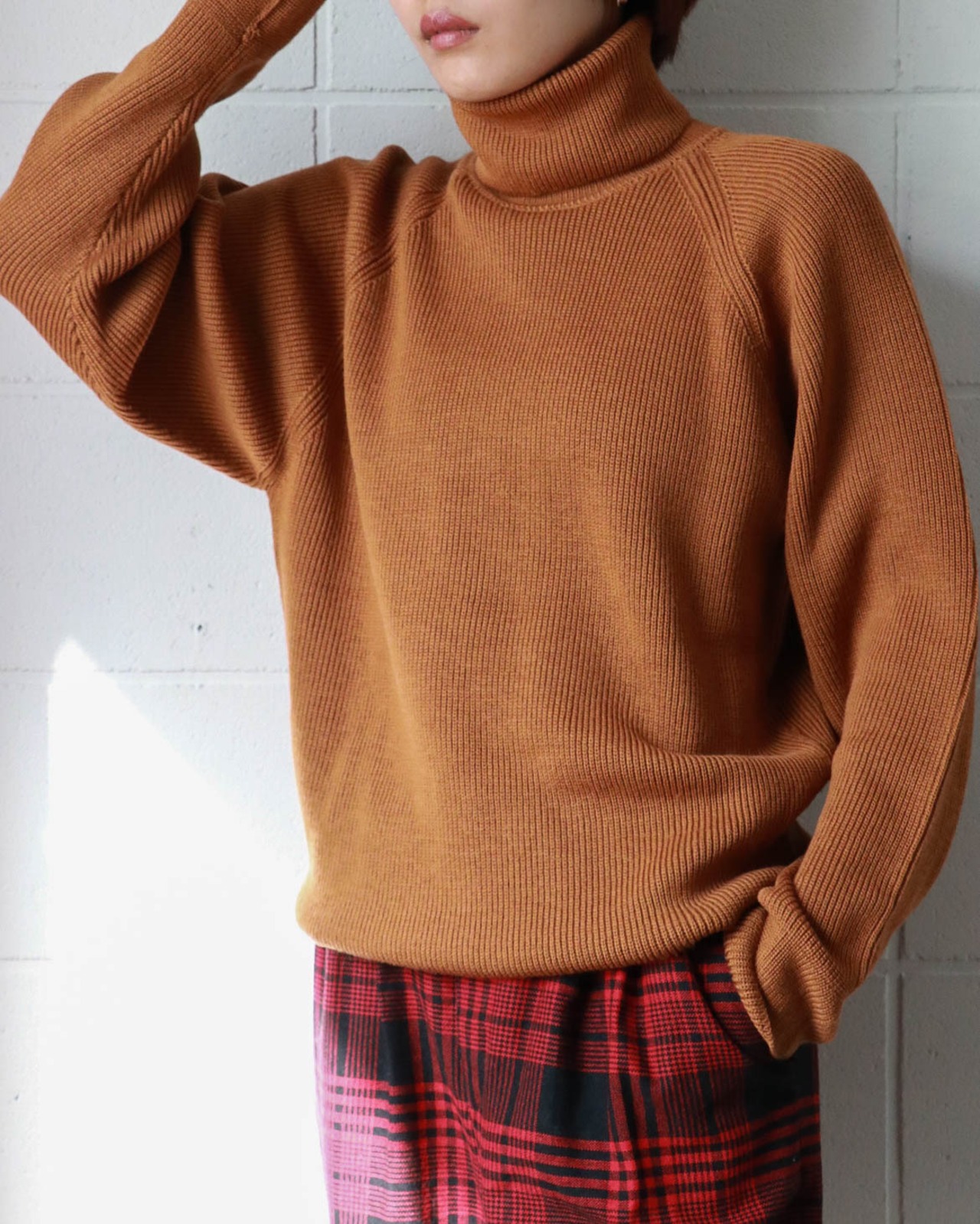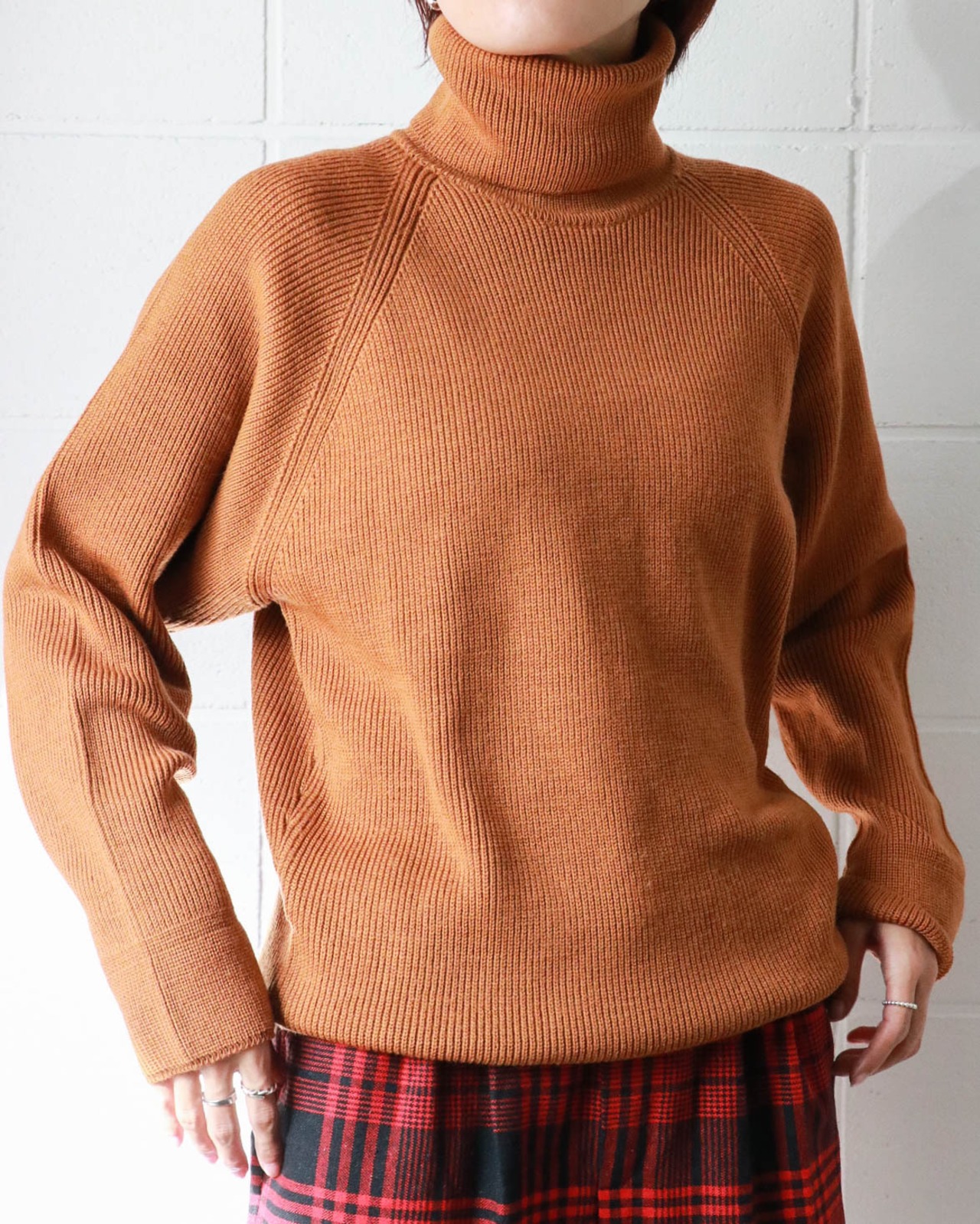 入荷したてのディオールのタートルネックセーターはこれからの寒いシーズンにかちっとはまるやさしいブリックカラー。表記はないですがウール素材とハイゲージで寒さにも心強い。