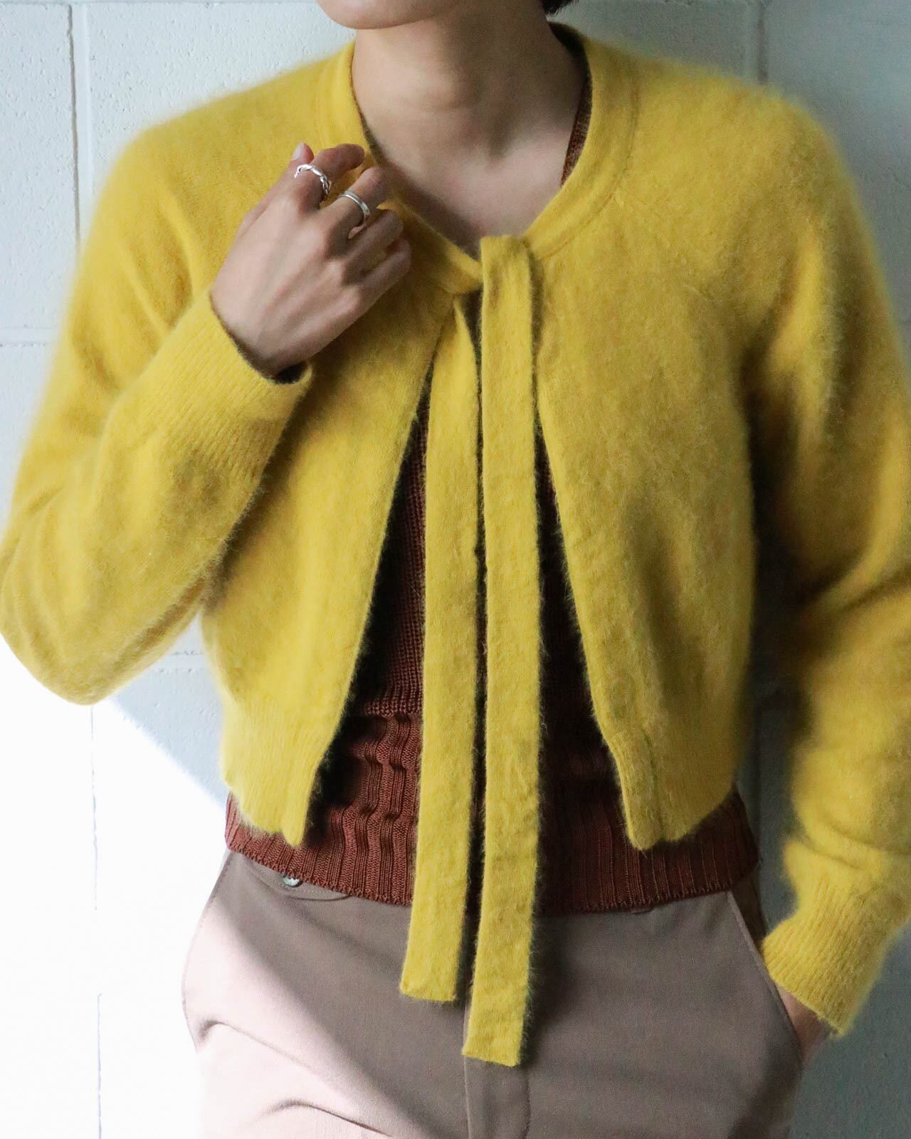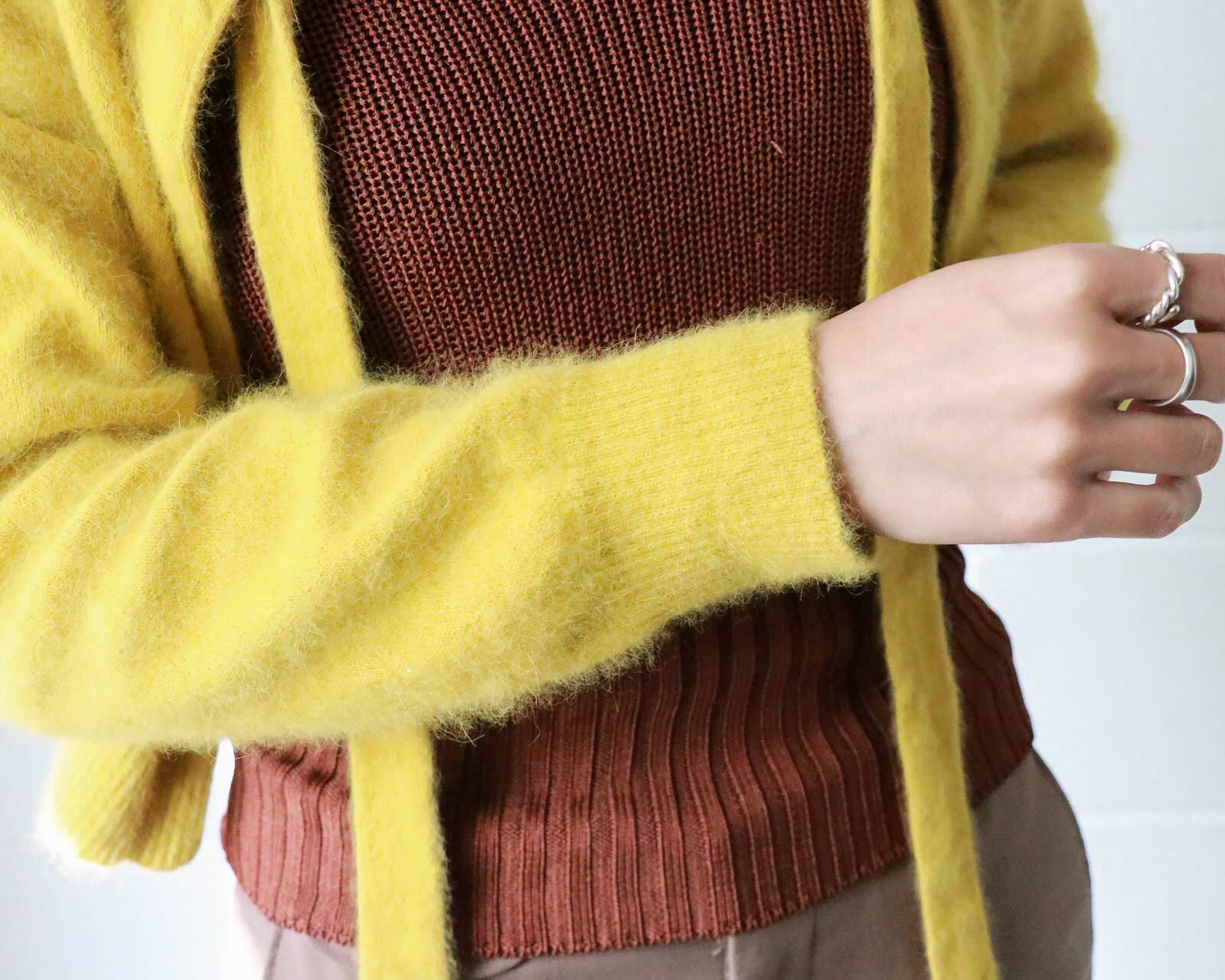 襟が付いてない羽織はインナーと合わせやすいので、中はタートルネックのにっとやブラウスなと合わせたり、ウエストラインを楽しめる丈感なのでボトムズはハイウエストのパンツやスカート、ワンピースにさっと羽織るだけでも、イエローカラーが女性らしさを引き出してくれます!ダークカラーになりがちな秋冬ファッション、上品な色合いと素材で季節感をお楽しみください!!