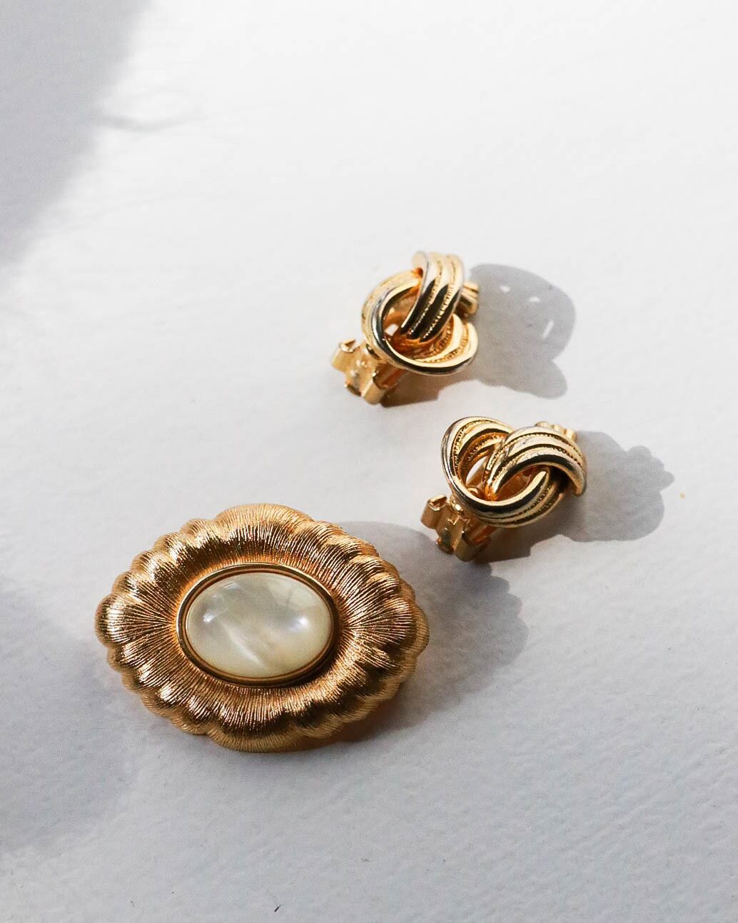 顔周りにモードなエッセンスを添えるゴールドイヤリング。