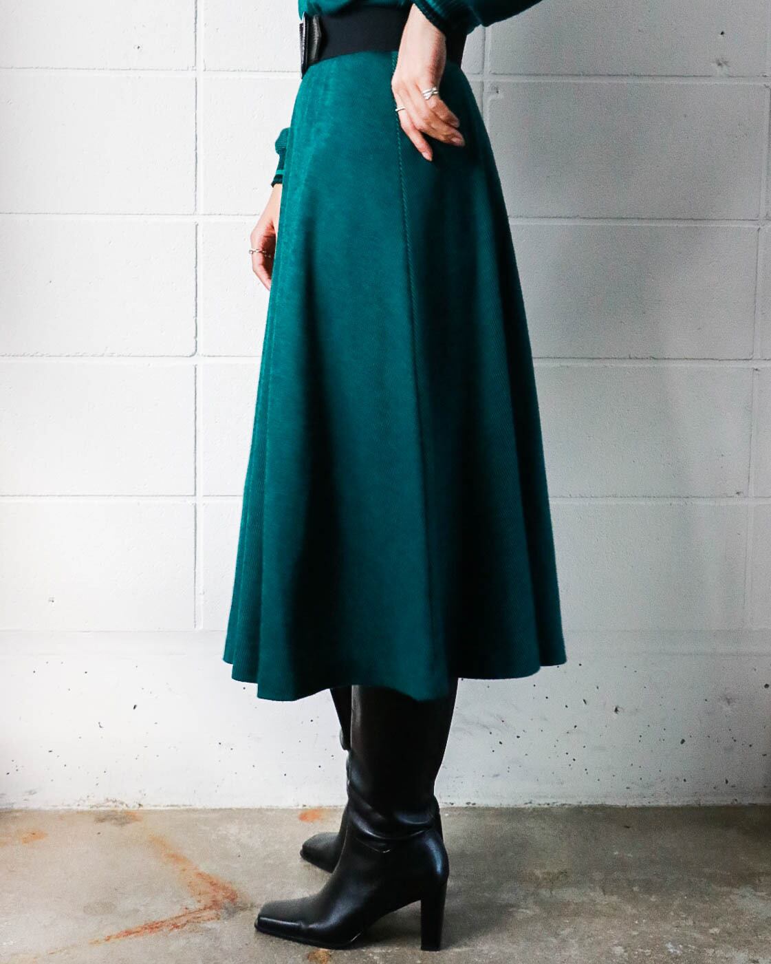 1980年代ブルーグリーンの色味に目を惹かれるニットワンピース。リラックスできるニット素材とドルマンスリーブの緩やかさにきっちり感も出るベルトセットでコーディネートに悩む必要もなく多忙な現代女性のニーズに合う一着。再熱しているミドル丈は今年トレンドのロングブーツと相性抜群。