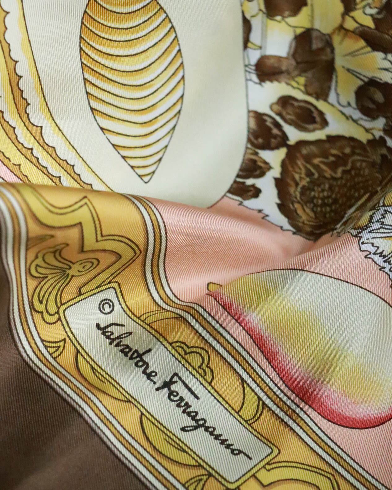 広げてみると猿と虎が合戦している様な模様が印象的なこちらスカーフ はFerragamoのもの