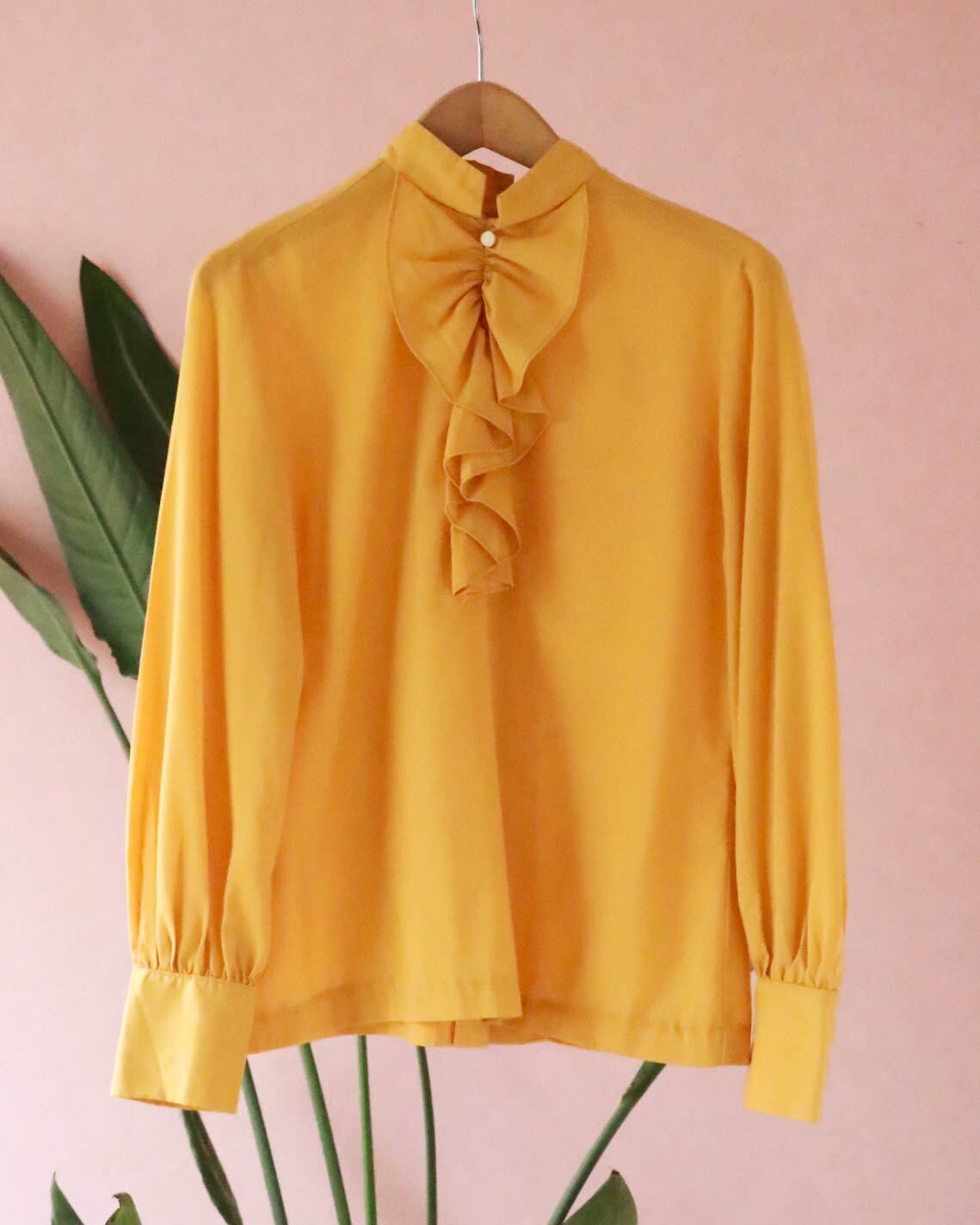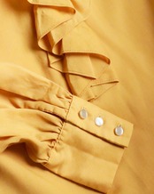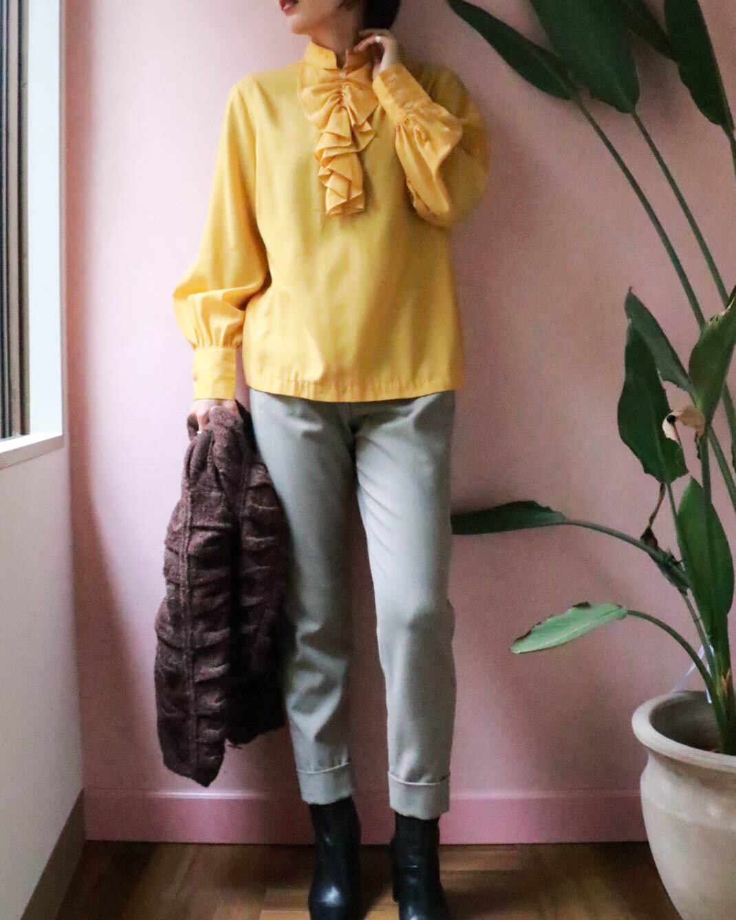 こちらは、軽やかな素材にフリルが華やかなアクセントを添え、大人フェミニンな仕上がりに。