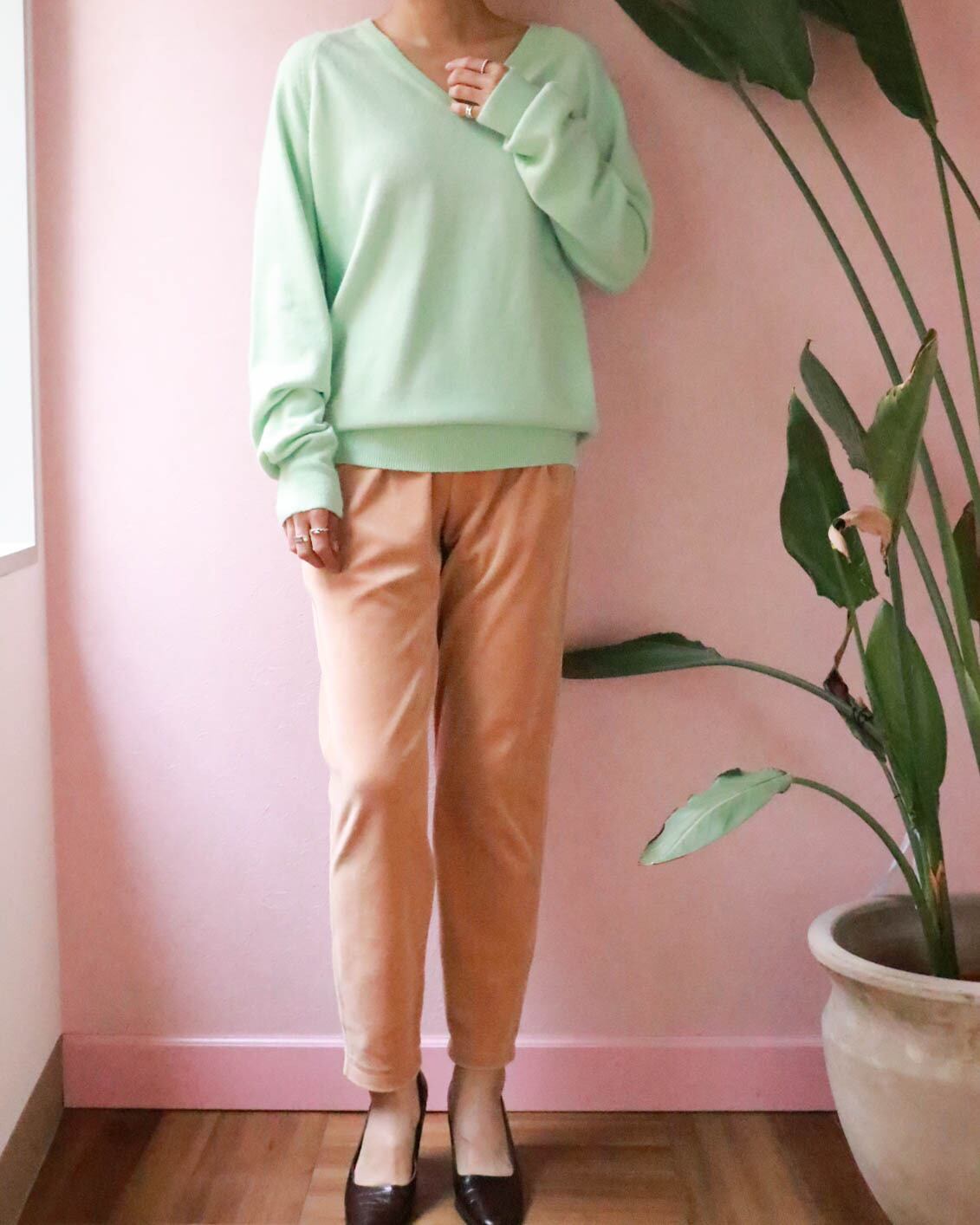ゆるっとしたシルエットにVネックが全体をスッキリとまとめ、大人の色香が漂います。