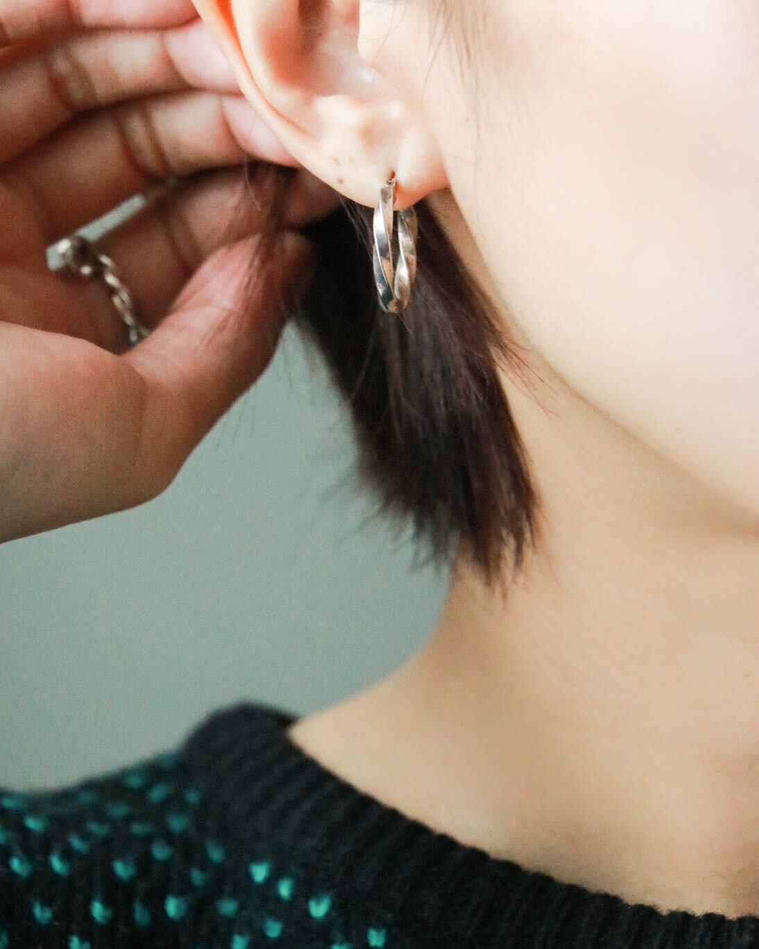 耳元で上品に輝くsilverピアス。