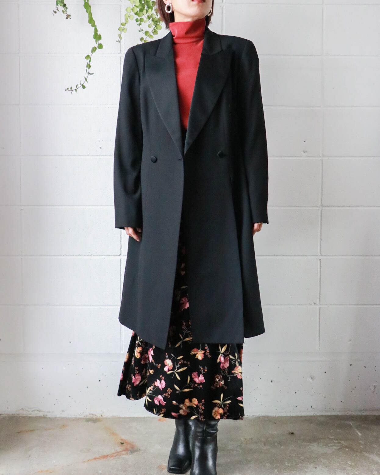 ガッチリし過ぎない肩パッド入りの首元のラペル部分がサテンの切り替えになったダブルボタンのミニマルデザイン。薄手でもウール100%素材で裏地がしっかりと付いた実用性のあるディテール。シーンを問わず活躍できますが、とくに冬は室内で羽織れるアウターをお探しの方におすすめです!!