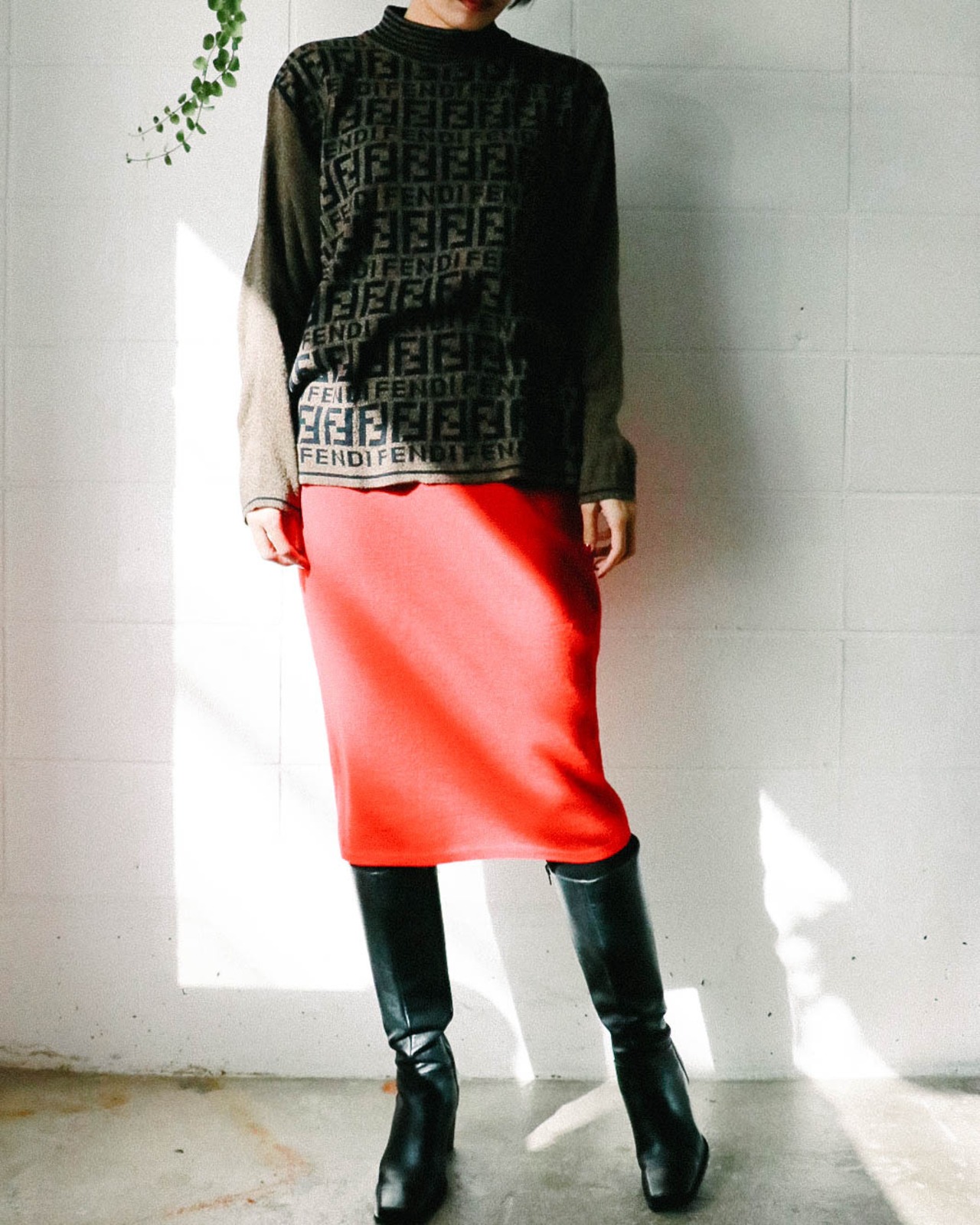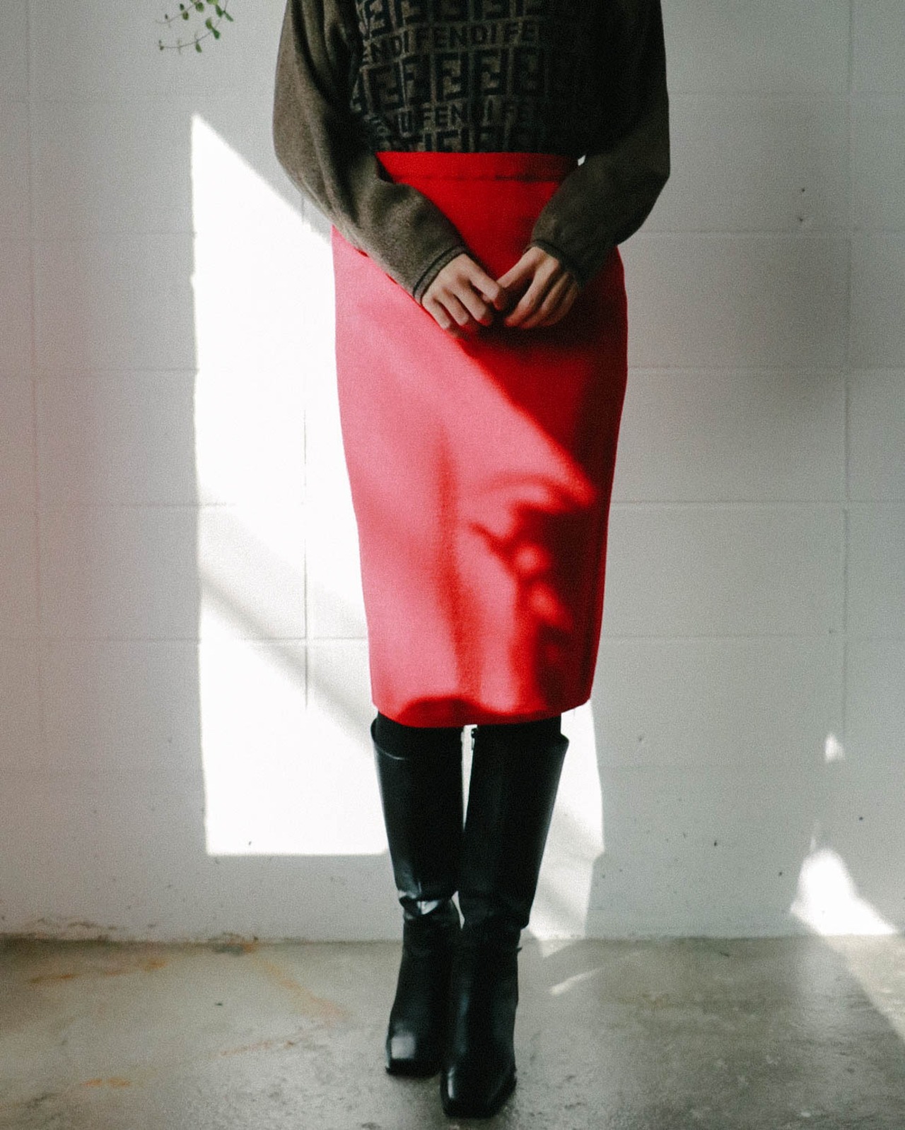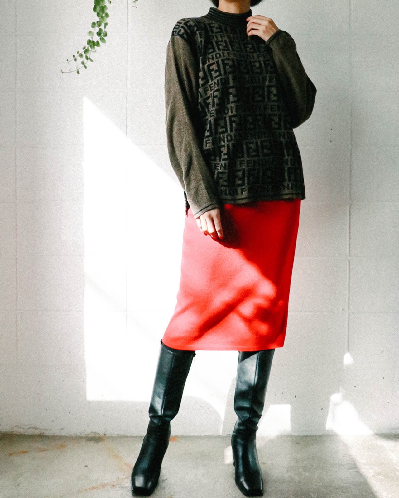 黒できゅっと足元を引き締めるのもいいですが、是非赤系ブーツとの組み合わせもおすすめしたい。