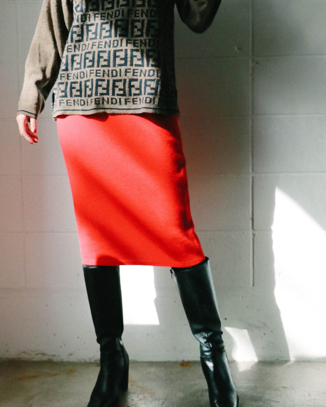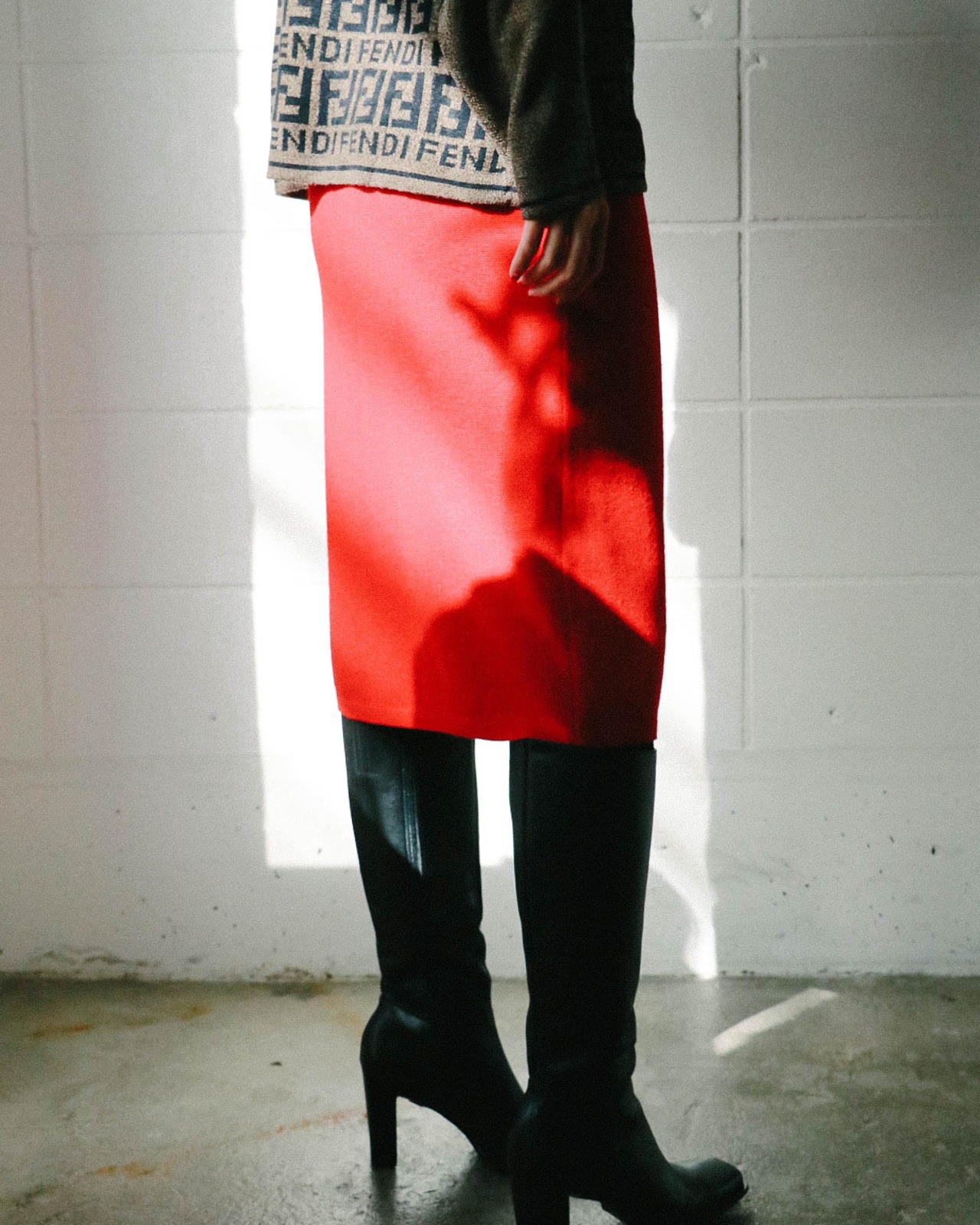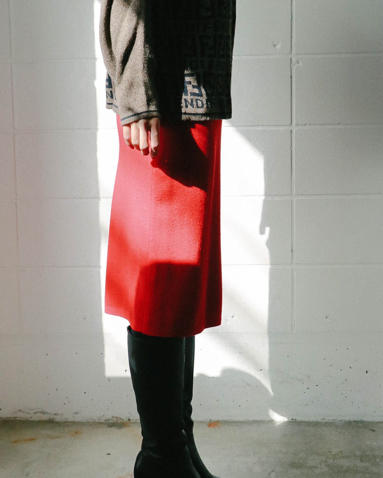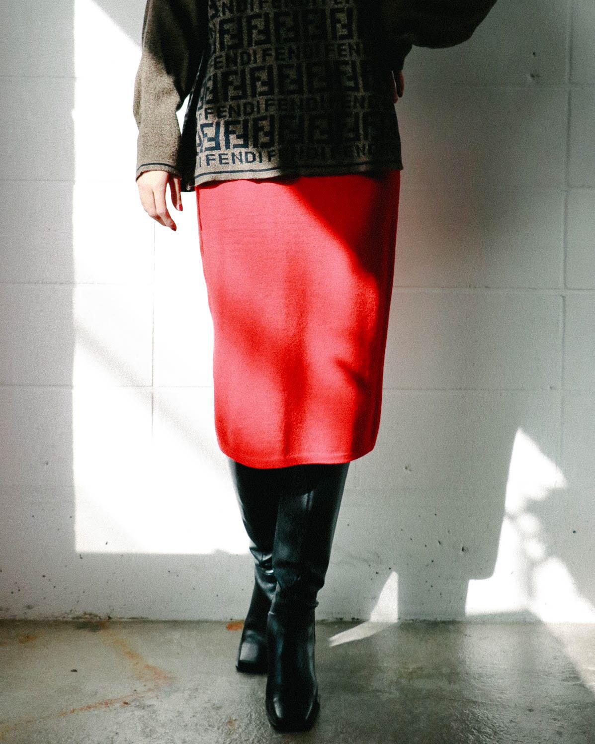 黒できゅっと足元を引き締めるのもいいですが、是非赤系ブーツとの組み合わせもおすすめしたい。